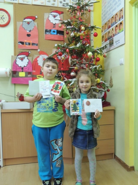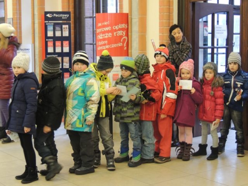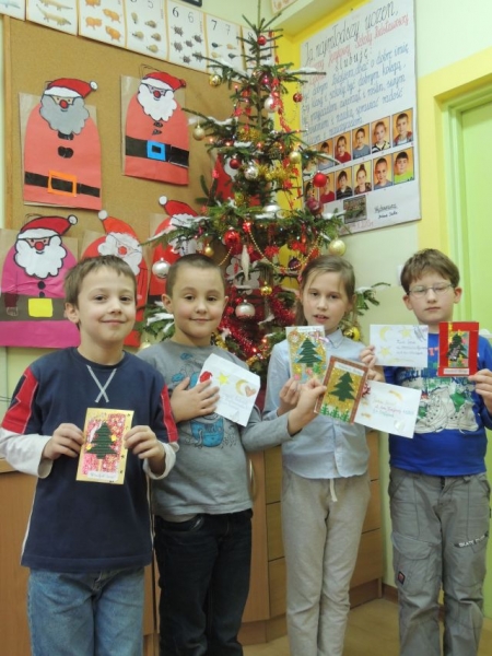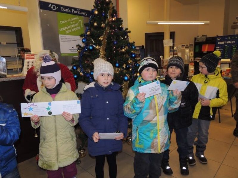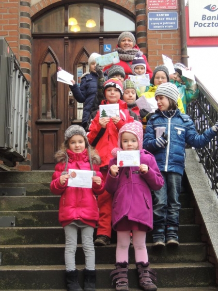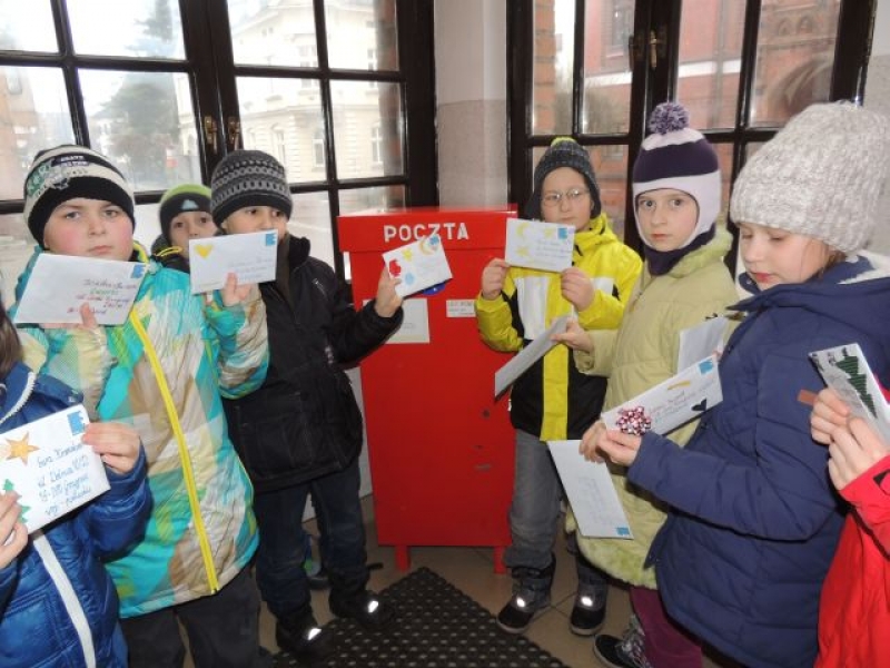 Dzieci z klasy Ib wykonały samodzielnie przepiękne kartki bożonarodzeniowe. Następnie ułożyły i napisały świąteczne życzenia, aby wysłać je do rodziny czy znajomych. Pierwszaki miały okazję poćwiczyć adresowanie kopert. Tak przygotowane kartki zostały dzisiaj wysłane. Dzieci odwiedziły Pocztę Główną w Lęborku, co sprawiło im wielką frajdę.