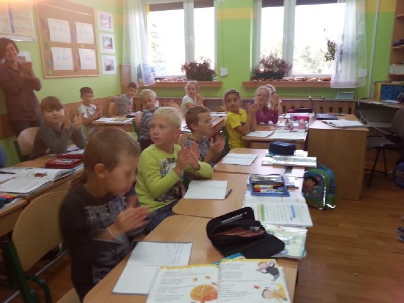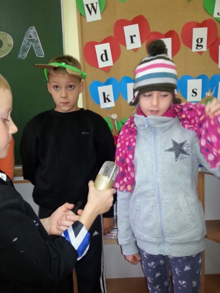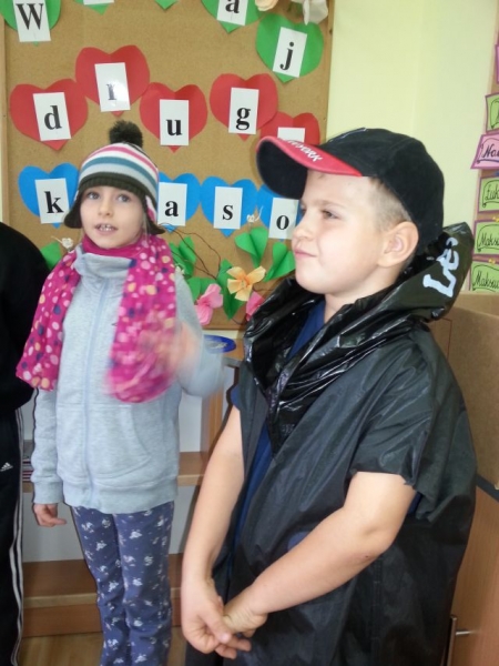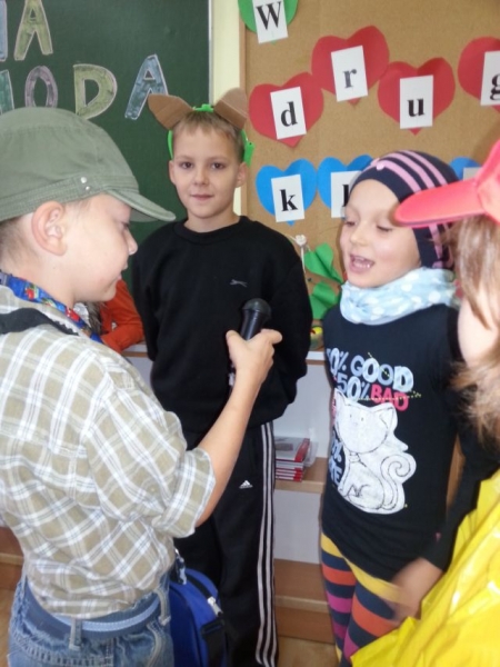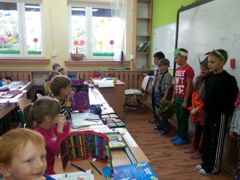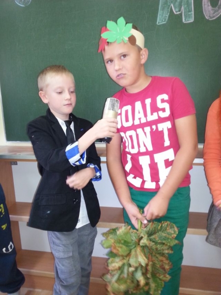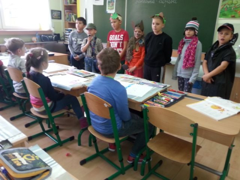 Uczniowie klasy IIa przygotowali dla kolegów i koleżanek z klas pierwszych, drugich i trzecich miłą niespodziankę. Początkowo nieśmiało, później z coraz większym zapałem wystąpili z teatrzykiem „Jesienna moda. Przebrani w stroje własnego pomysłu zaprezentowali hity sezonu jesiennego: kalosze, płaszcze, futerka, szaliki i czapki. Młodzi aktorzy zwrócili widzom uwagę na odpowiedni strój, w jaki należy się wyposażyć o tej porze roku. Przebrani za zwierzęta leśne (wiewiórki), domowe (psy) oraz rośliny (kasztanowce) przypomnieli, że zmiany dotyczą zarówno ludzi jak i przyrody. Krótkie, ale wesołe przedstawienie spotkało się z sympatycznym przyjęciem uczniów naszej szkoły, za co serdecznie dziękujemy!
