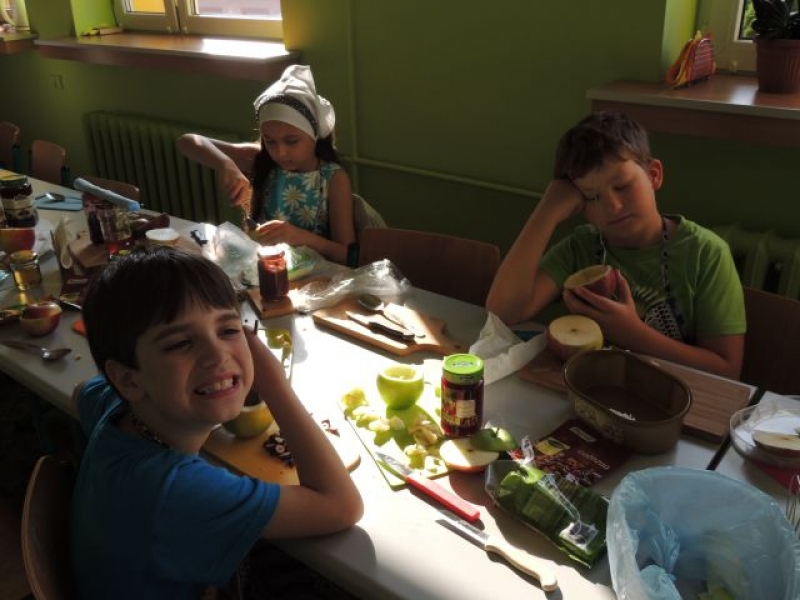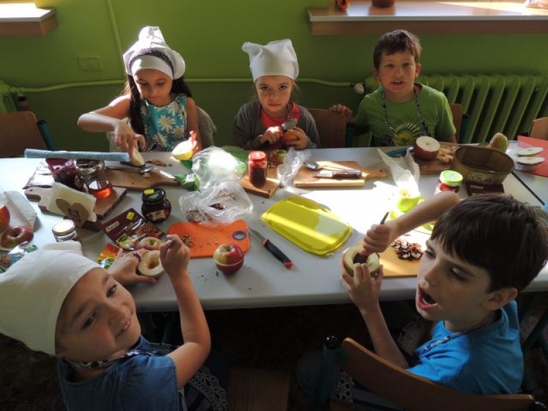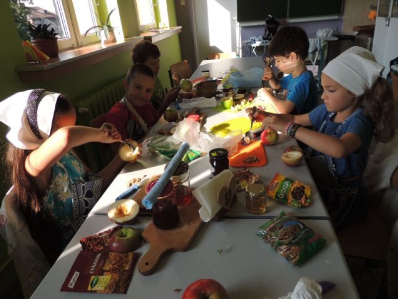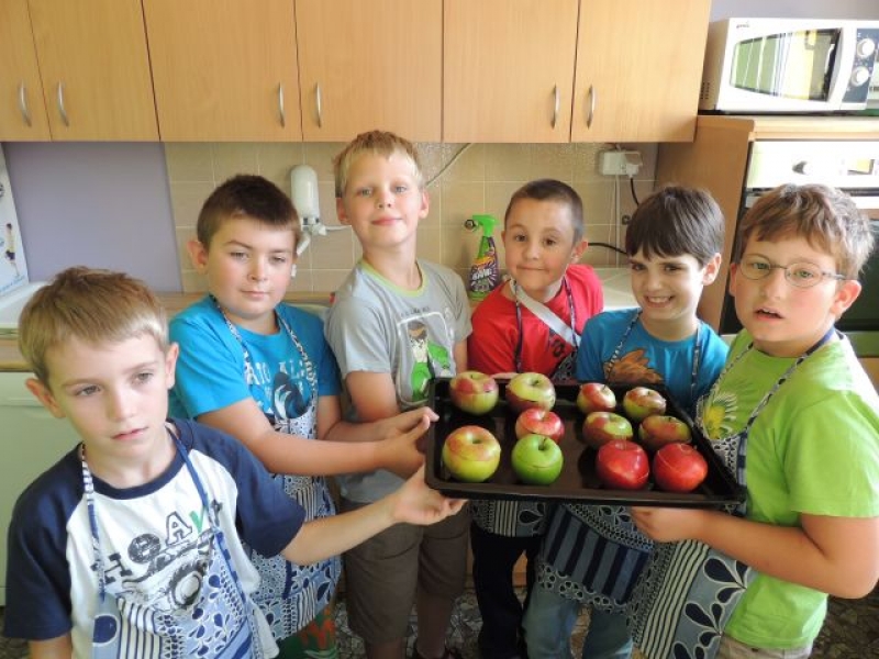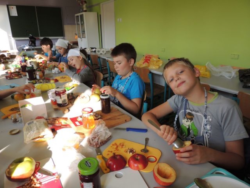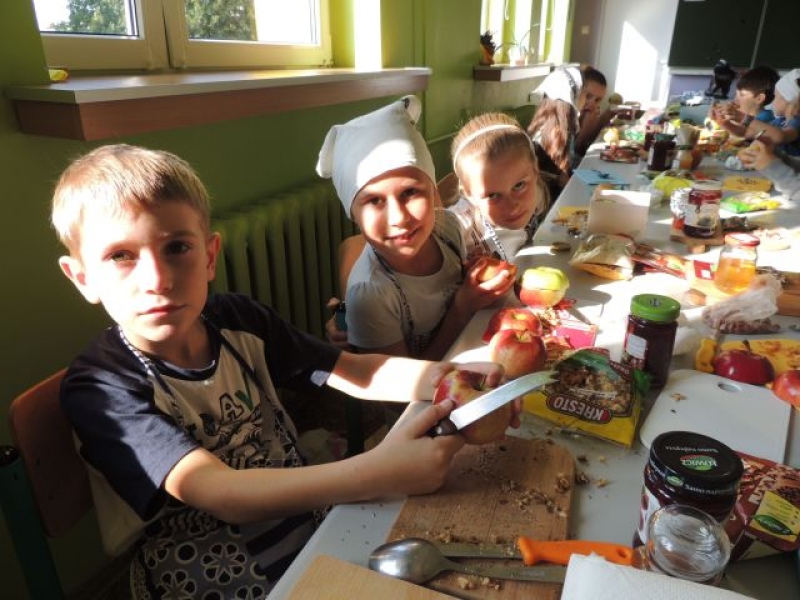 We wrześniu dzieci z klasy IIb na zajęciach kulinarnych przygotowały zapiekane jabłka z …niespodzianką. Zadaniem uczniów było wydrążenie jabłka i napełnienie go takimi specjałami, jak: orzeszki, konfitura i miód oraz aromatycznymi goździkami i cynamonem. Był to pyszny i zdrowy deser.