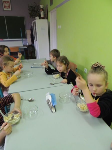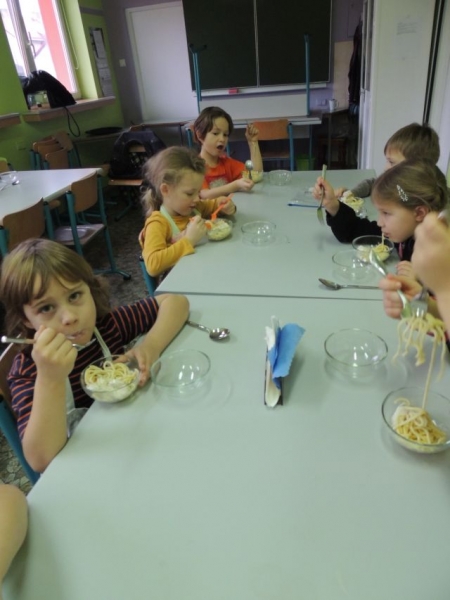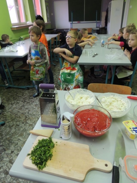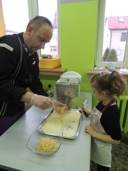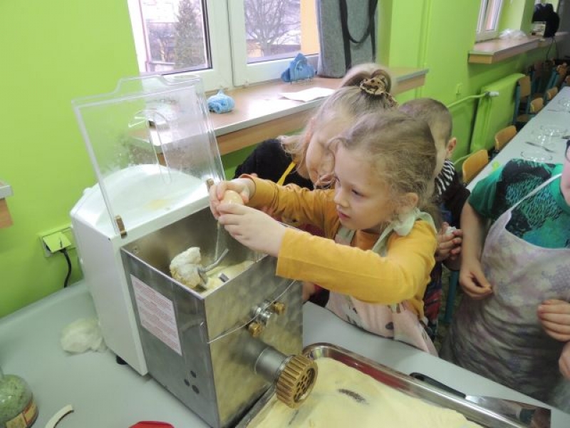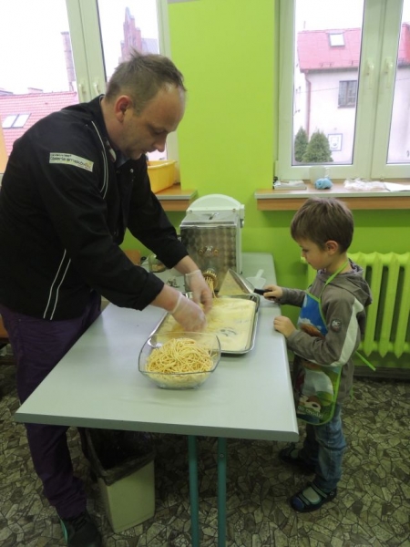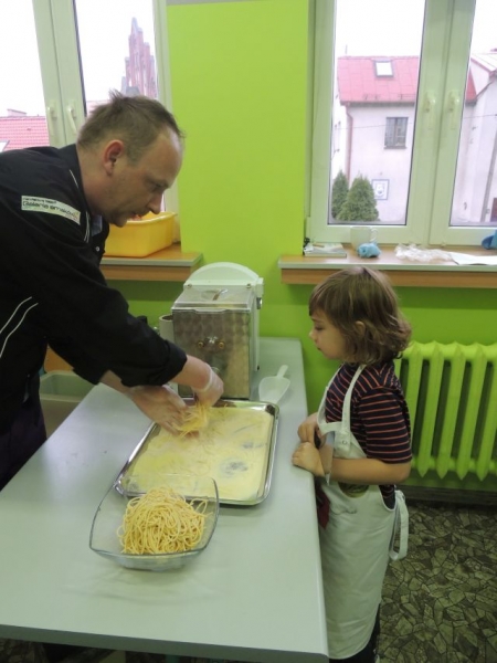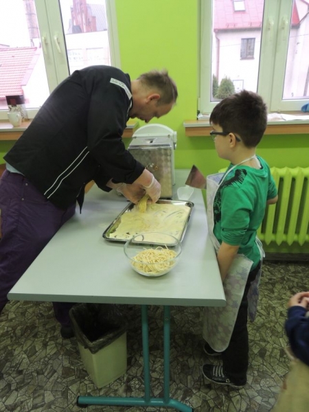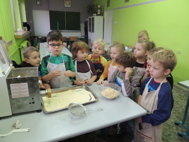 Klasa Ia podczas, kolejnych już w tym roku szkolnym, zajęć kulinarnych wykonała „domowej roboty” makaron. Naszą klasę odwiedził tata jednej z uczennic Pan Maciej Jastrzemski i wspólnie z dziećmi przygotował przepyszne dania. Pan Maciej z pełnym profesjonalizmem pokazał nam jak przygotować zdrowy i smaczny posiłek. Do szkoły została przywieziona specjalna maszynka do ugniatania ciasta, która jednocześnie służyła do wytwarzania różnych gatunków tego włoskiego przysmaku. Dzieci były zachwycone możliwością uczestniczenia w tak nietypowych zajęciach.