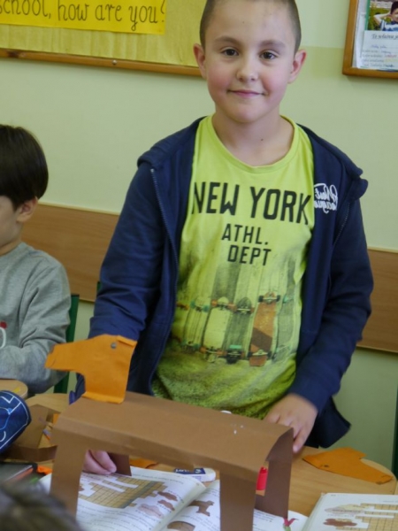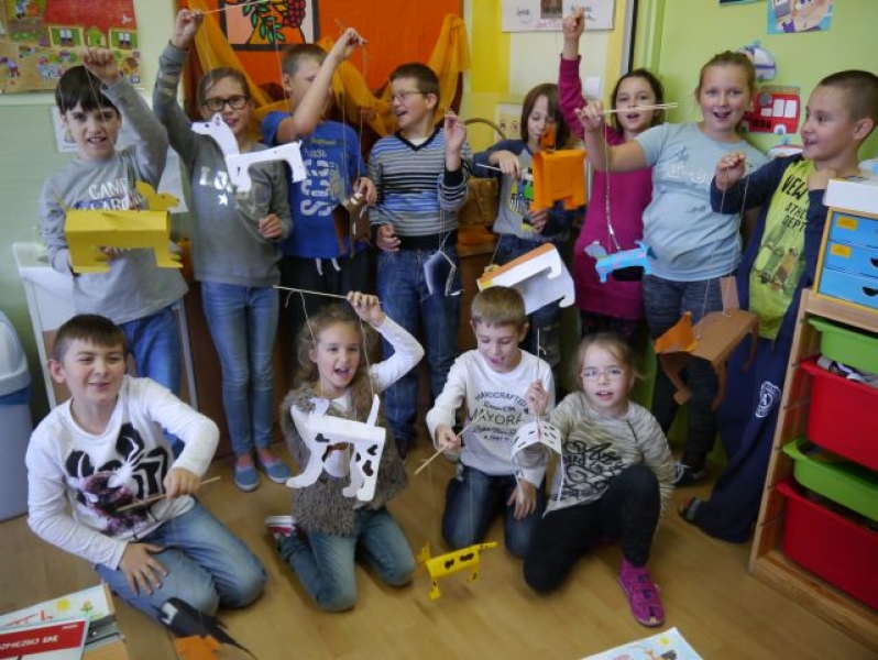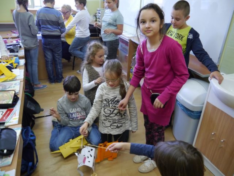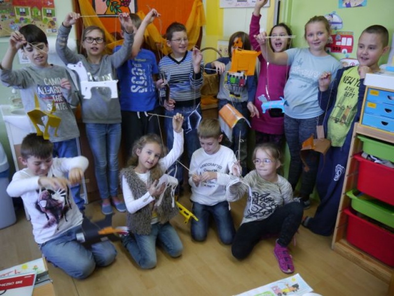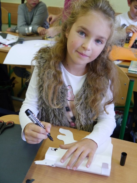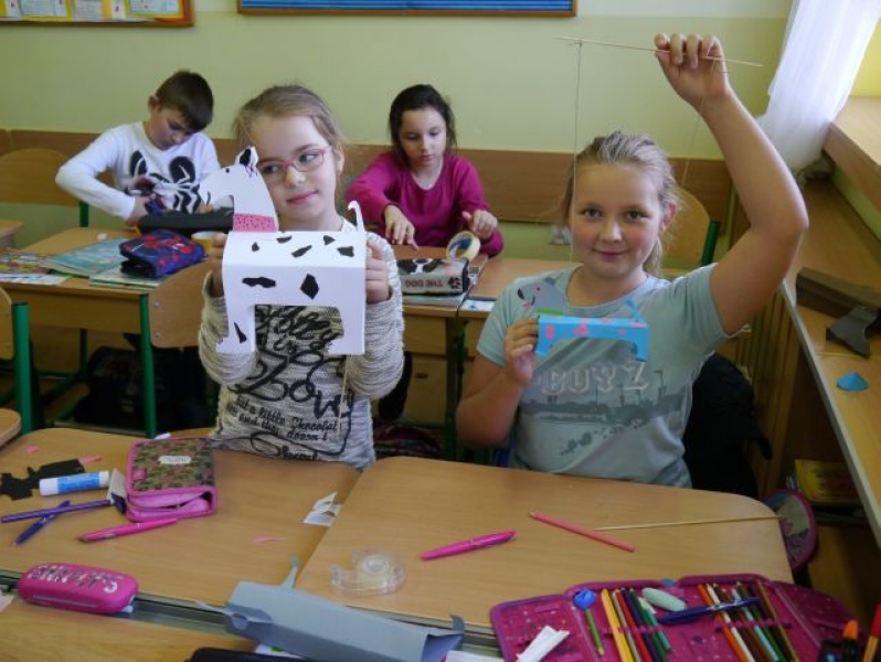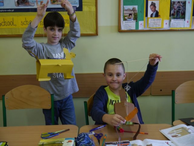 Uczniowie klasy IIIb na podsumowanie omawiania lektury pt.: „Puc, Bursztyn i goście” wykonali papierowe sylwety psów, do których doczepili sznurek i w ten sposób powstały marionetki. Dzieci „wcieliły się” w role piesków – bohaterów lektury – i wykorzystały wykonane marionetki do krótkich scenek teatralnych w grupach.