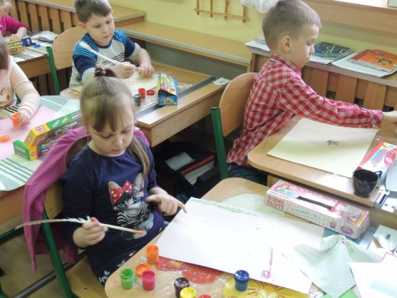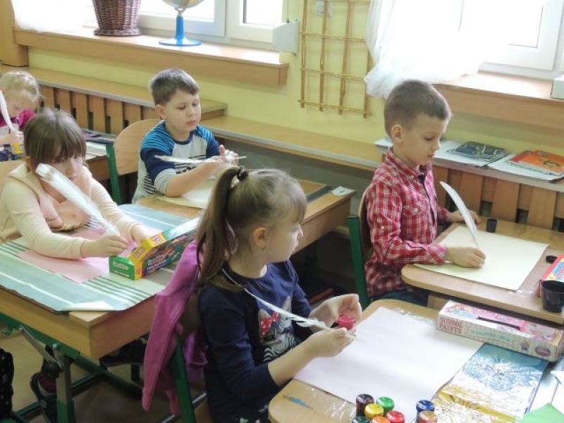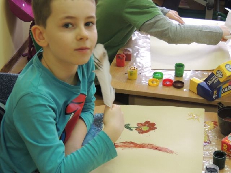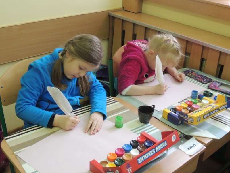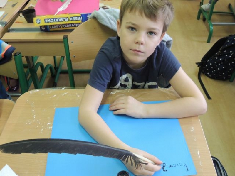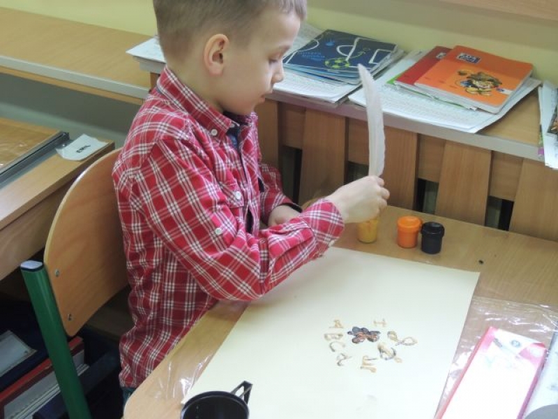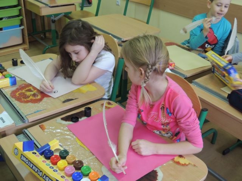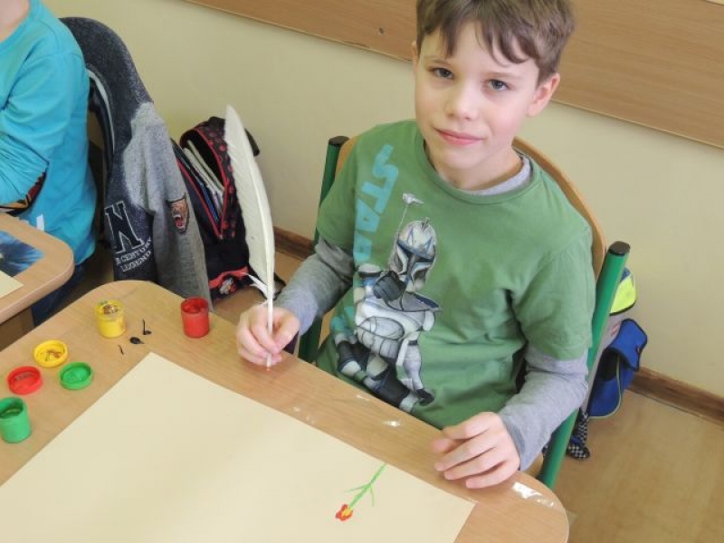 Uczniowie klasy 1b mieli okazję uczestniczyć w nietypowych zajęciach malarskich. W ramach lekcji plastyki, dzieci próbowały malować piórami. Tematem przewodnim była wiosna albo literowe zabawy. Dzieci z wielkim zainteresowaniem malowały, używając do tej czynności pióra. To była fantastyczna zabawa.