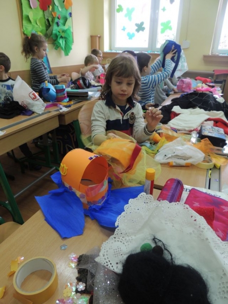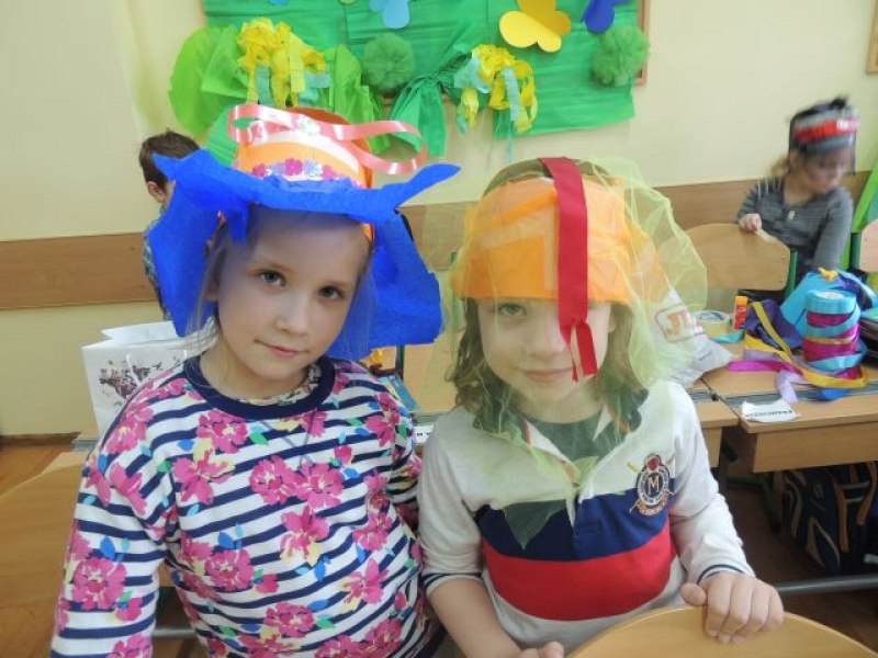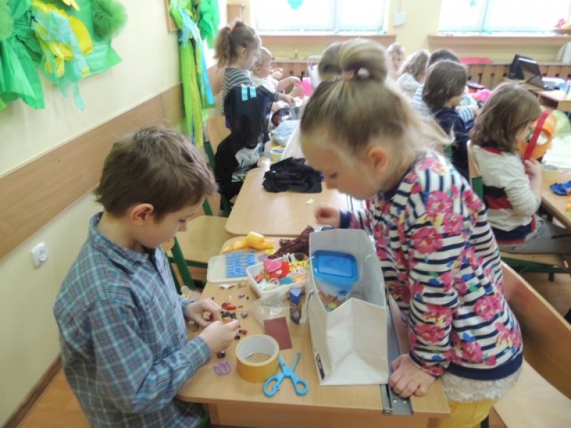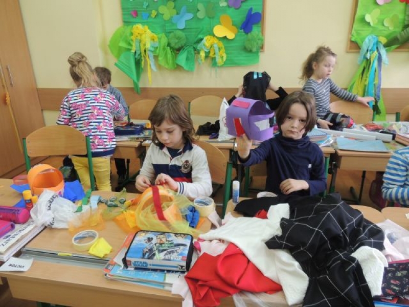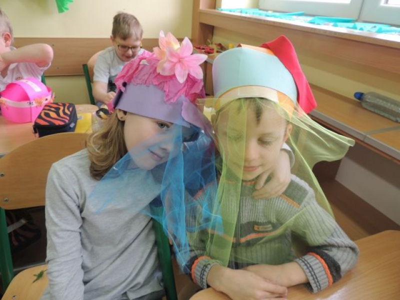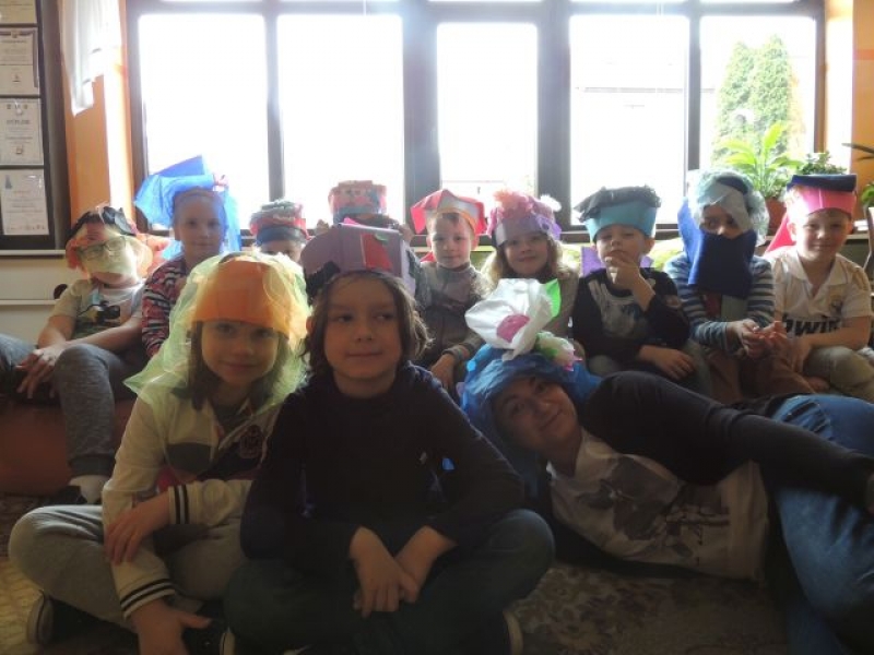 Podczas zajęć plastycznych klasa Ia tworzyła wyjątkowe kapelusze. Uczniowie dostarczyli do szkoły rozmaite dodatki, takie jak: kolorowe ścinki materiałów, tasiemki, guziki, koronki, włóczki, cekiny i inne drobiazgi, które w połączeniu z papierowym stelażem kapelusza dały niesamowity efekt.