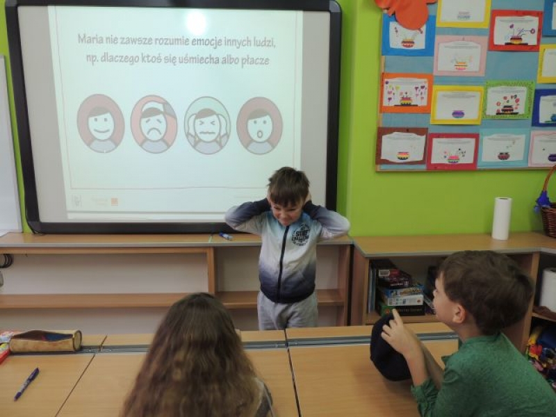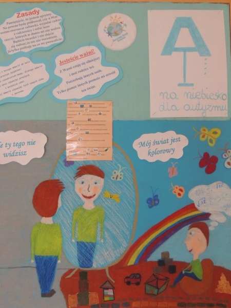 Zespół nauczycieli oligofrenopedagogów przeprowadził w każdej klasie zajęciach dotyczące autyzmu. Z okazji Światowego Dnia Wiedzy na Temat Autyzmu wszyscy uczniowie dowiedzieli się, czym jest to zaburzenie i jakie są jego główne objawy. Uczniowie zapoznali się z filmami, które udostępniła Fundacja SYNAPSIS „Autyzm wprowadza zmysły w błąd”. Filmy doskonale zapoznały uczniów z tematyką autyzmu. Dzieci dowiedziały się, że autyzm powoduje trudności w postrzeganiu świata, uczeniu się, porozumiewaniu i kontaktach społecznych. Ponadto dzieci poznali „Marię, dziewczynkę, która lubi mieć plan”. Na podstawie prezentacji o Marysi uczniowie przyswoili sobie wiele informacji odnośnie niepełnosprawności.