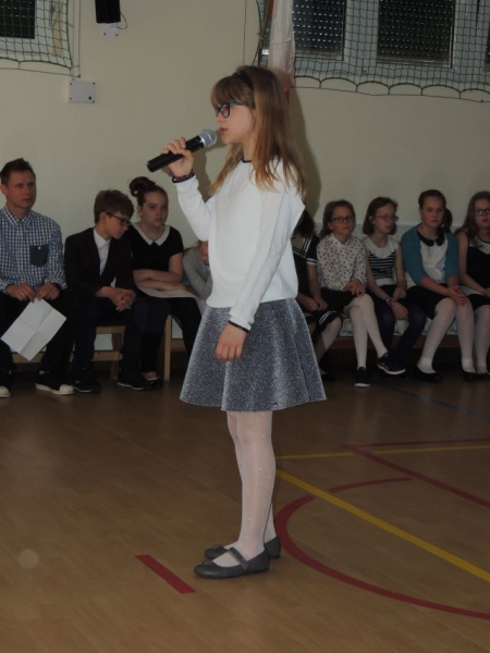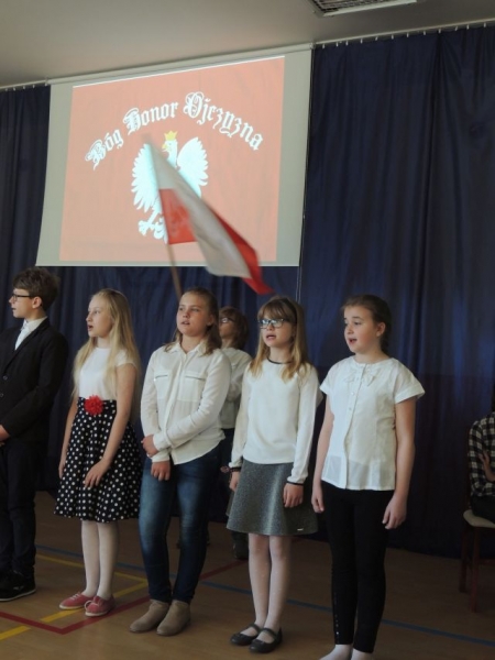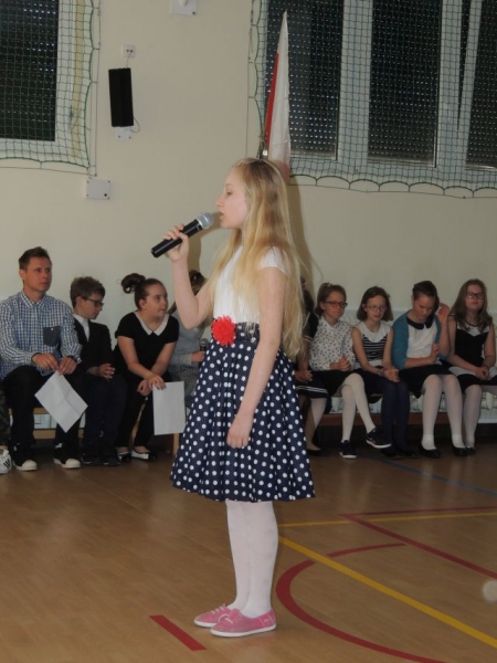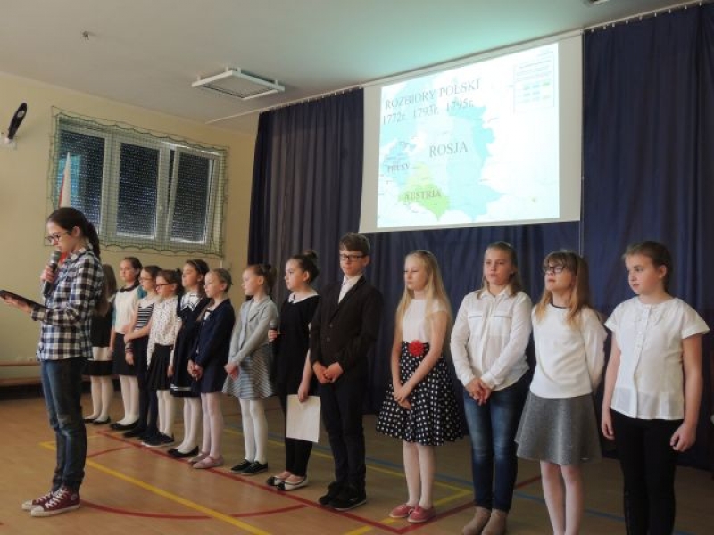 W dniu dzisiejszym odbył się uroczysty apel z okazji rocznicy uchwalenia Konstytucji 3 Maja. Uroczystość przygotowały klasy starsze, którym pięknym śpiewem pomógł chórek pod akompaniamentem p. Nataszy Konopackiej. Celem uroczystości było uwrażliwienie uczniów na losy własnego kraju, narodu, zapoznanie z okolicznościami uchwalenia Konstytucji 3 Maja, kształtowanie postaw patriotycznych oraz poczucia dumy z dokonań przodków, szacunek dla symboli narodowych.