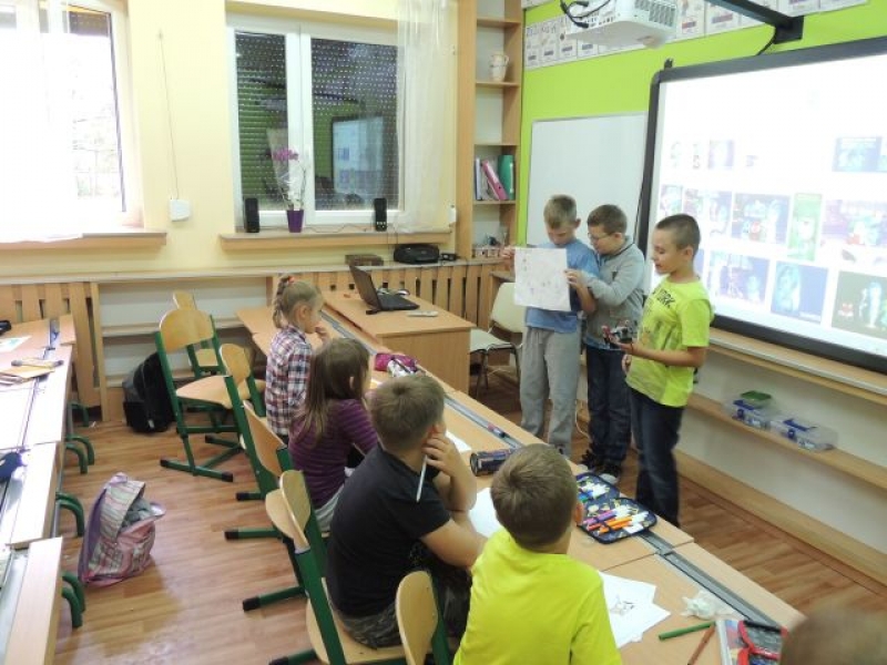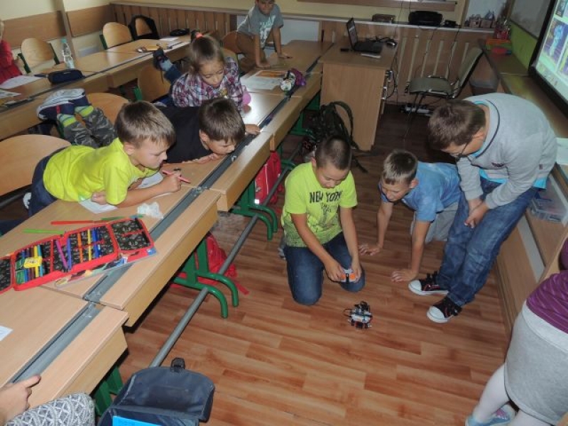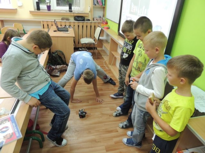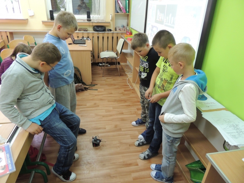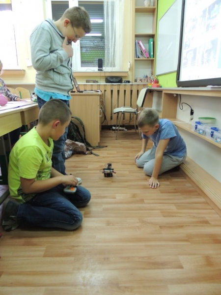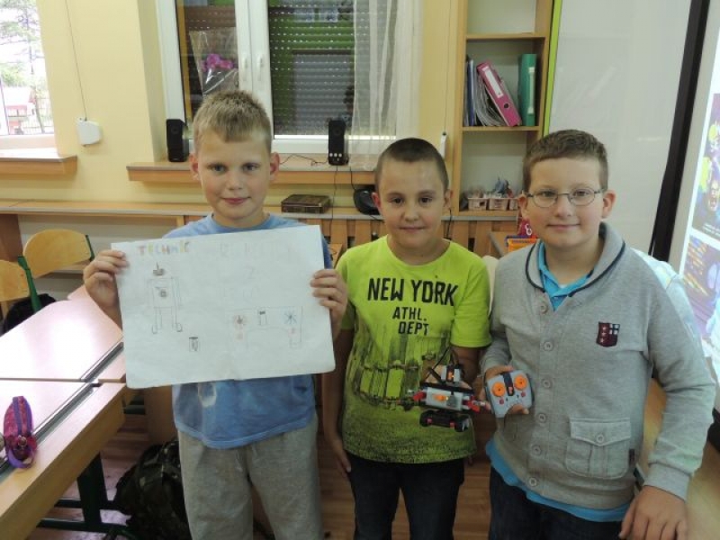 W dniu dzisiejszym uczniowie klasy IIIb (Tomek, Janek i Paweł), którzy również uczęszczają na zajęcia świetlicowe, zaprezentowali swoim rówieśnikom robota zdalnie sterowanego, którego sami zbudowali. Wszystkie dzieci z wielkim zaciekawieniem oglądali pokaz i dzięki uprzejmości kolegów mogli spróbować kierować małym samochodzikiem.