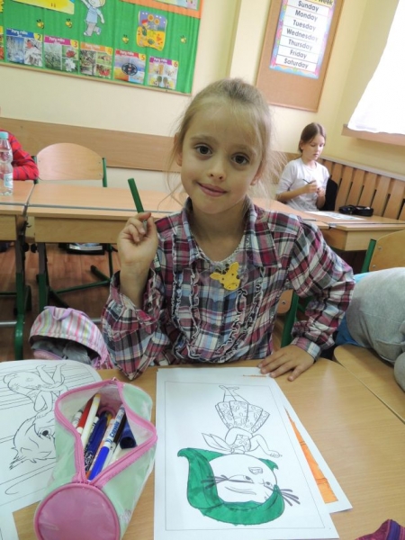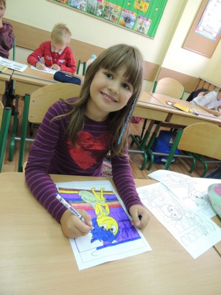 W międzyczasie pozostali uczniowie po obejrzeniu bajki pt. „W głowie się nie mieści” postanowili pomalować wcześniej przygotowane kolorowanki i tym samym stworzyć piękną gazetkę, którą niebawem zaprezentują na szkolnym korytarzu.