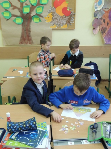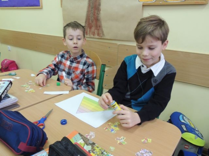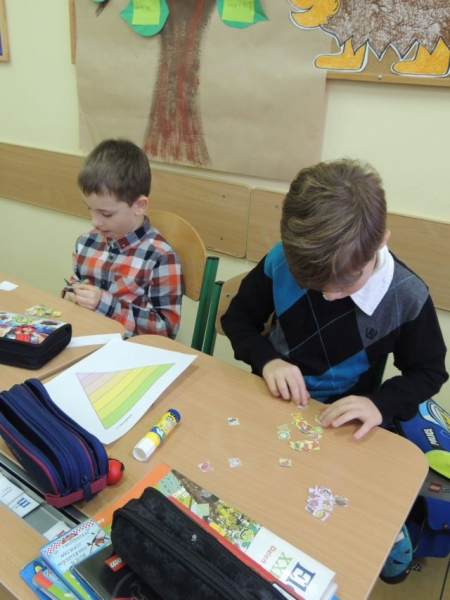 10 listopada 2015r. uczniowie klasy 1b zapoznali się z zasadami zdrowego i racjonalnego odżywiania się. Dzieci dowiedziały się, co należy jeść na śniadanie oraz dlaczego regularne spożywanie posiłków odgrywa tak ważną rolę w naszym życiu. Wszyscy z wielkim zaciekawieniem oglądali krótki film z udziałem znanego kucharza – Pascala Brodnickiego - promujący zasady zdrowego żywienia oraz aktywność fizyczną. Na miłe zakończenie zajęć uczniowie w grupach stworzyli piramidy żywienia.