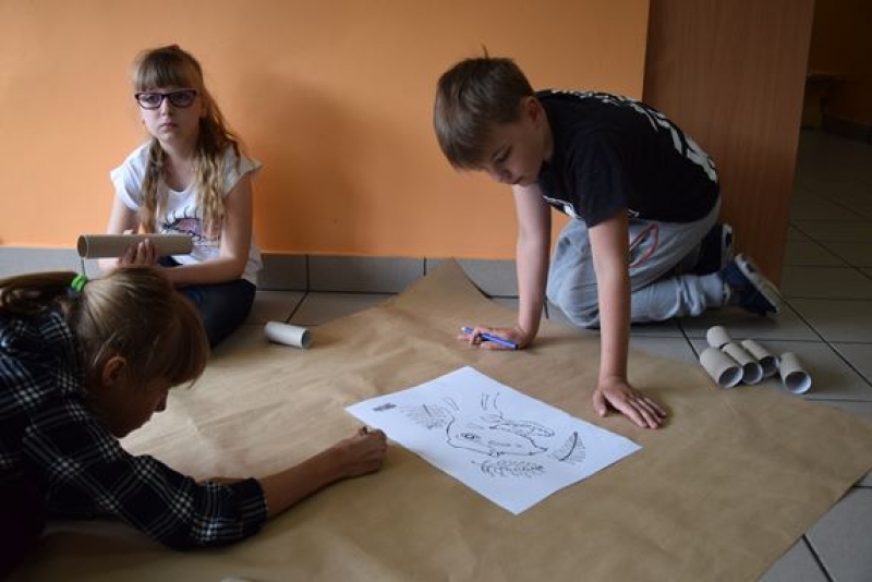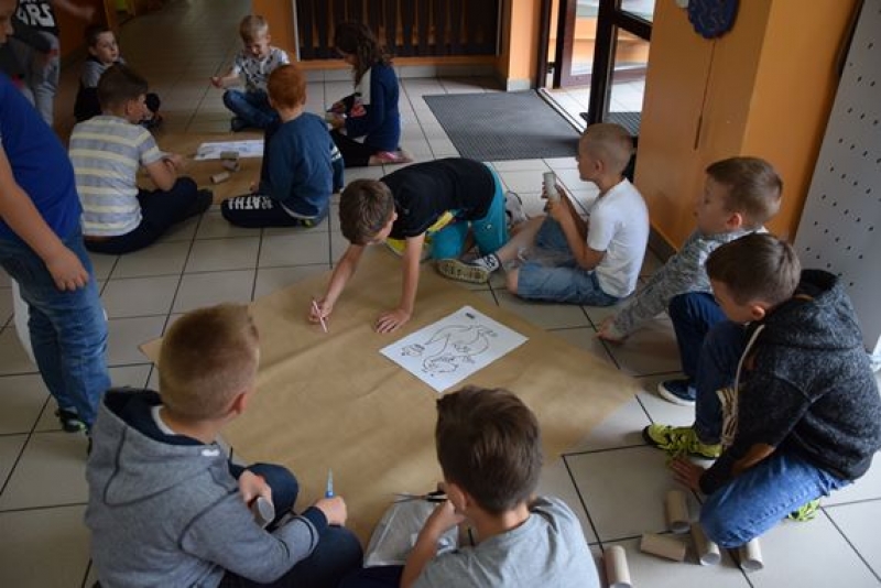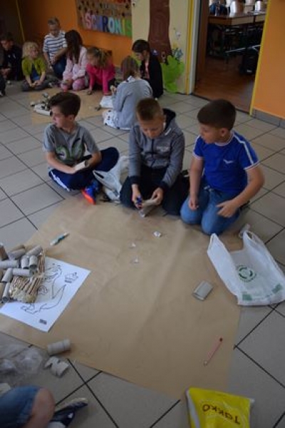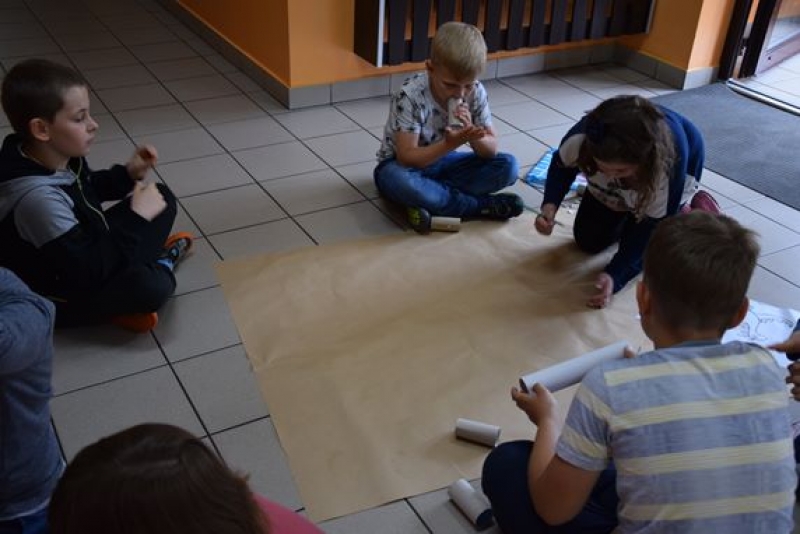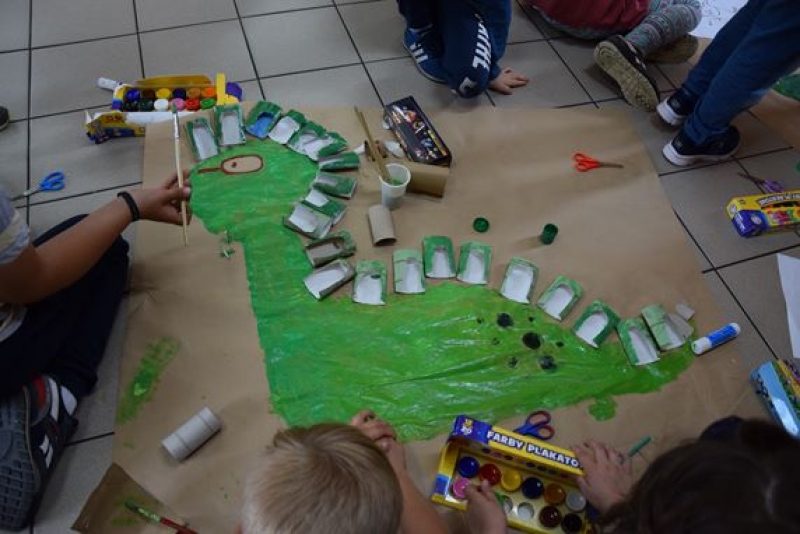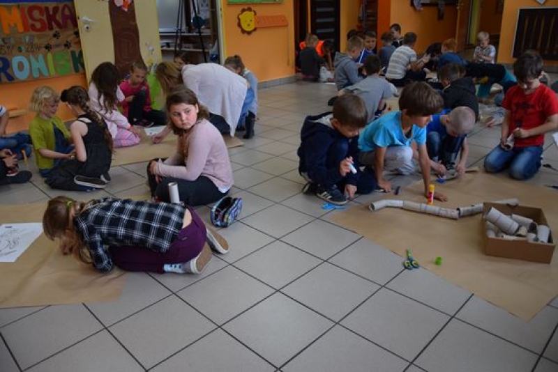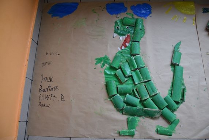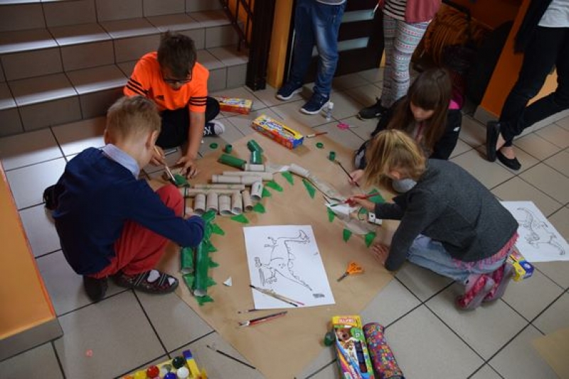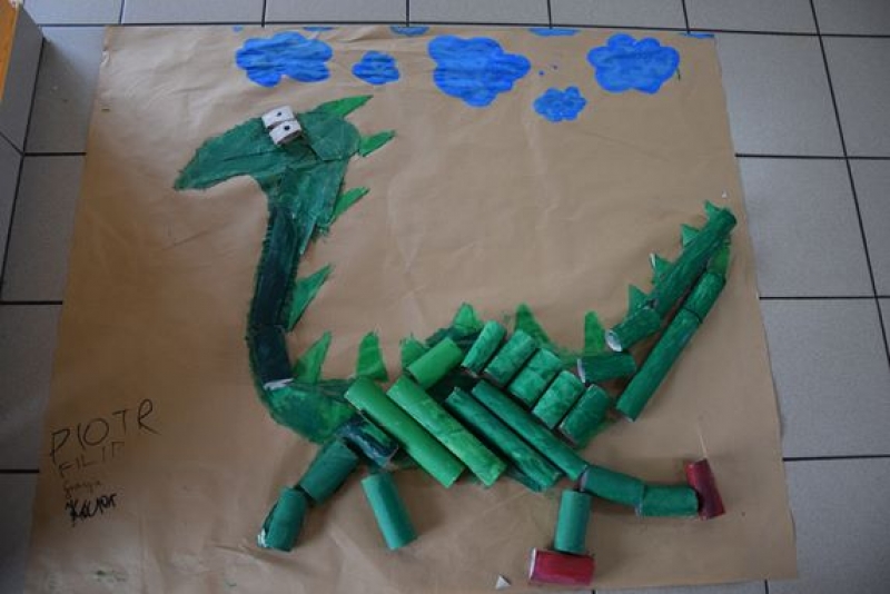 Dzisiaj uczniowie klas I, II i III w ramach Dni Techniki, które zakończyły się w zeszłym tygodniu w Lęborku, bawili się w archeologów. Sześć zespołów miało za zadanie wykonanie dinozaurów na podstawie wzorów, które mieli na kartkach. Swoje projekty wykonali przy użyciu rolek po papierach i ręcznikach toaletowych. Każda drużyna miała inny pomysł na przedstawienie swojego dinozaura. Wszystkie prace były oryginalne i ciekawie zrobione. Podczas tych zajęć przypomnieliśmy sobie znaczenie słowa archeologia i archeolog, i byliśmy przy tym EKO.