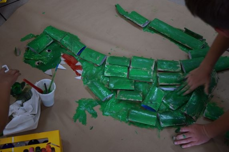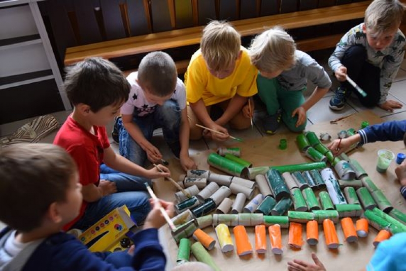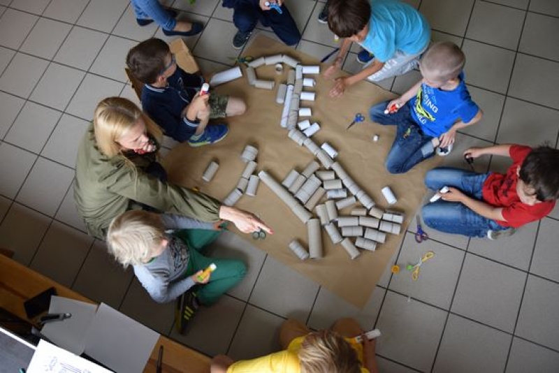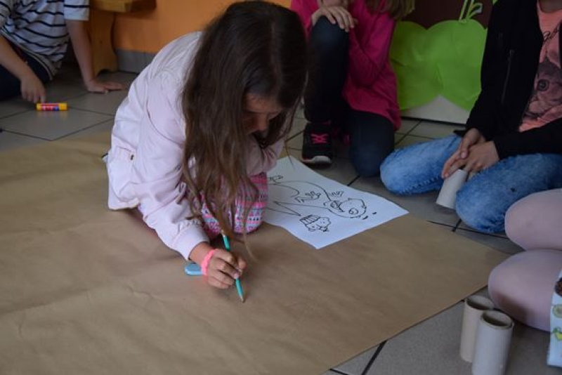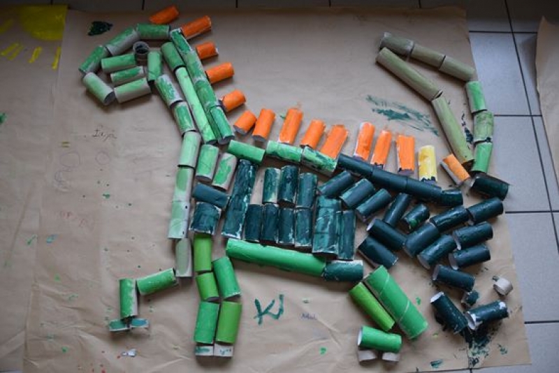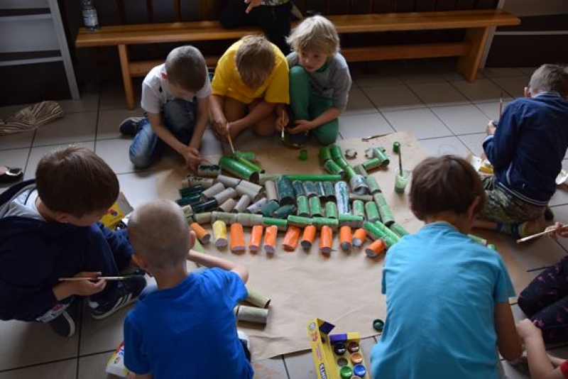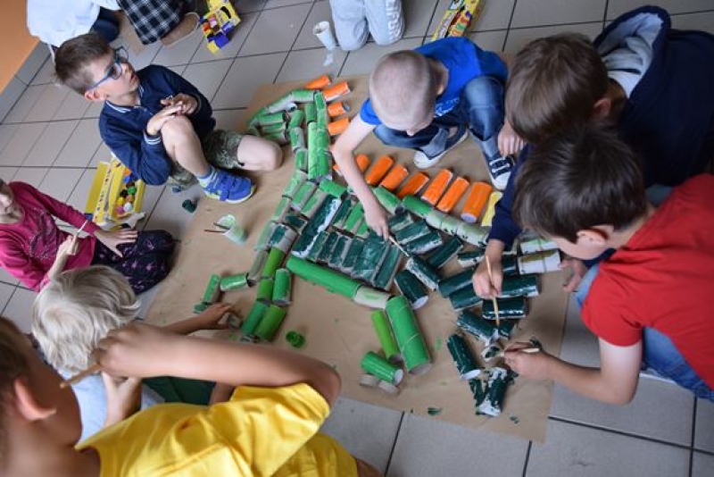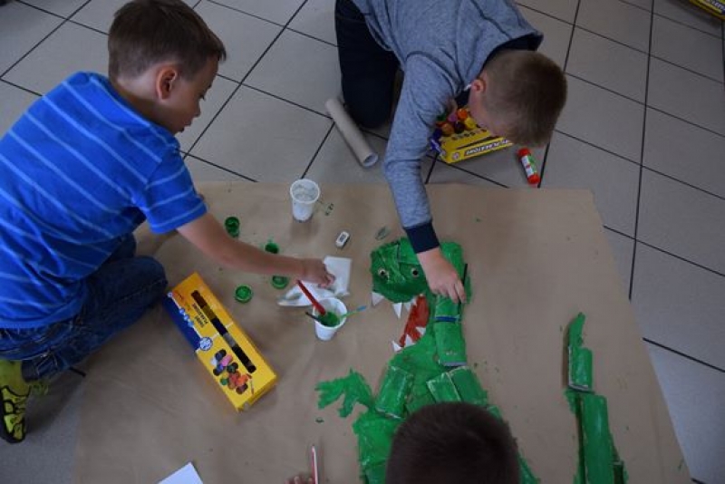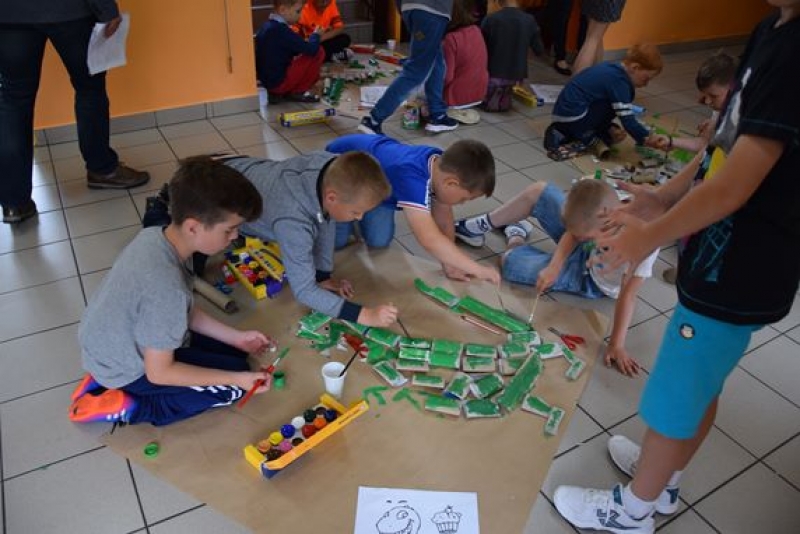 Dzisiaj uczniowie klas I, II i III w ramach Dni Techniki, które zakończyły się w zeszłym tygodniu w Lęborku, bawili się w archeologów. Sześć zespołów miało za zadanie wykonanie dinozaurów na podstawie wzorów, które mieli na kartkach. Swoje projekty wykonali przy użyciu rolek po papierach i ręcznikach toaletowych. Każda drużyna miała inny pomysł na przedstawienie swojego dinozaura. Wszystkie prace były oryginalne i ciekawie zrobione. Podczas tych zajęć przypomnieliśmy sobie znaczenie słowa archeologia i archeolog, i byliśmy przy tym EKO.