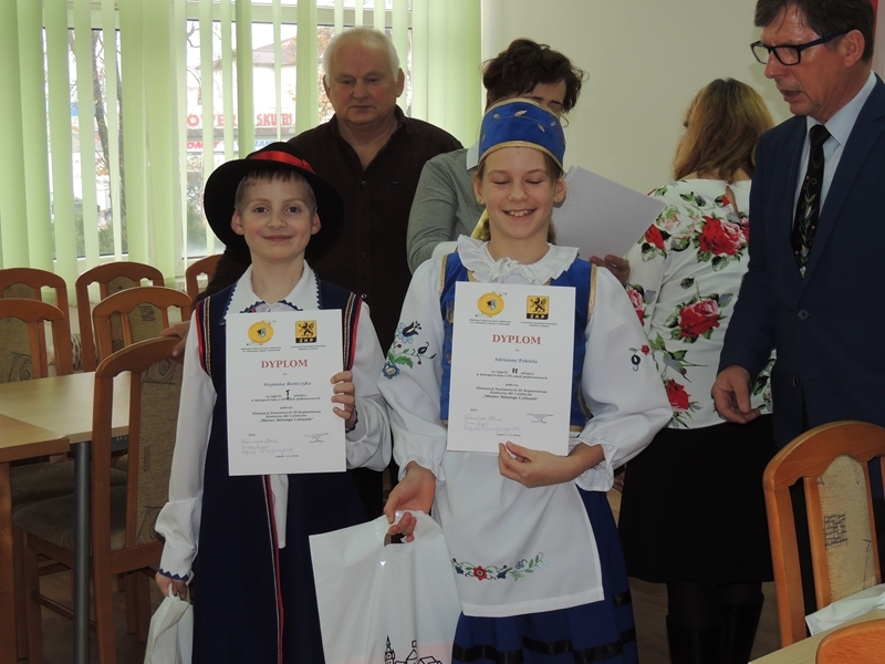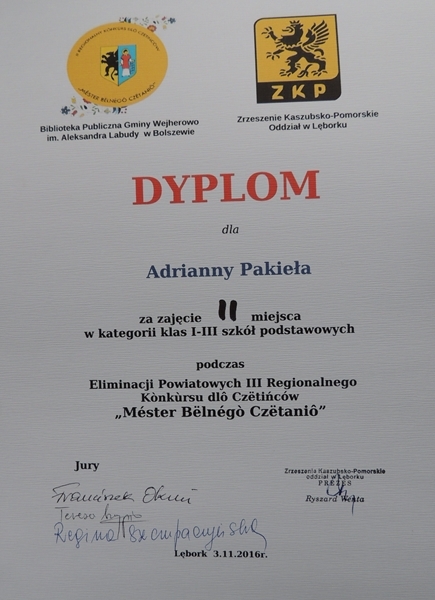 3 listopada 2016 r. uczniowie klas trzecich: Adrianna Pakieła (kl.III b) i Szymon Ramczyk (kl.III a) reprezentowali naszą szkołę w III Powiatowym Konkursie Pięknego Czytania ,,Méster Bëlnégò Czëtaniô”, organizowanym przez Zrzeszenie Kaszubsko – Pomorskie O/Lębork. Zadaniem uczestników konkursu było wyraziste, poprawne i płynne przeczytanie wylosowanego tekstu kaszubskiego ze zbioru wierszy Janusza Mamelskiego ,,Bajki kaszubskie”. Nasi uczniowie poradzili sobie znakomicie zajmując czołowe miejsca w kategorii klas I -III, a mianowicie: I miejsce – SZYMON RAMCZYK; II miejsce – ADRIANNA PAKIEŁA. W ten sposób przeszli oni do etapu regionalnego tegoż konkursu, który odbędzie się pod koniec listopada w Bolszewie. Szczerze im gratulujemy i trzymamy kciuki!