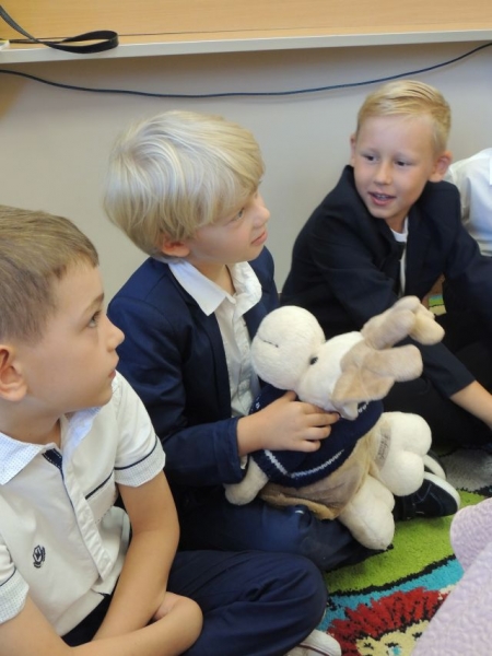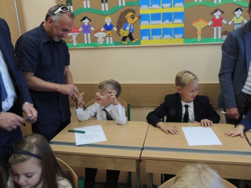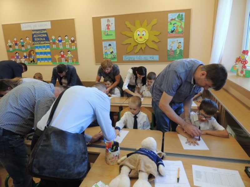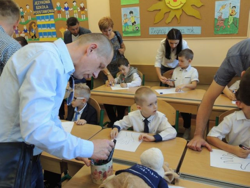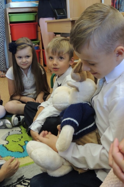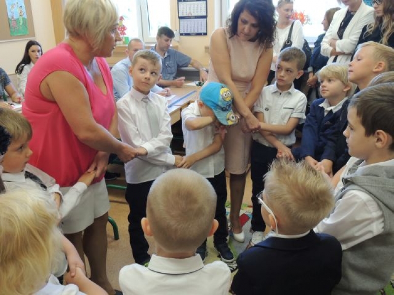 Szczególne słowa zachęty skierowane zostały do pierwszoklasistów, którzy dopiero rozpoczynają swoją wędrówkę po świecie nauki. Pani Dyrektor przedstawiła wychowawcę tegorocznej klasy pierwszej – p. Bożenę Siuta i nauczycieli pracujących w tej klasie z dziećmi.