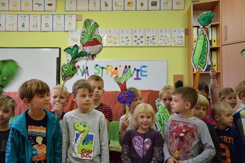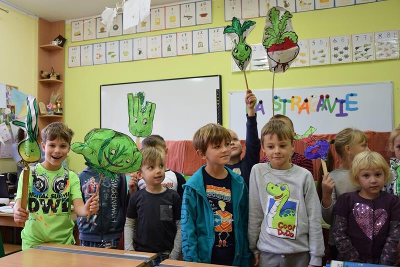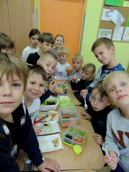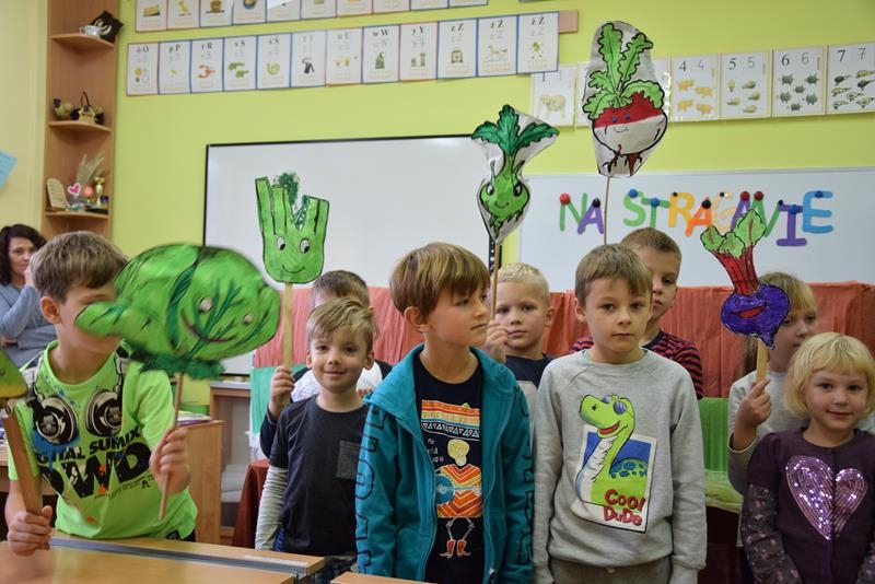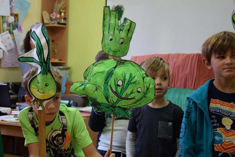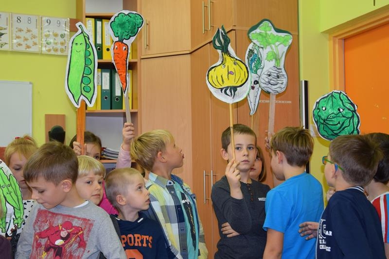 Uczniowie klasy IIb zapoznawali się z walorami zdrowotnymi warzyw i owoców. Dzieci brały udział w degustacji, planowały swój jadłospis, uczyły się zasad zdrowego odżywiania. Zwięczeniem tematu był występ dla klasy pierwszej pt.: „Na straganie” na podstawie wiersza Jana Brzechwy.