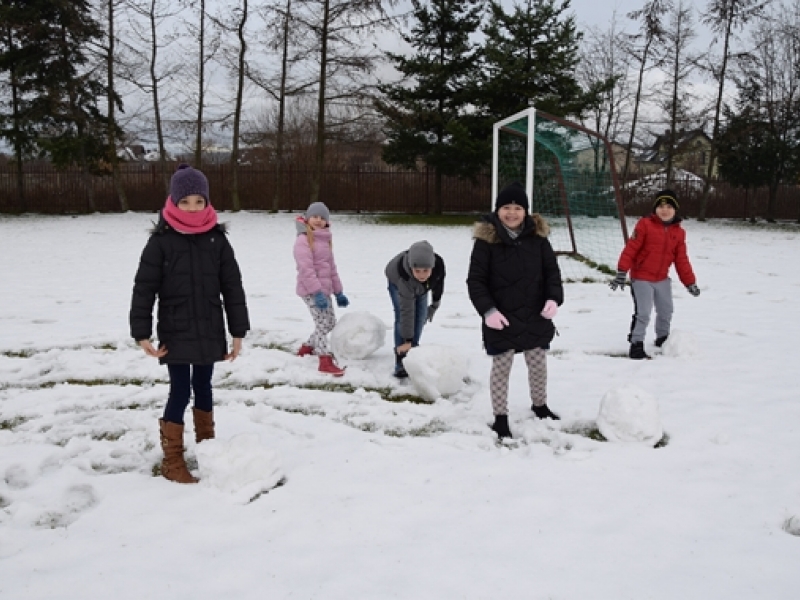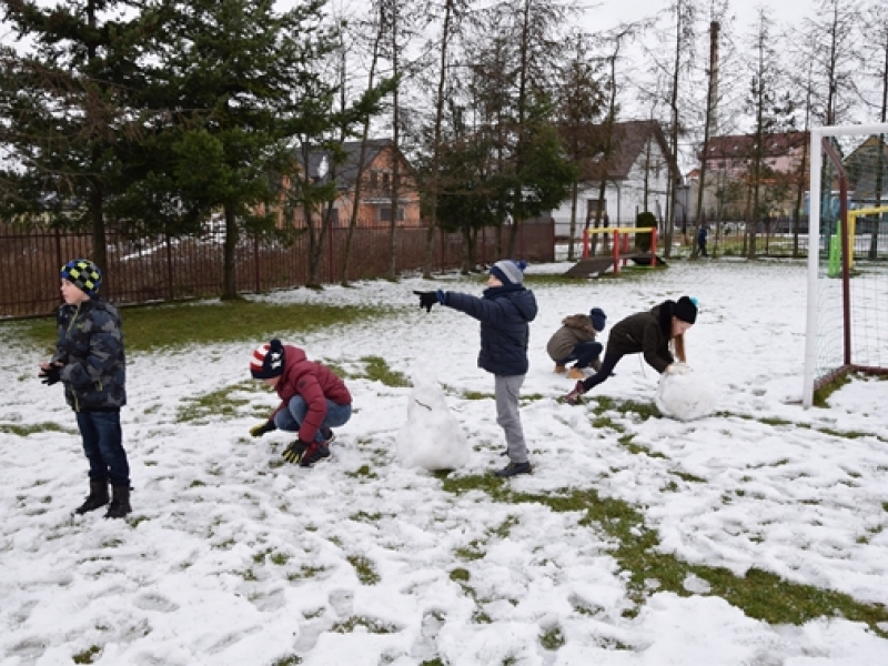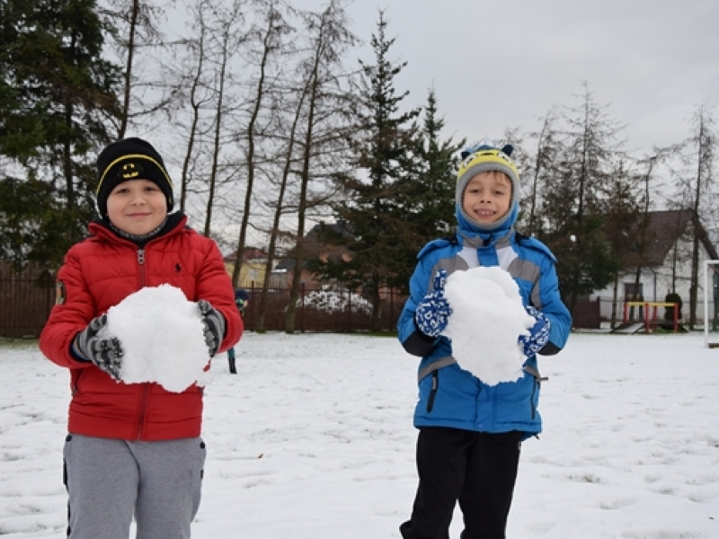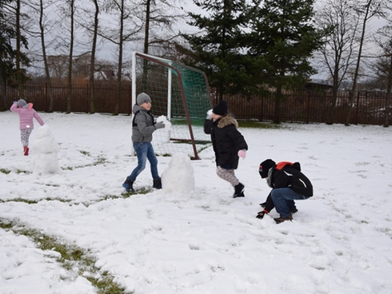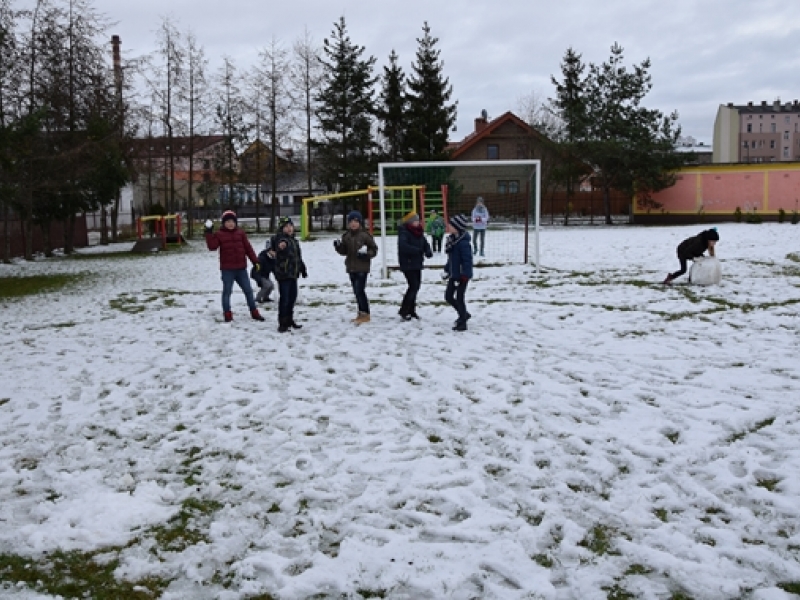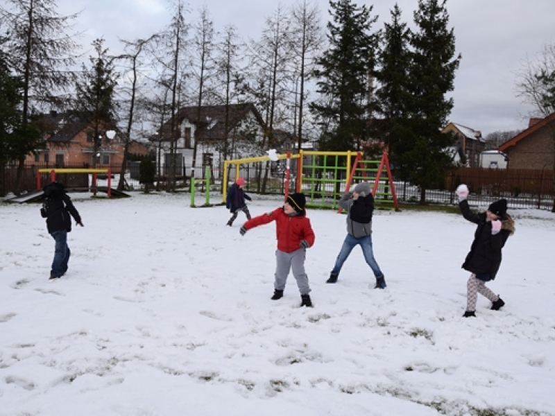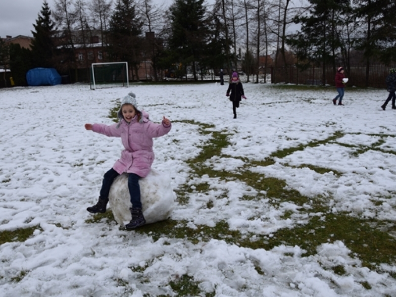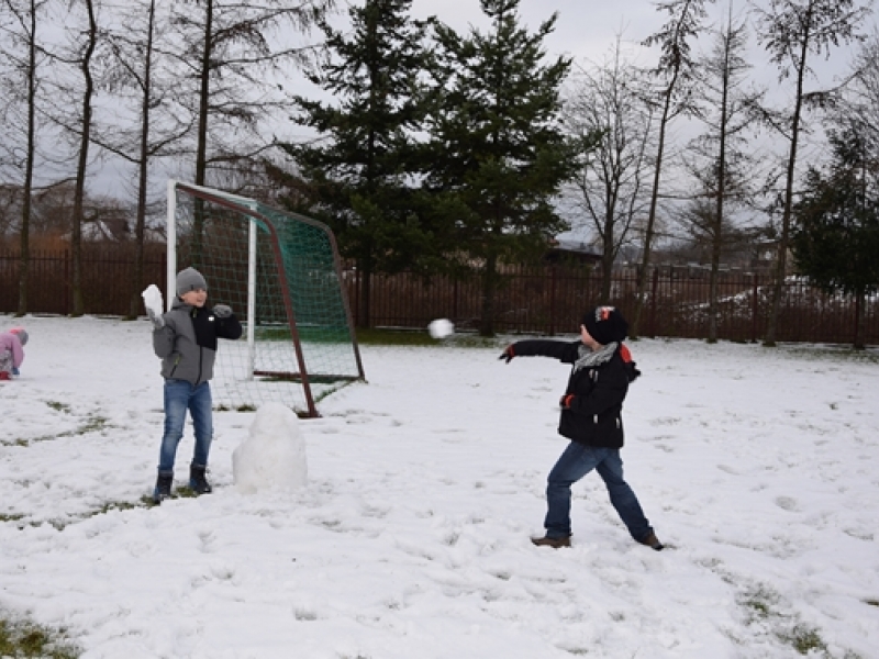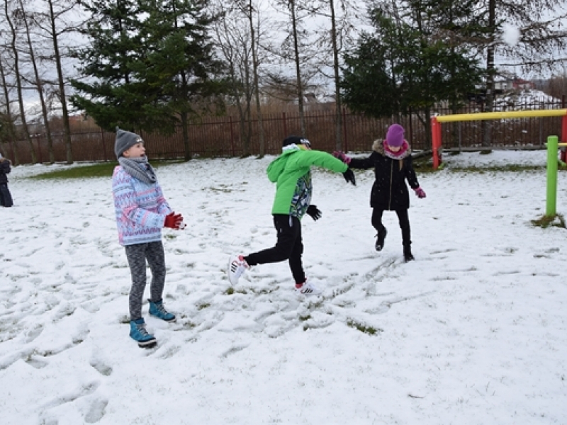 „Zaspy zaspały śnieg we śnie, szybują szyby w białe kwiatki. Pan lód dziś blady, pada śnieg, to mroźne kwiatki gubią płatki. Bieli nawiało dobry metr, słońce ma wąsy pobielone. Zimowe dzieci lubią biel, to od niej uszy są czerwone...” Uczniowie naszej szkoły korzystali w dniu wczorajszym z pierwszych w tym roku opadów śniegu. Lepili bałwany i rzucali śnieżkami. Zabawie towarzyszyły gromkie śmiechy i wspaniała, dziecięca radość.