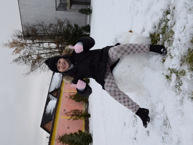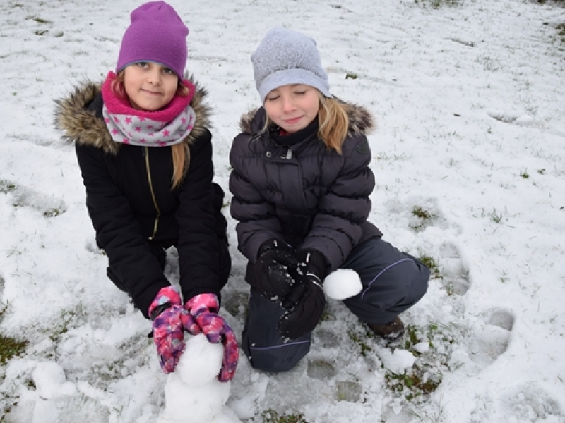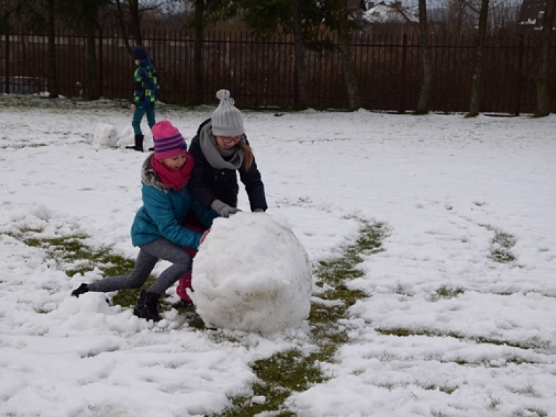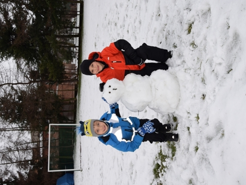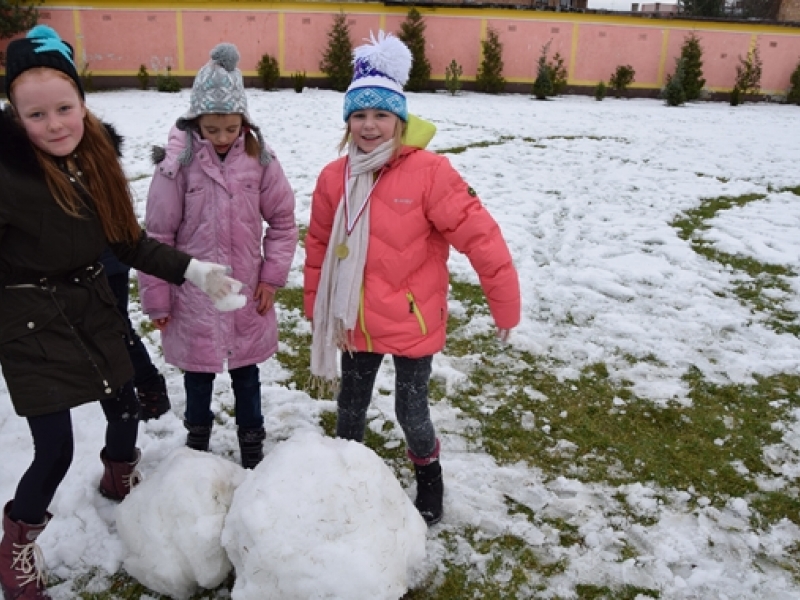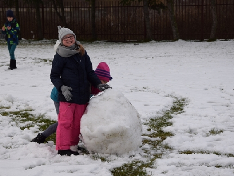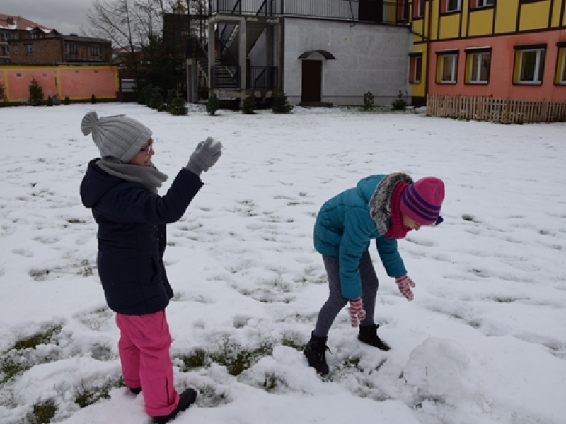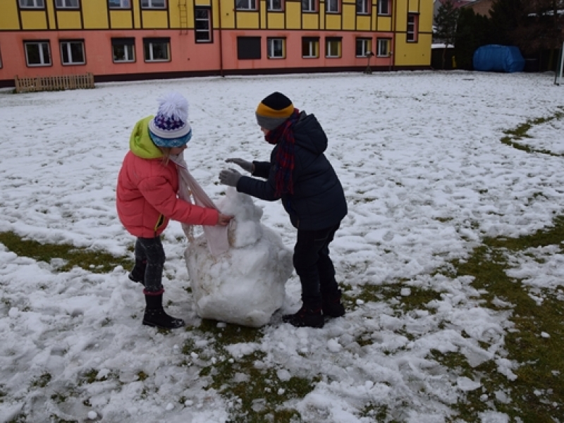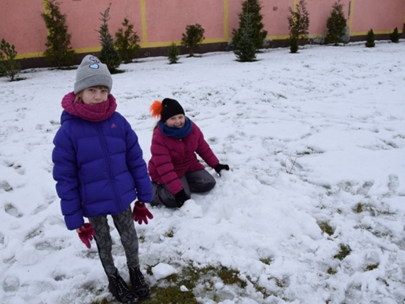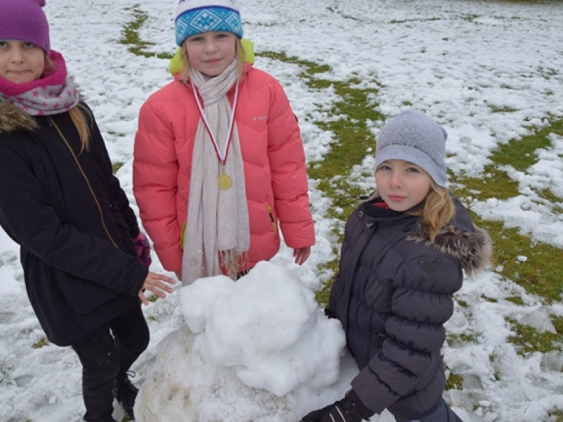 „Zaspy zaspały śnieg we śnie, szybują szyby w białe kwiatki. Pan lód dziś blady, pada śnieg, to mroźne kwiatki gubią płatki. Bieli nawiało dobry metr, słońce ma wąsy pobielone. Zimowe dzieci lubią biel, to od niej uszy są czerwone...” Uczniowie naszej szkoły korzystali w dniu wczorajszym z pierwszych w tym roku opadów śniegu. Lepili bałwany i rzucali śnieżkami. Zabawie towarzyszyły gromkie śmiechy i wspaniała, dziecięca radość.
