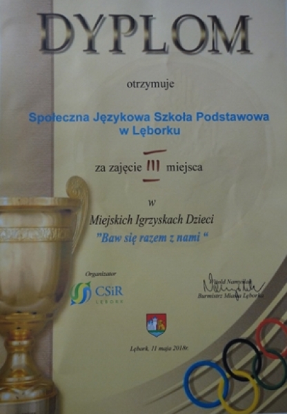11 maja w Miejskiej Hali Sportowej w Lęborku przeprowadzono Miejskie Zawody Sportowe Szkół Podstawowych dla klas II i III „Baw się razem z nami”. Organizatorem konkursu było Centrum Sportu i Rekreacji. W zawodach wystartowały wszystkie lęborskie szkoły podstawowe. Reprezentacja składała się z 16 uczniów z klas II i III. Uczniowie rywalizowali w 5 konkurencjach takich jak bieg sztafetowy, slalom z piłką do unihokeja czy bieg z pierścieniem. Każda z konkurencji wymagała od uczestników nie tylko szybkości, ale i dokładności wykonania. Reprezentacja SJSP zajęła III miejsce. Jest to wielki sukces, tym bardziej, że w składzie naszej drużyny byli również uczniowie klas I. W zawodach na szczeblu powiatowym reprezentować Lębork będzie Szkoła Podstawowa nr 5. Na koniec wszystkie szkoły otrzymały z rąk burmistrza miasta – Witolda Namyślaka oraz zastępcy burmistrza – Mariana Kurzydło, pamiątkowe puchary i dyplomy, a każdy uczestnik zawodów nagrodzony został pamiątkowym medalem.