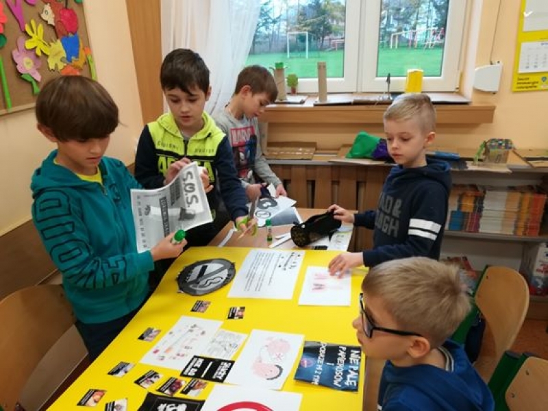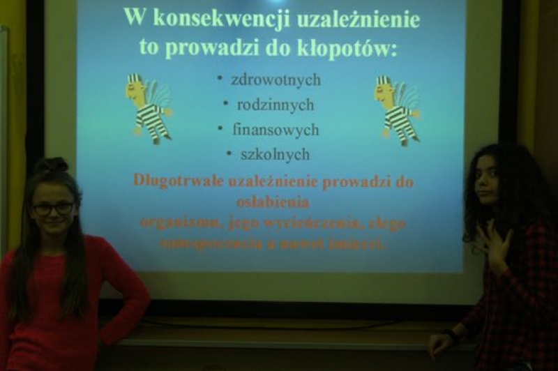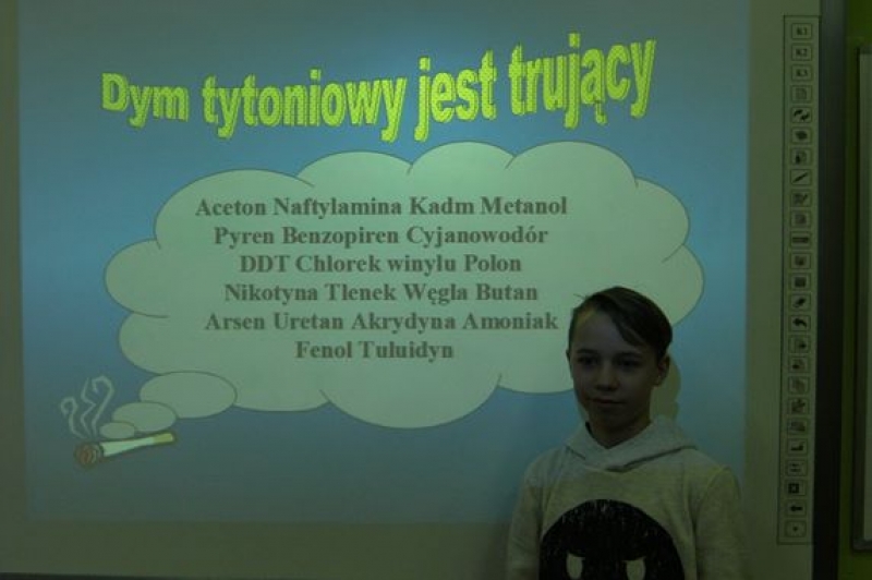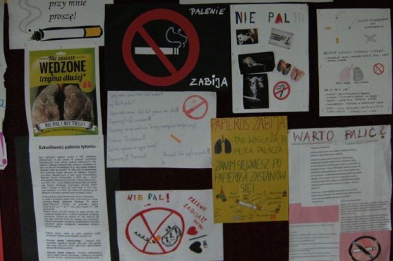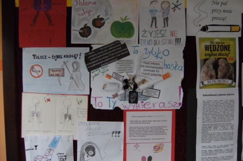 W połowie listopada dzieci i młodzież całej szkoły wzięli udział w akcji przeciwko paleniu papierosów. Uczniowie klasy VIa przedstawiali prezentację „Wybierz życie bez tytoniu”. Podczas prezentacji poznali: