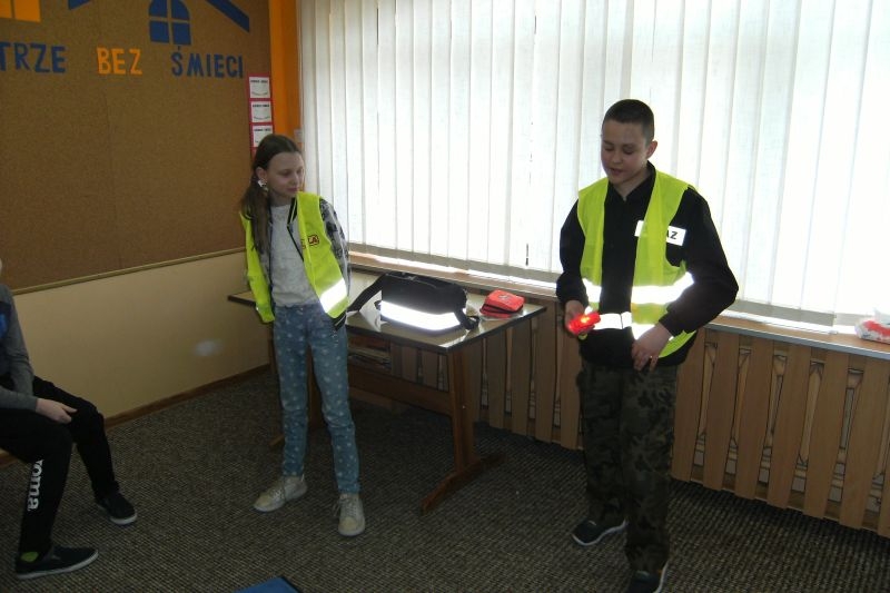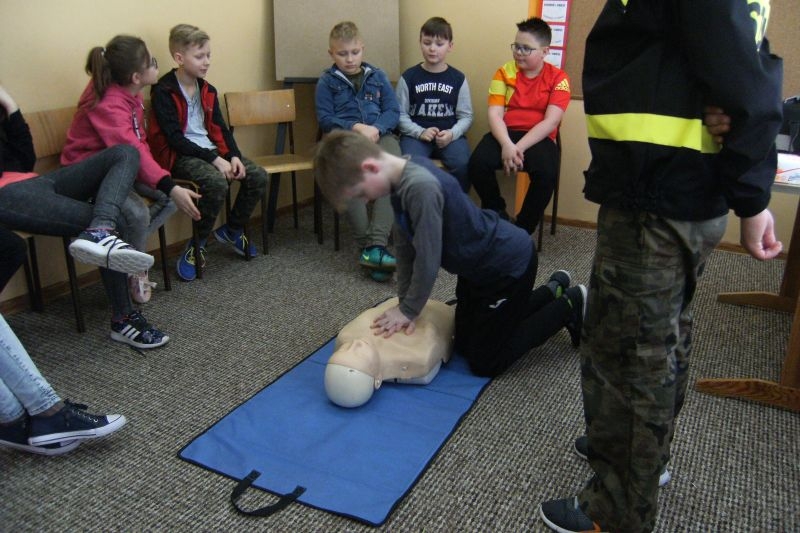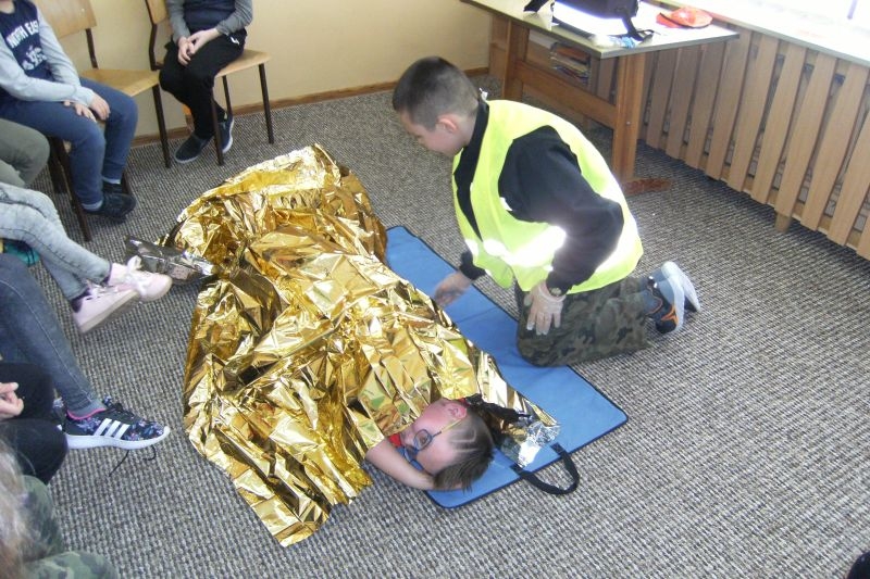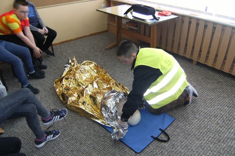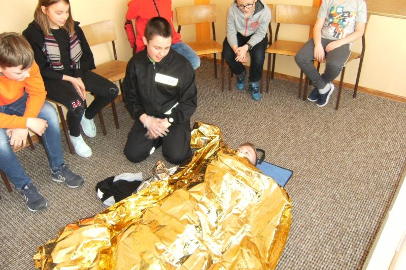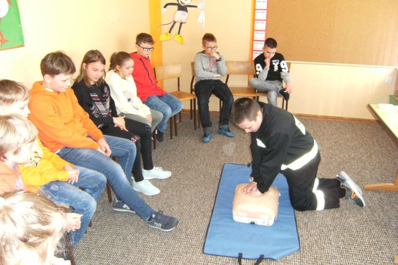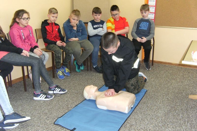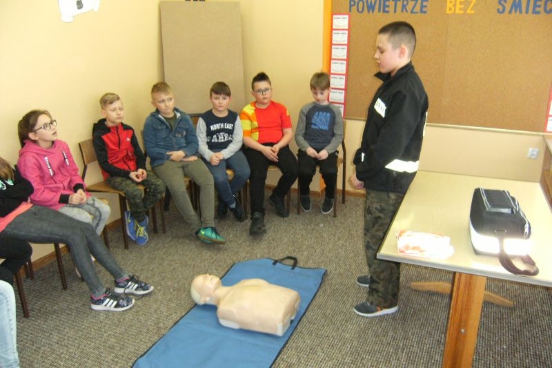 Uczeń klasy V Tomasz Agatowski przeprowadził dla kolegów z klasy IVa i IVb pogadankę i pokaz na temat udzielania pierwszej pomocy przedmedycznej. Zapoznał uczniów z zespołem czynności, jakie należy wykonać wobec osoby poszkodowanej wskutek urazu lub nagłego ataku choroby, celem ratowania jej zdrowia i życia do czasu pojawienia się wykwalifikowanych ratowników. Przypomniał alarmowe numery telefonów i sposób zgłaszania powiadomienia o wypadku.