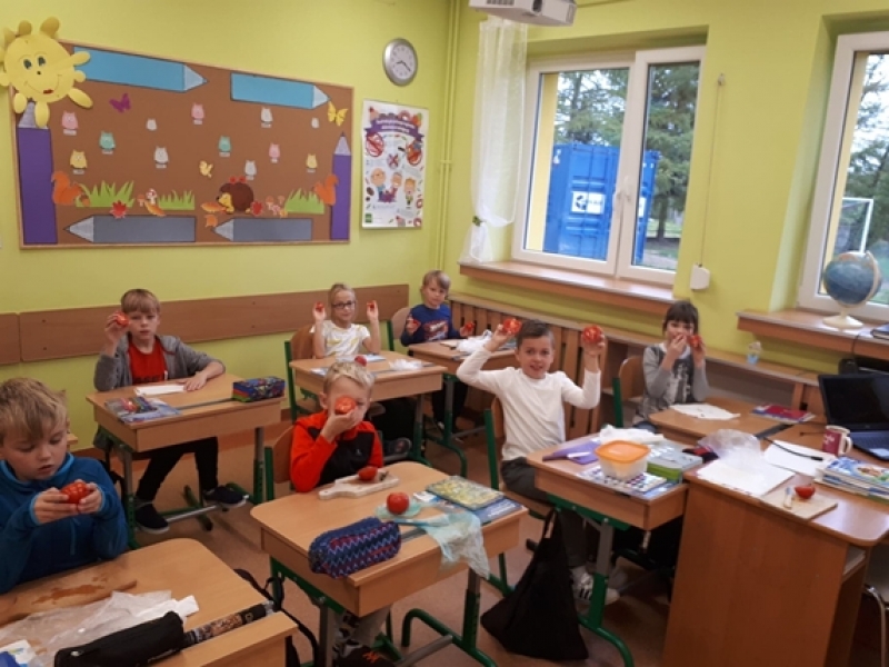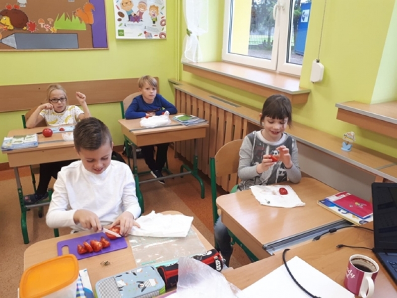 W piątek klasa II b na lekcji przyrody poznała budowę pomidora, zrobiliśmy to jednak w innym sposób, były to zajęcia praktyczne. Każde dziecko miało pomidora, wykorzystaliśmy wszystkie nasze zmysły aby dokładnie go opisać. Zaczęliśmy od zapachu, szukaliśmy czy coś pachnie podobnie, określiliśmy jego kształt i kolor, następnie dzieci przekroiły go na pół i omawialiśmy jego środek, porównywaliśmy go do innych warzyw i owoców. Rozmawialiśmy o jego wartościach odżywczych i jaki mają dobry wpływ na nasze zdrowie. Na zakończenie pomidory trafiły do naszych brzuszków.