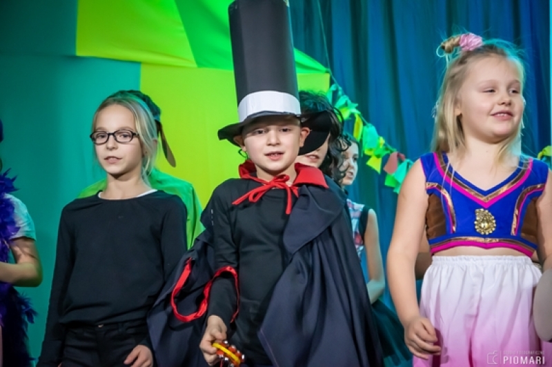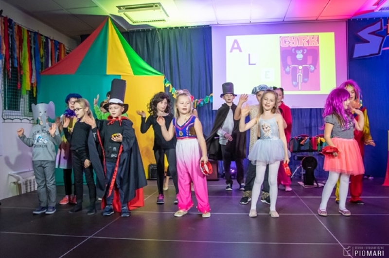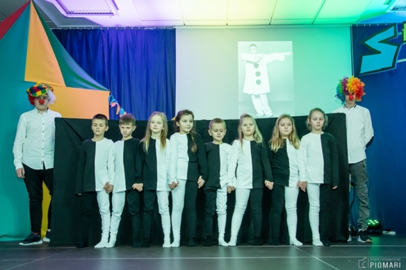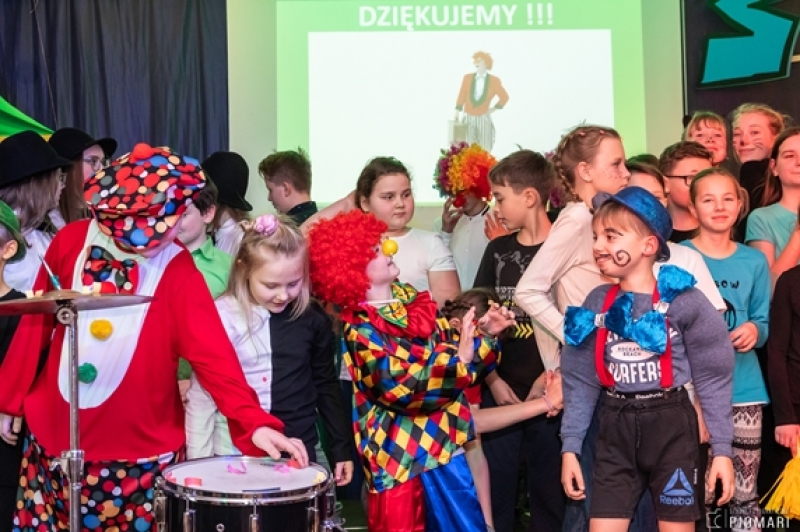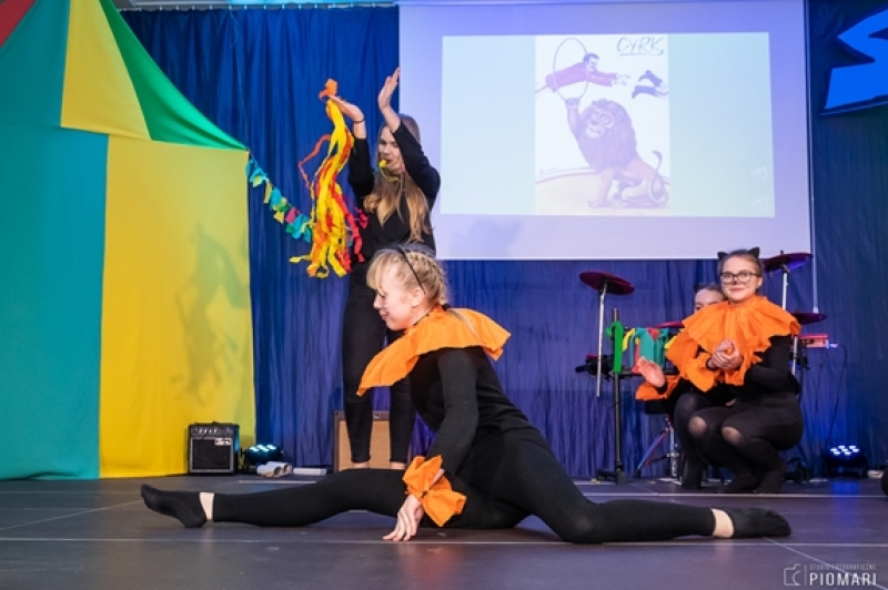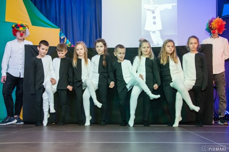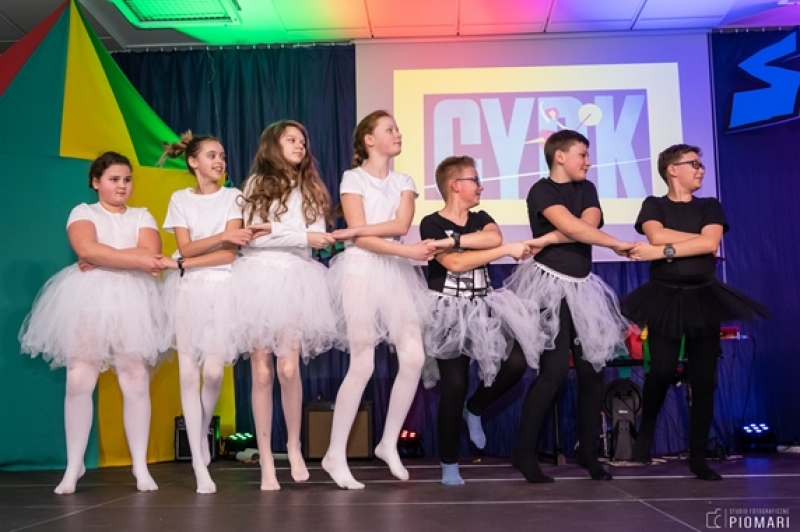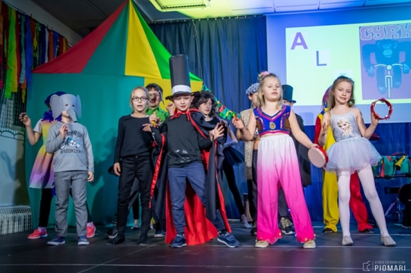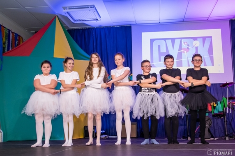 W naszym cyrku wystąpili przedstawiciele wszystkich klas. Występ rozpoczęli uczniowie uczęszczający na zajęcia kółka muzycznego piosenką „Cyrk wita Was!”. Następnie swoje umiejętności zaprezentowali członkowie zajęć tanecznych przygotowani przez Panią Teresę Szczepańską. Były akrobacje, układy taneczne i żonglerka przy użyciu hula – hop. Klasa IV B zaprezentowała scenkę humorystyczną, która rozbawiła zebraną publiczność. Uczniowie klasy III A zatańczyli dla nas „Taniec ognia” do muzyki Manuel’a de Falla oraz pokazali swoje umiejętności kulturystyczne jako grupa „Salto Mortale”. Klasy pierwsze w czarno – białych strojach zaprezentowały taniec optyczny. Grupa dzieci uczęszczających na zajęcia świetlicowe również przygotowała dla nas taniec „Czarnych Panter”. Podobnie klasa IV A wykazała się wspaniałymi umiejętnościami tanecznymi. Uczniowie klasy VII A wyszli na scenę, aby przedstawić układ choreograficzny „Taniec w kapeluszach”. Dziewczynki z klasy szóstej zatańczyły do utworu „River flows in you”, klasa V B pokazała nam „Taniec łabędzi” i „Skibidi”.
