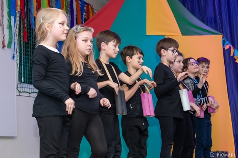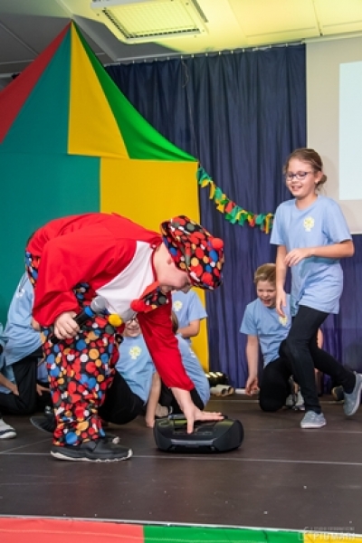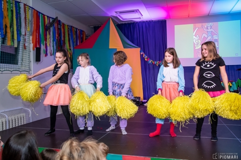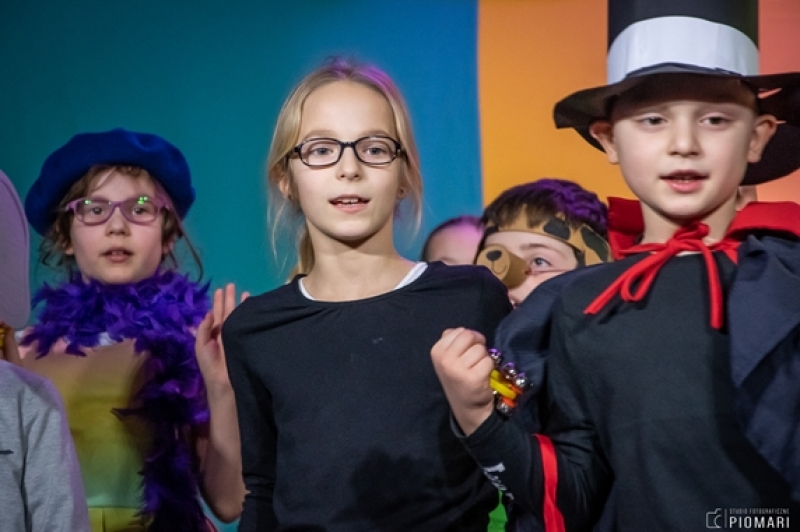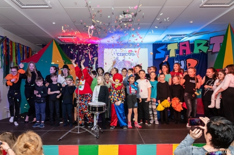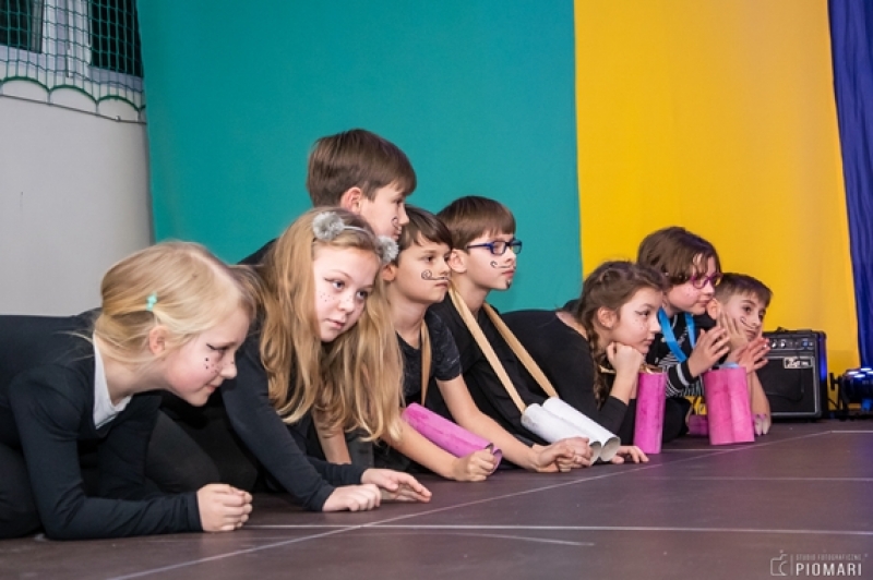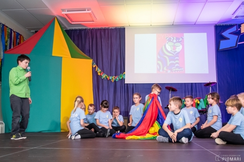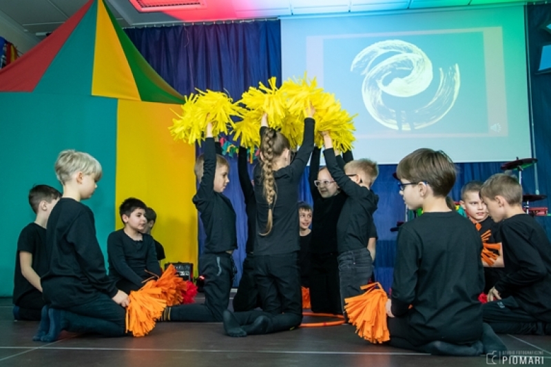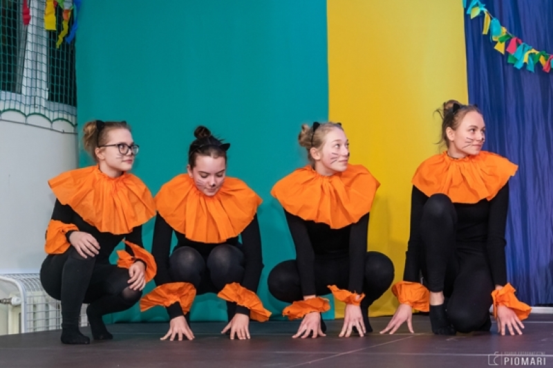 W naszym cyrku wystąpili przedstawiciele wszystkich klas. Występ rozpoczęli uczniowie uczęszczający na zajęcia kółka muzycznego piosenką „Cyrk wita Was!”. Następnie swoje umiejętności zaprezentowali członkowie zajęć tanecznych przygotowani przez Panią Teresę Szczepańską. Były akrobacje, układy taneczne i żonglerka przy użyciu hula – hop. Klasa IV B zaprezentowała scenkę humorystyczną, która rozbawiła zebraną publiczność. Uczniowie klasy III A zatańczyli dla nas „Taniec ognia” do muzyki Manuel’a de Falla oraz pokazali swoje umiejętności kulturystyczne jako grupa „Salto Mortale”. Klasy pierwsze w czarno – białych strojach zaprezentowały taniec optyczny. Grupa dzieci uczęszczających na zajęcia świetlicowe również przygotowała dla nas taniec „Czarnych Panter”. Podobnie klasa IV A wykazała się wspaniałymi umiejętnościami tanecznymi. Uczniowie klasy VII A wyszli na scenę, aby przedstawić układ choreograficzny „Taniec w kapeluszach”. Dziewczynki z klasy szóstej zatańczyły do utworu „River flows in you”, klasa V B pokazała nam „Taniec łabędzi” i „Skibidi”.