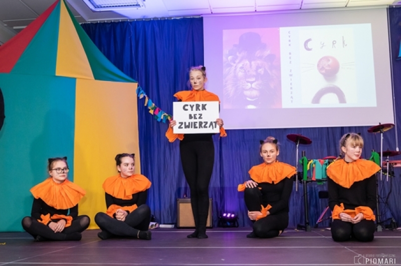 Podczas pokazu poruszony został temat tresury dzikich zwierząt i ich udziału w występach cyrkowych. W większości cyrków na całym świecie do klasycznych numerów należą występy tresowanych zwierząt. W programie znajdują się na przykład pokazy psów jeżdżących na rowerach, fok żonglujących piłkami. Szczególną atrakcją są numery z udziałem niebezpiecznych zwierząt, takich jak niedźwiedzie, lwy, tygrysy i słonie. Drastyczne metody tresowania zwierząt cyrkowych i bardzo złe warunki w jakich są przetrzymywane sprawiają, że takie występy są ostro krytykowane. Wiele krajów zakazało takich pokazów. W Polsce wciąż toczy się dyskusja nad prawnym zakazem wykorzystywania zwierząt do sztuczek cyrkowych. My wyraziliśmy swój sprzeciw i dołączyliśmy do apelu: „Cyrk bez zwierząt”, podczas występu dziewczynek z klas VII B i VIII A.