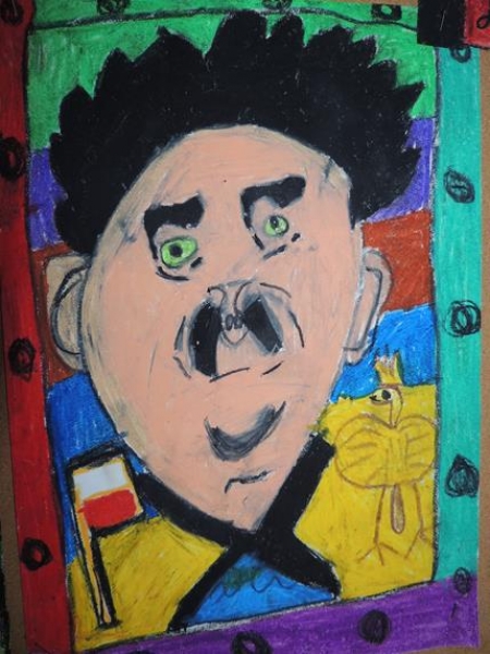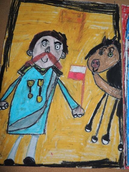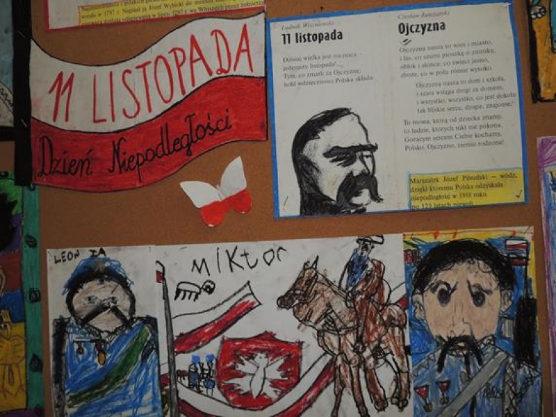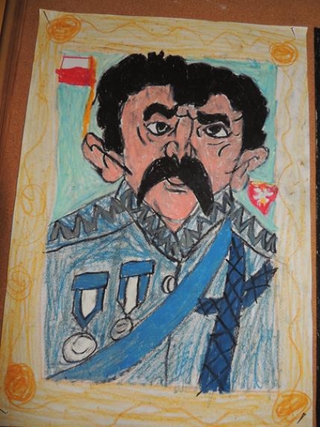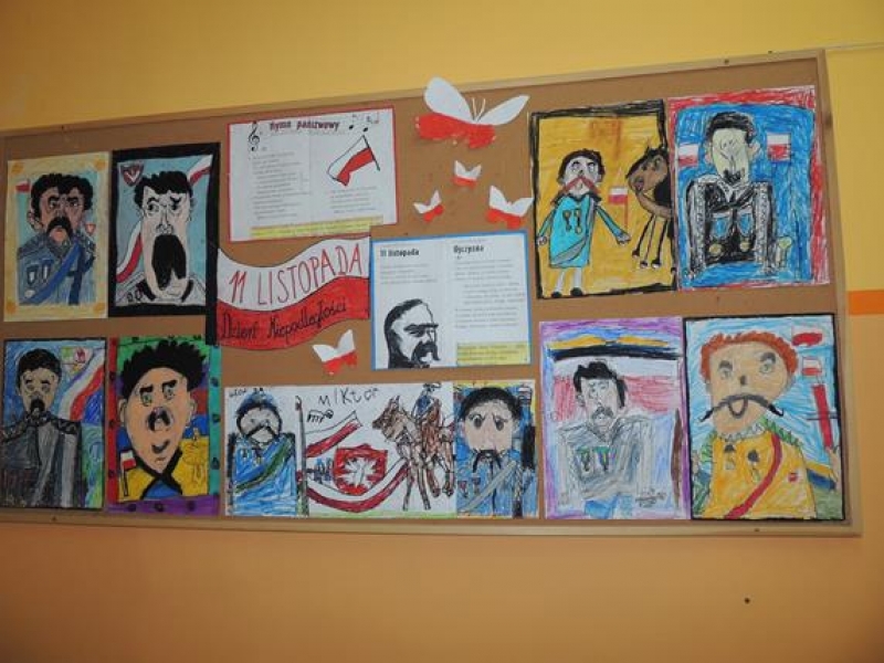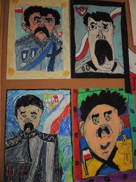 W związku ze zbliżającym się Dniem Niepodległości, uczniowie klasy pierwszej ,omawiając to święto obejrzeli film o marszałku Józefie Piłsudskim i wykonali jego portrety.Trzeba przyznać,że ozdobiona nimi gazetka szkolna wygląda imponująco.