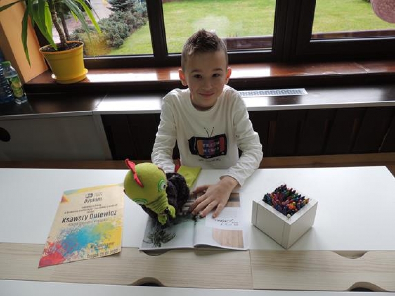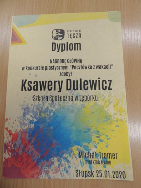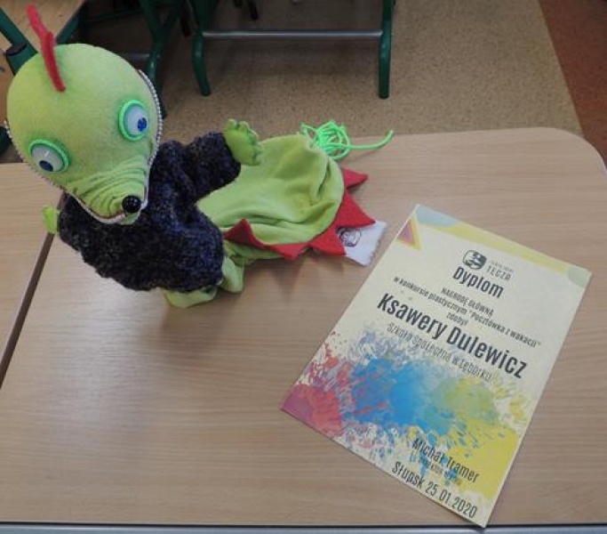 W styczniu 2020r. uczniowie klasy pierwszej wykonali piękne prace na Międzyszkolny Konkurs Plastyczny ,,Pocztówka z wakacji”, zorganizowany przez Państwowy Teatr Lalki ,,Tęcza” ze Słupska. Inspiracją do tego konkursu była wznowieniowa premiera spektaklu ,,Wakacje smoka Bonawentury” opowiadający o małym smoku ulegającym różnym, nie zawsze dobrym, wpływom. By to zmienić, rodzice i nauczyciele postanowili wysłać malca na samotną wakacyjną wyprawę, by nauczył się życia. Ze wszystkich dostarczonych prac Jury wybrało jedną, która nagrodzona została trofeum w postaci unikatowej repliki lalki teatralnej oraz podwójnego zaproszenia na premierę wznowieniową „Wakacji smoka Bonawentury”. Lalka wykonana przez pracownię – to jeden z bohaterów tegoż spektaklu.