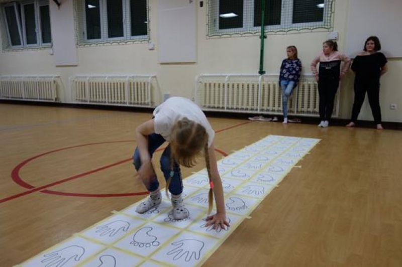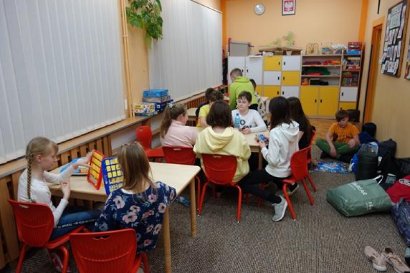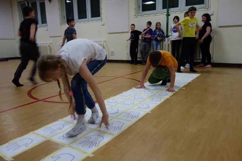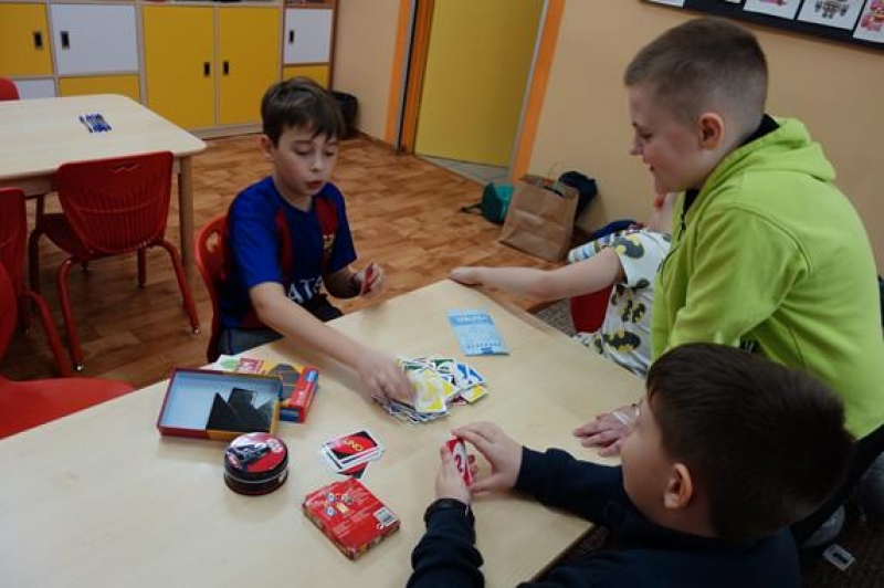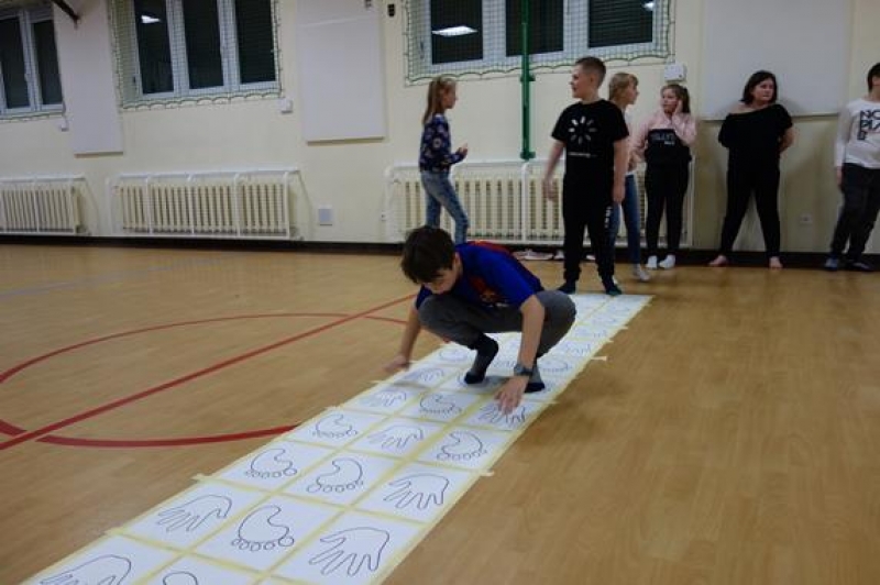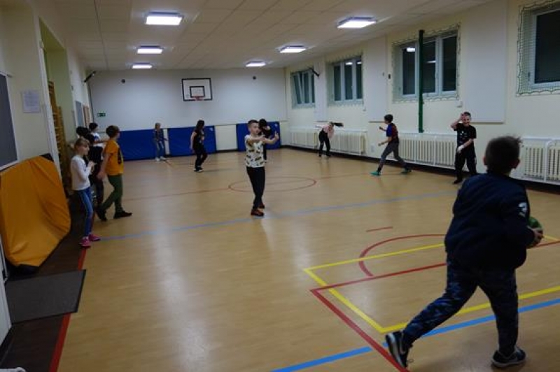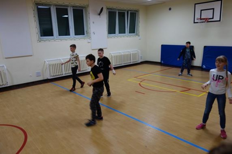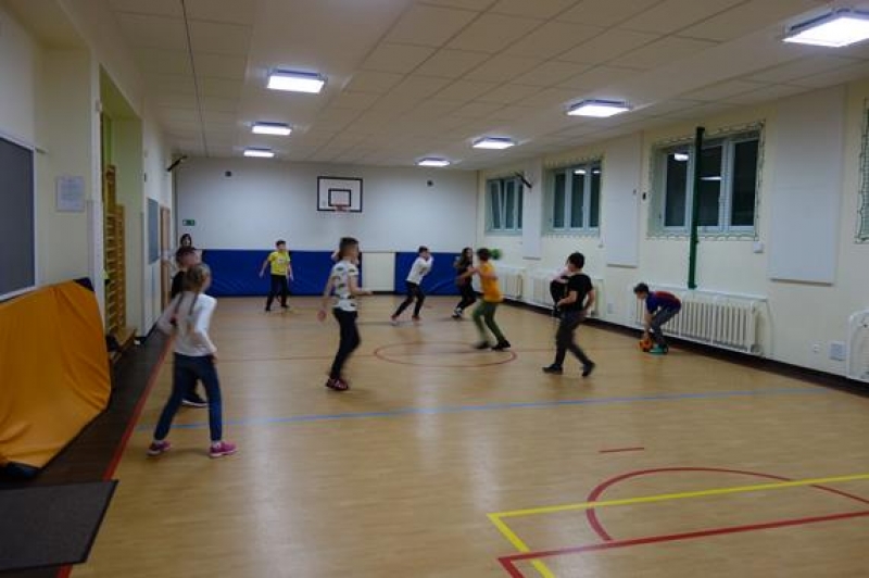 Wieczór rozpoczęliśmy w świetlicy szkolnej, gdzie graliśmy w gry karciane i planszowe. Później, żeby spożytkować trochę energii, udaliśmy się na salę gimnastyczną, aby rozegrać mecz w „Dwa ognie” i pobawić się w zabawę, którą każdy pamięta z dzieciństwa - „Raz, dwa, trzy, Baba Jaga patrzy”. Po aktywności fizycznej dla wszystkich głodomorów czekała pizza. Następnie bawiliśmy się w podchody, które wszystkim dostarczyły bardzo dużo pozytywnych emocji. Uczniowie zmierzyli się również z grą zwinnościową „Rączki, nóżki”, która do łatwych nie należy, szczególnie jak się w nią gra o godz. 23. Było dużo śmiechu i radości z zabawy. Po północy obejrzeliśmy film i nad ranem, po długich rozmowach poszliśmy spać. Szkoda, że tak szybko była pobudka. Ta noc minęła zdecydowanie za szybko!