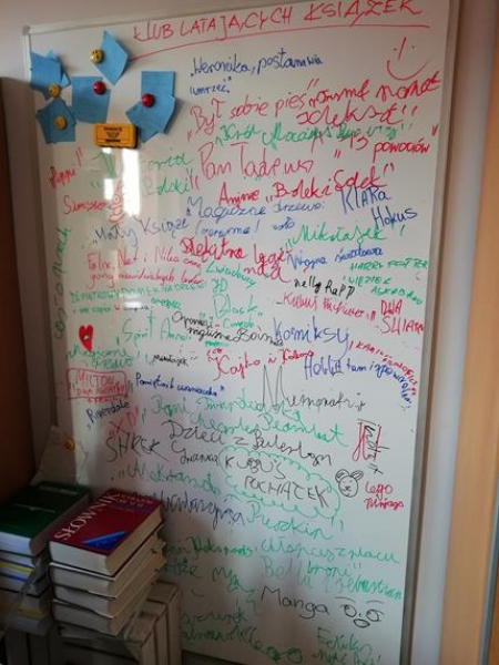 W bibliotece szkolnej jest taka tablica, na którą można wpisywać tytuły ulubionych książek, lub tych, które chciałoby się przeczytać. Marzenia trzeba spełniać, więc mamy dla was pierwszą porcję książek marzeń :-). Zakupy zostały zrobione za pieniądze, które uczniowie sami uzbierali, przynosząc makulaturę do szkoły.