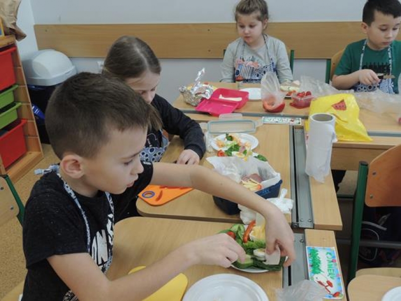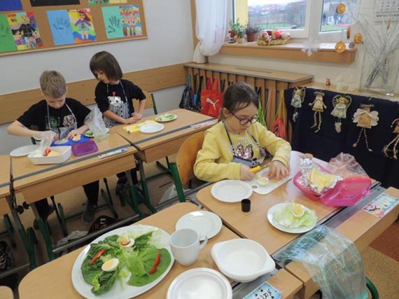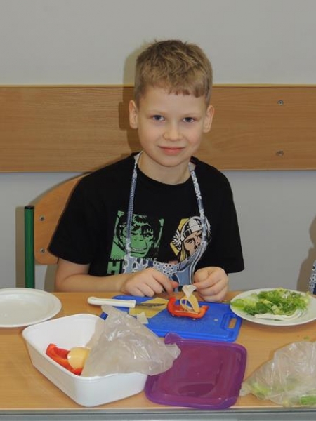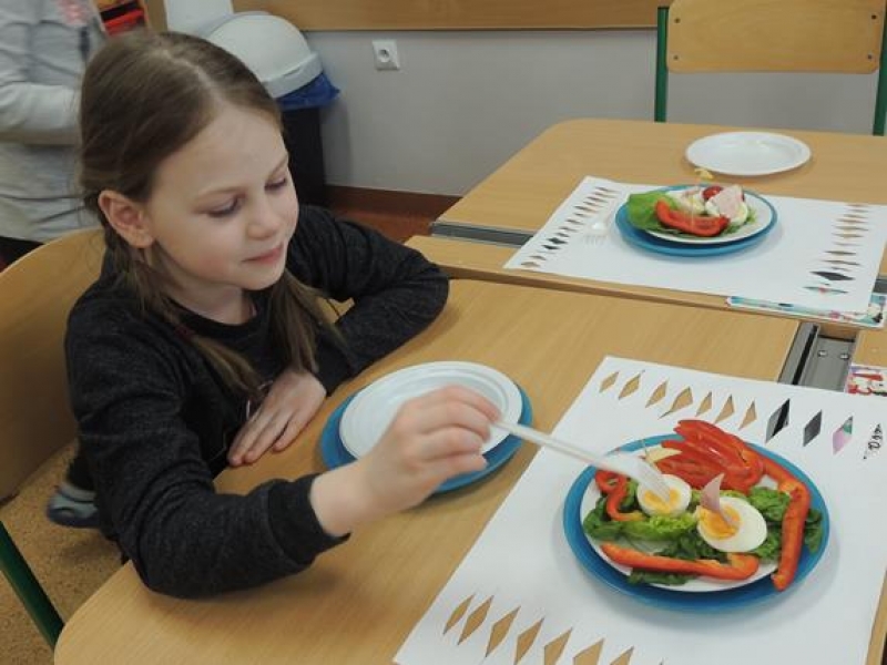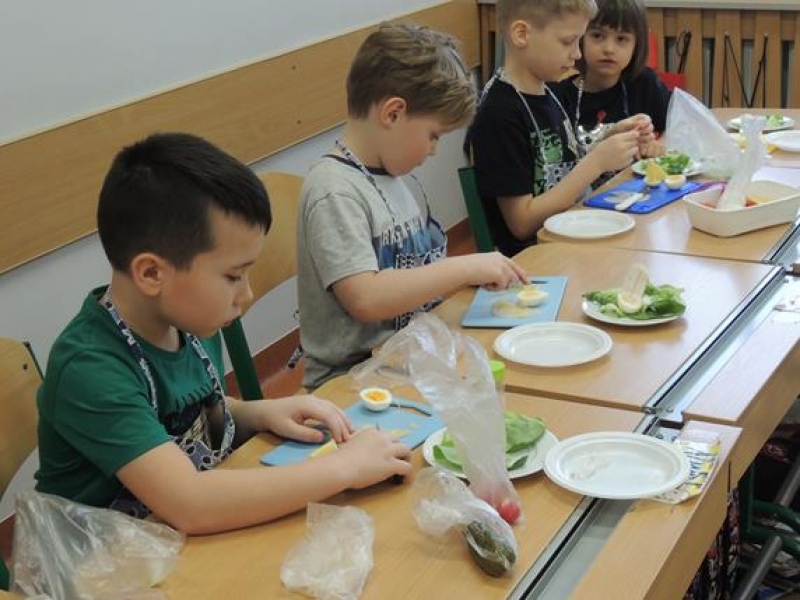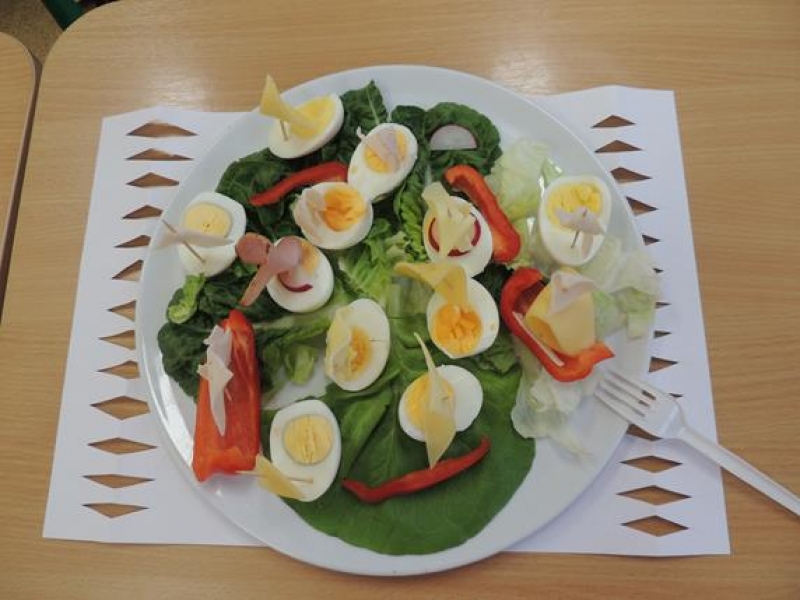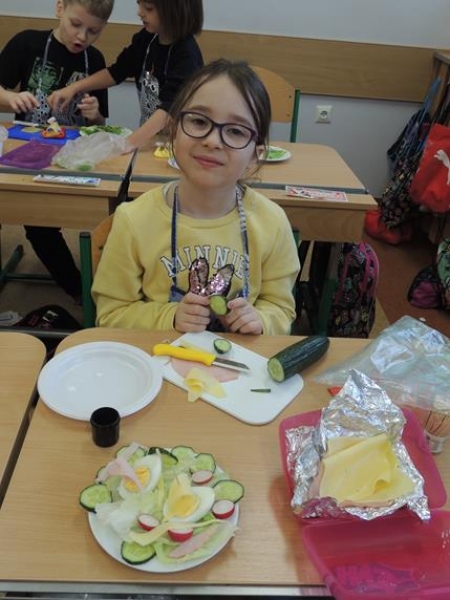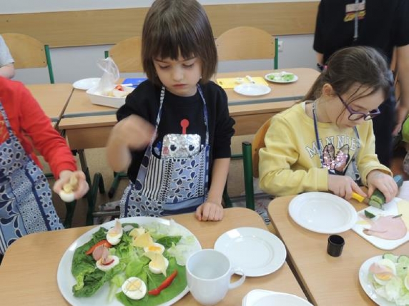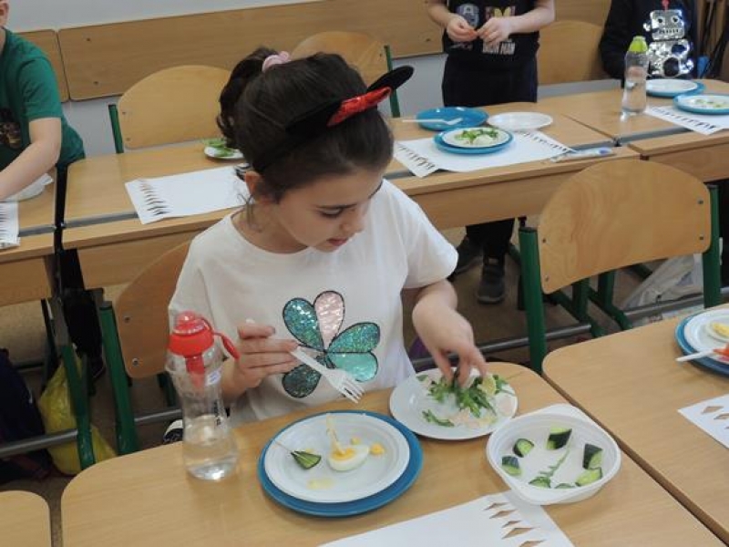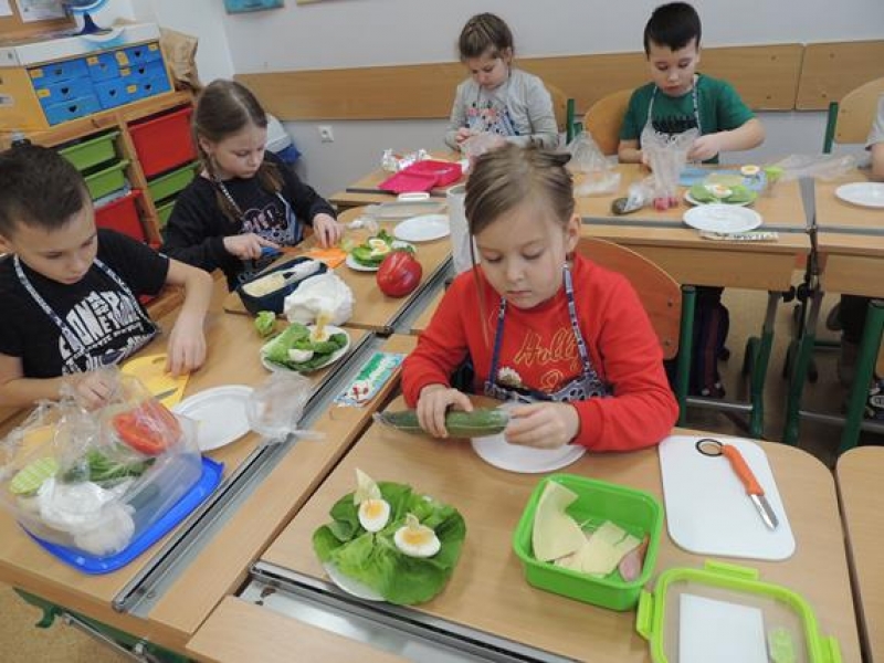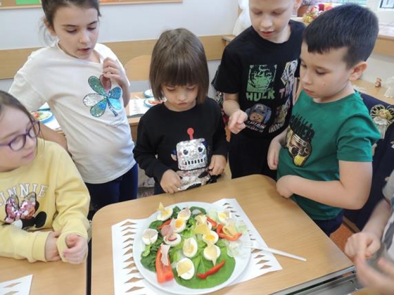 Uczniowie klasy pierwszej ostatnio poznali literę ,,j” jak jajko. W nawiązaniu do tego podczas warsztatów kulinarnych przygotowali potrawę z jajek. Były to regaty na liściach sałaty. Przygotowane ,,regaty” wyglądały apetycznie i bardzo smakowały dzieciom.