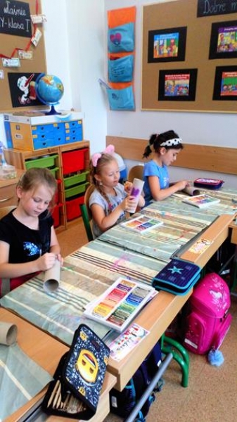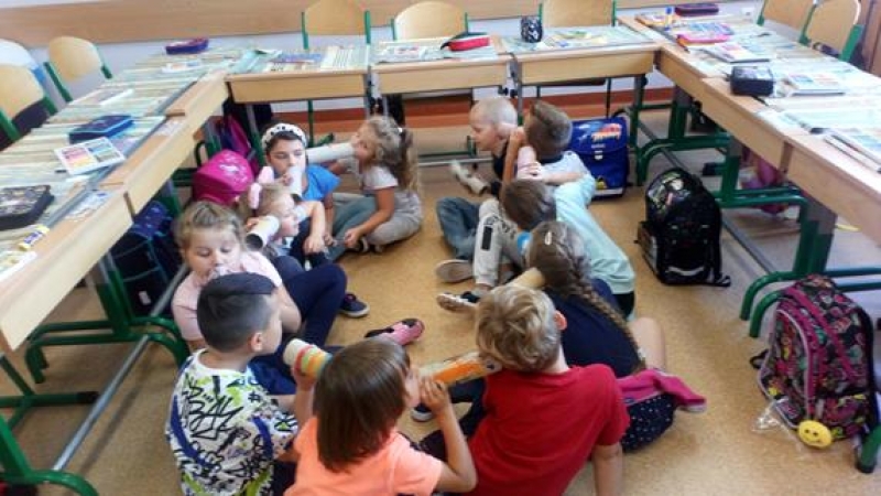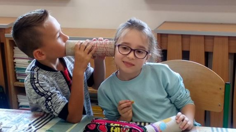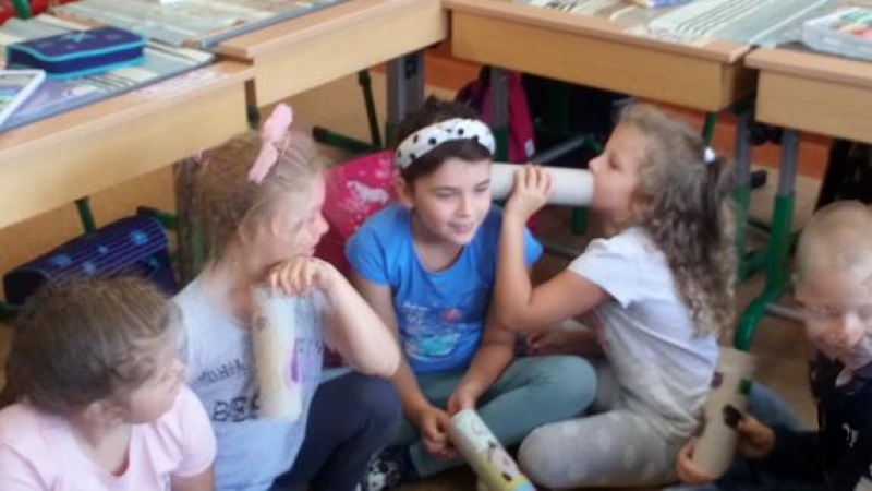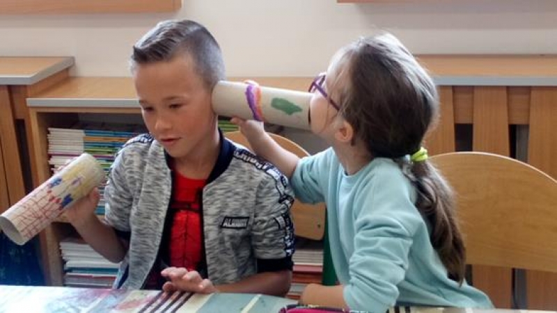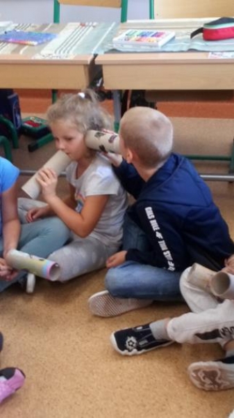 Uczniowie klasy pierwszej podczas zajęć plastyczno – technicznych wykonali pomoce dydaktyczne zwane ,,szeptaczami”. Szeptacze to kartonowe tuby ozdobione w prosty sposób farbami czy kolorowymi materiałami, które mają na celu zwiększyć przyjemność obcowania z tekstami przez to,że pozwalają lepiej wsłuchać się w magię wyrazów składających się na dany tekst. Dzieci użyły wykonanych szeptaczy do wzajemnego przedstawiania się i zabaw słownych.