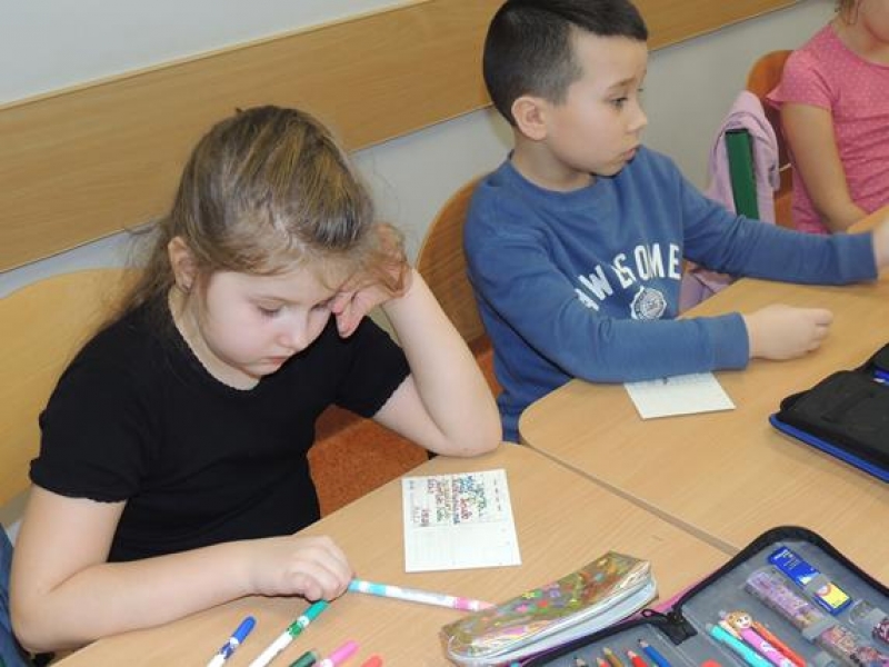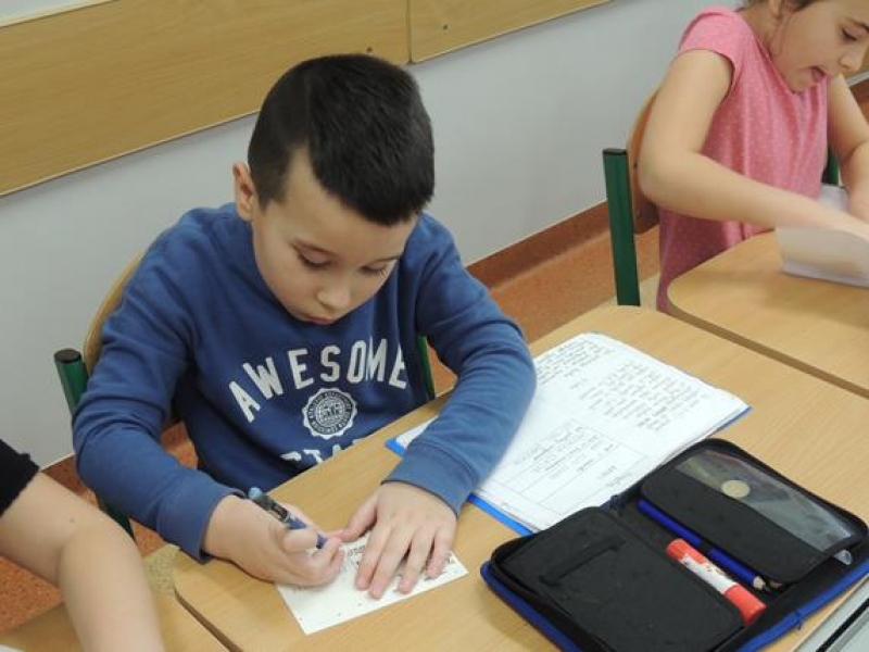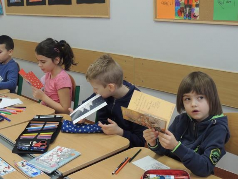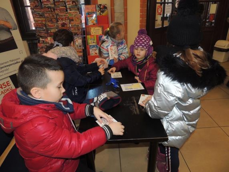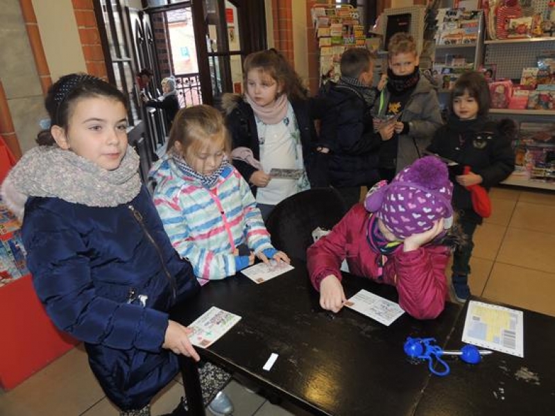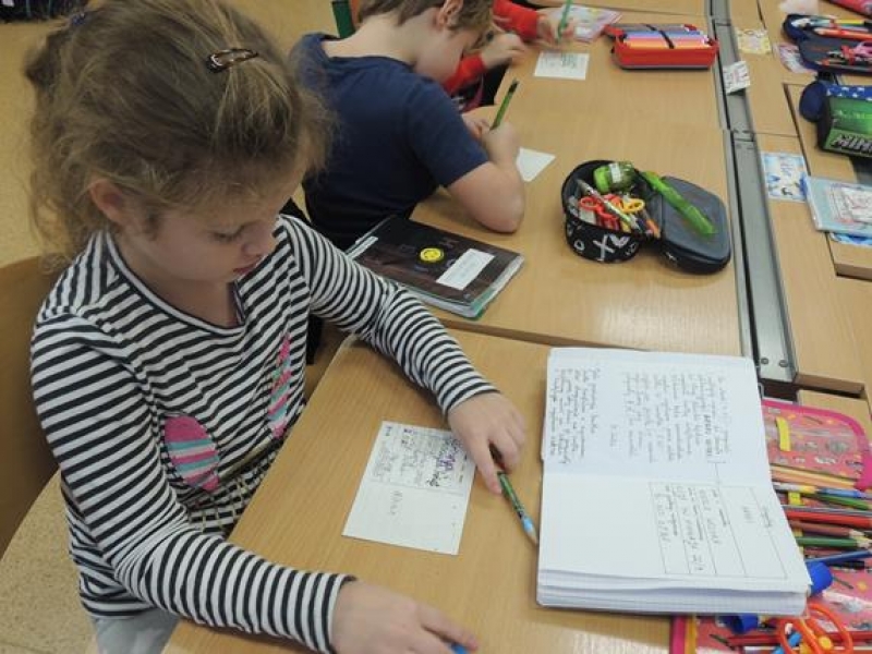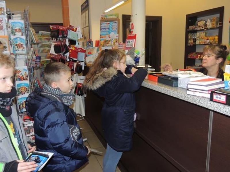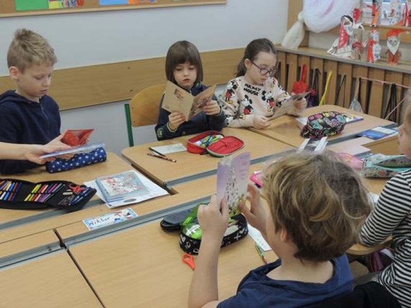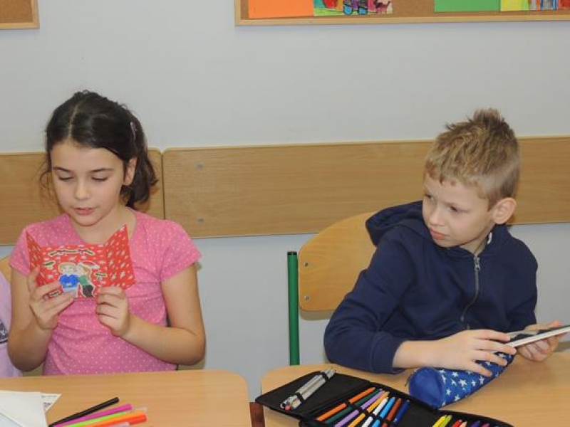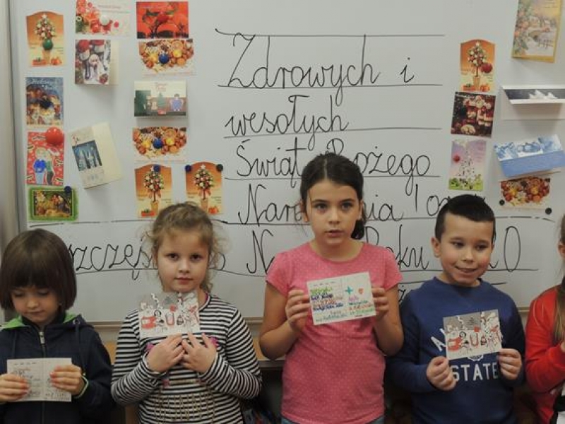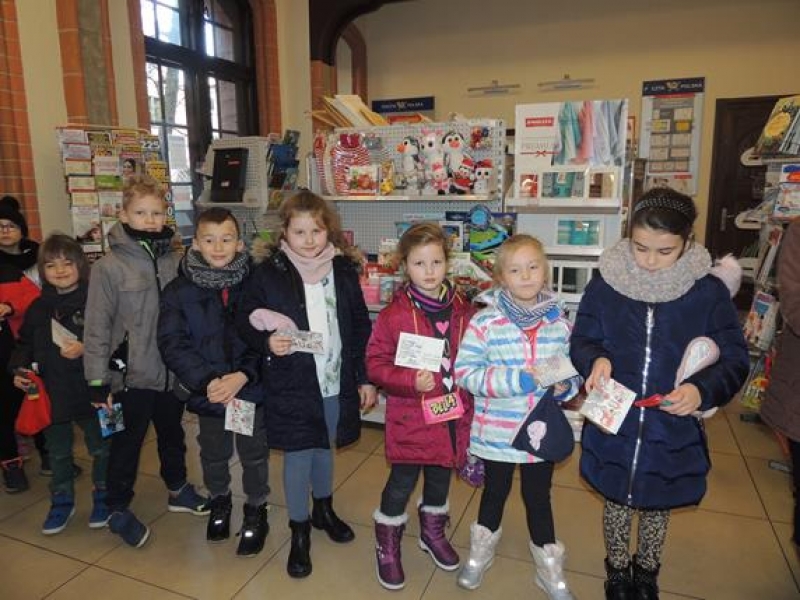 W związku ze zbliżającymi się Świętami pierwszoklasiści omawiali obyczaje bożonarodzeniowe. Wychowawca zwrócił szczególną uwagę dzieci na zwyczaj składania sobie życzeń, ale w oparciu o tradycję wysyłania kartek świątecznych. Dzieci najpierw wspólnie zredagowały życzenia, a następnie pięknie je napisały na kartkach świątecznych, aby osobiście je wysłać do wybranych przez siebie osób. W tym celu ,w czwartek - 5 grudnia – dzieci wybrały się na pocztę. Kultywowanie tej pięknej tradycji było związane z udziałem naszej szkoły w ogólnopolskiej kampanii społecznej ,,Idą święta, nie o sms-ie, lecz o kartce pamiętaj”, propagowanej przez Fundację ,,Dbam o Mój Zasięg”. Dodatkową korzyścią było praktyczne zapoznanie dzieci z drogą przesyłki pocztowej od nadawcy do adresata.