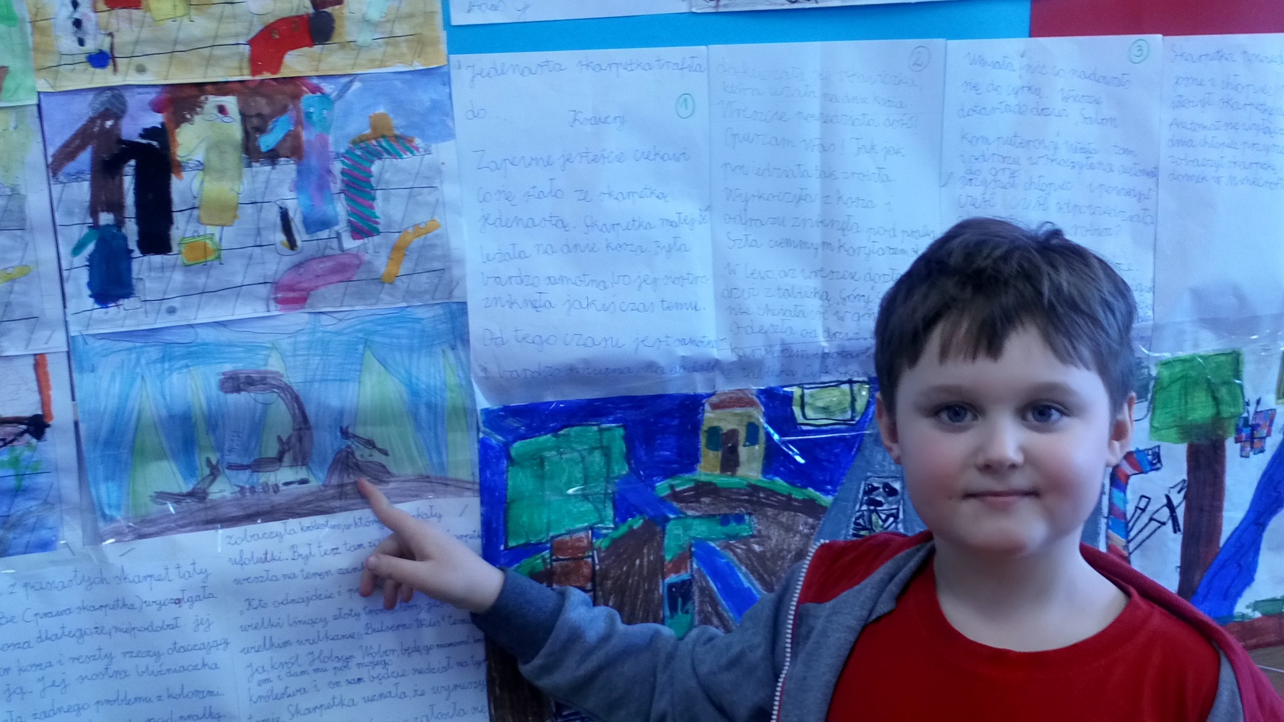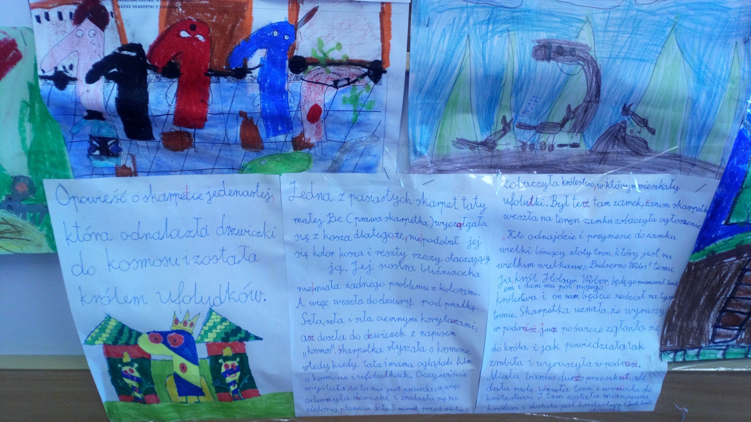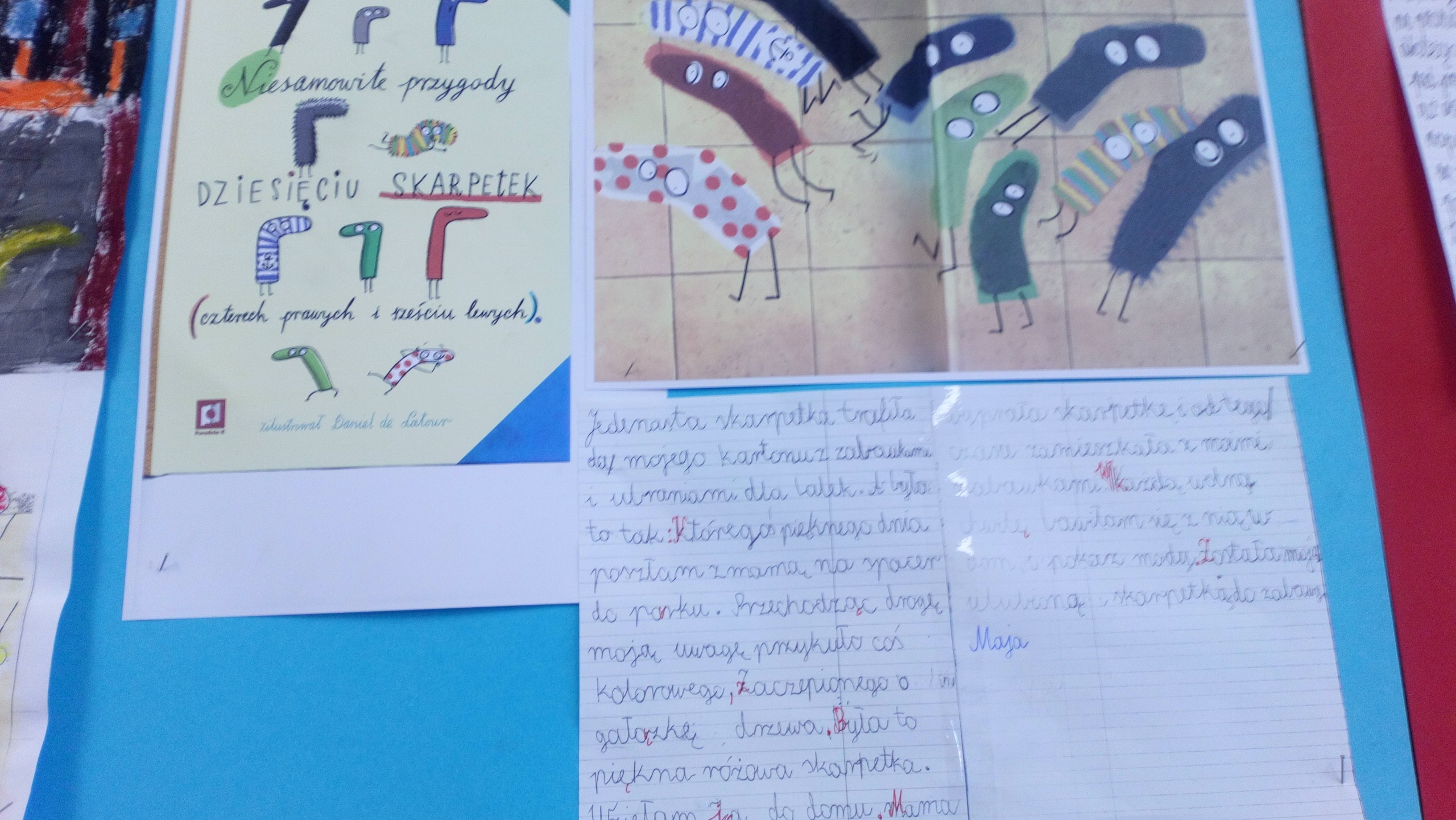 Drugoklasiści, po zapoznaniu się z lektura Justyny Bednarek ,,Niesamowite przygody dziesięciu skarpetek” spróbowali swoich sił w …pisaniu kolejnych rozdziałów tej lektury. Zadaniem dzieci było wymyślenie - opisanie i zilustrowanie - przygody jedenastej skarpetki. Efekty ich pracy znalazły się na klasowej gazetce. Dodatkową atrakcją była możliwość indywidualnego odczytania wymyślonej przygody swoim kolegom i koleżankom w klasie. Taka forma pracy z lekturą przyniosła dzieciom wiele satysfakcji.