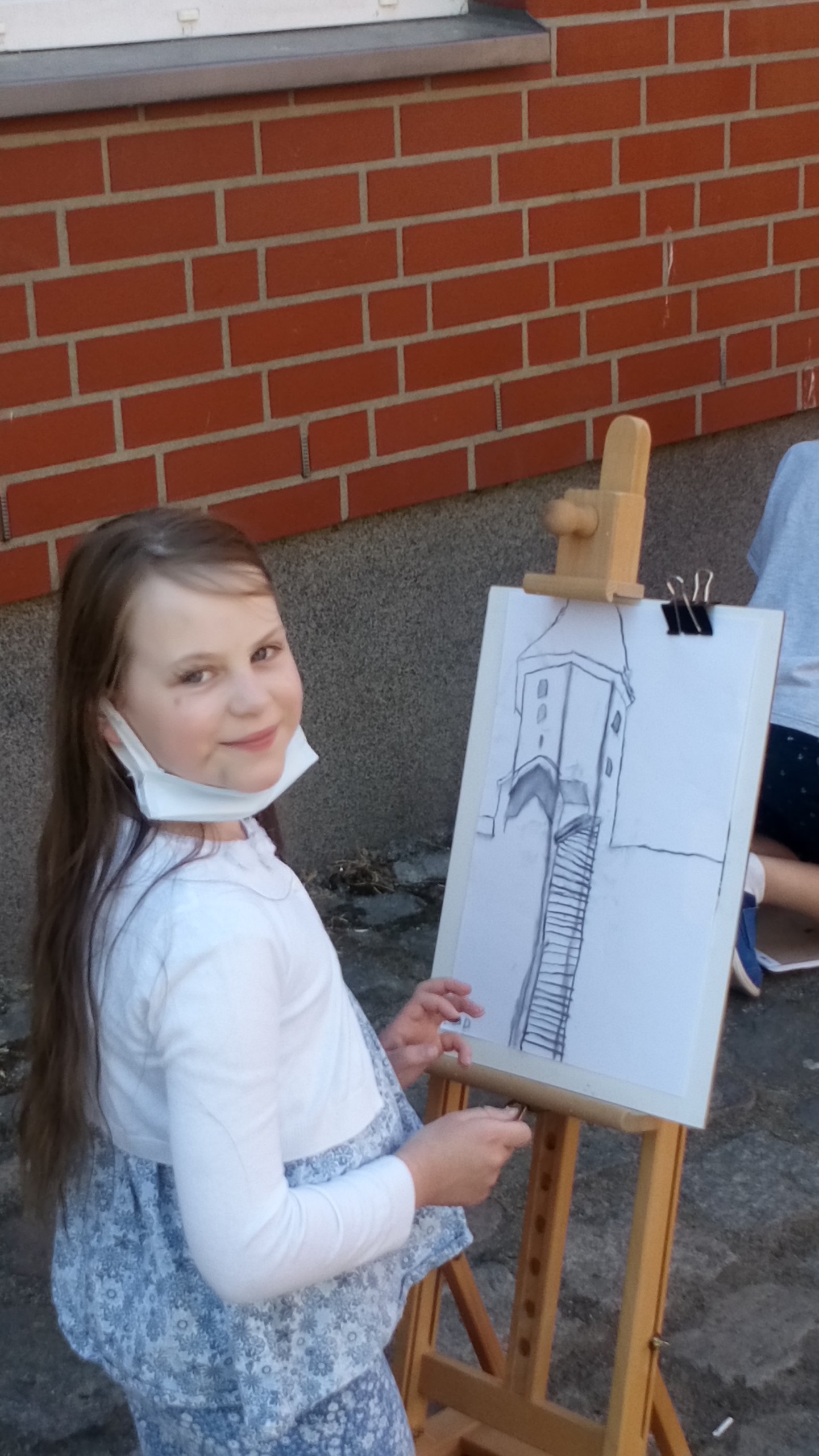 10 czerwca 2021 r., młodzi "artyści" z koła plastycznego, ze sztalugami i węglem plastycznym w rękach, wybrali się w plener malarski, aby uwiecznić jeden z atrakcyjnych zabytków Lęborka - Basztę Bluszczową. Dzieci z przejęciem i rozmachem artystycznym realizowały się podczas wykonywania prac plastycznych. Trzeba przyznać, że efekty ich pracy są niepowtarzalne.