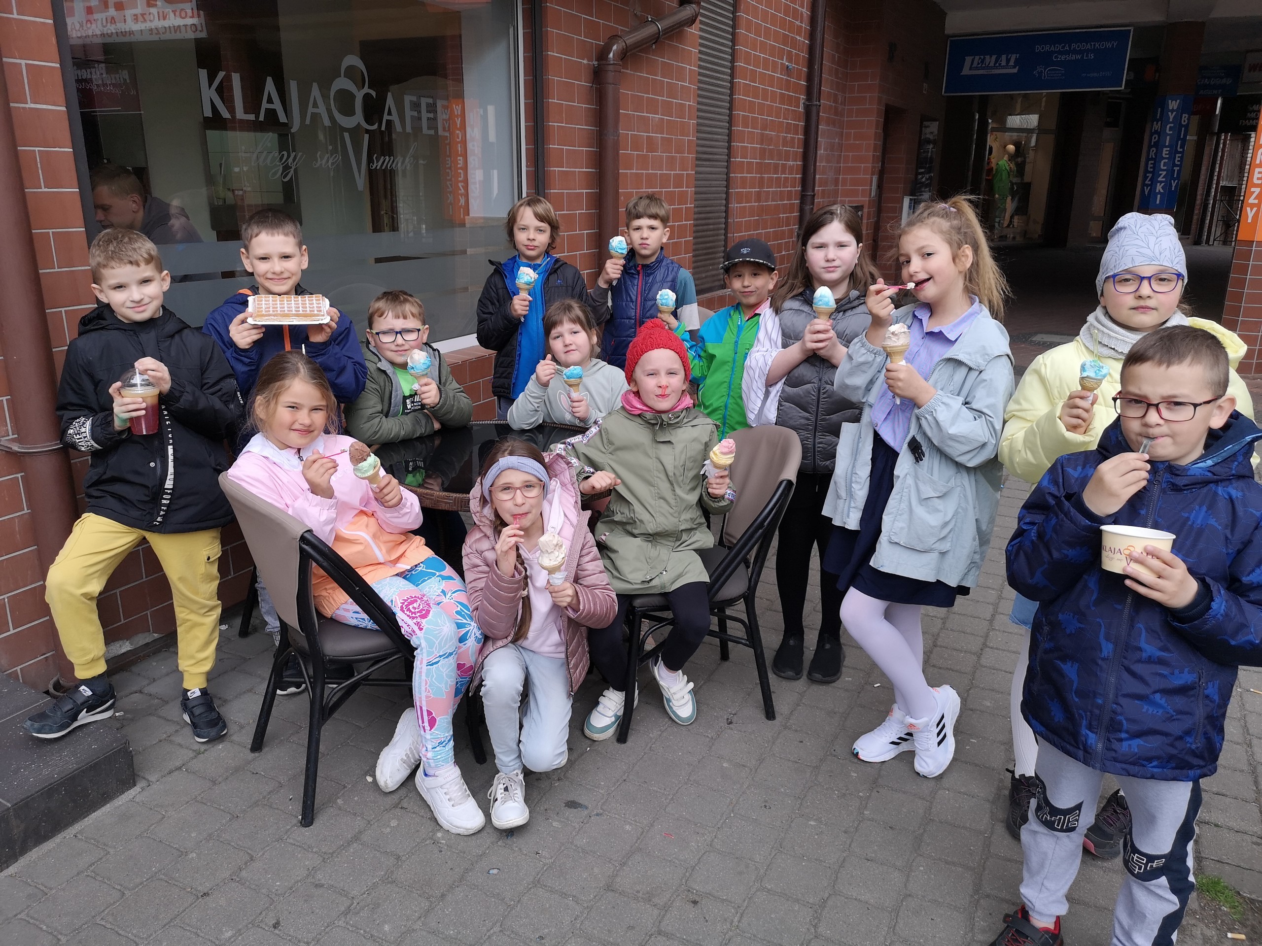 Uczniowie klasy 2a zrealizowali bon, który był wygraną w szkolnym konkursie na najpiękniejszą palmę wielkanocną i wybrali się do lodziarni "Klaja Cafee".