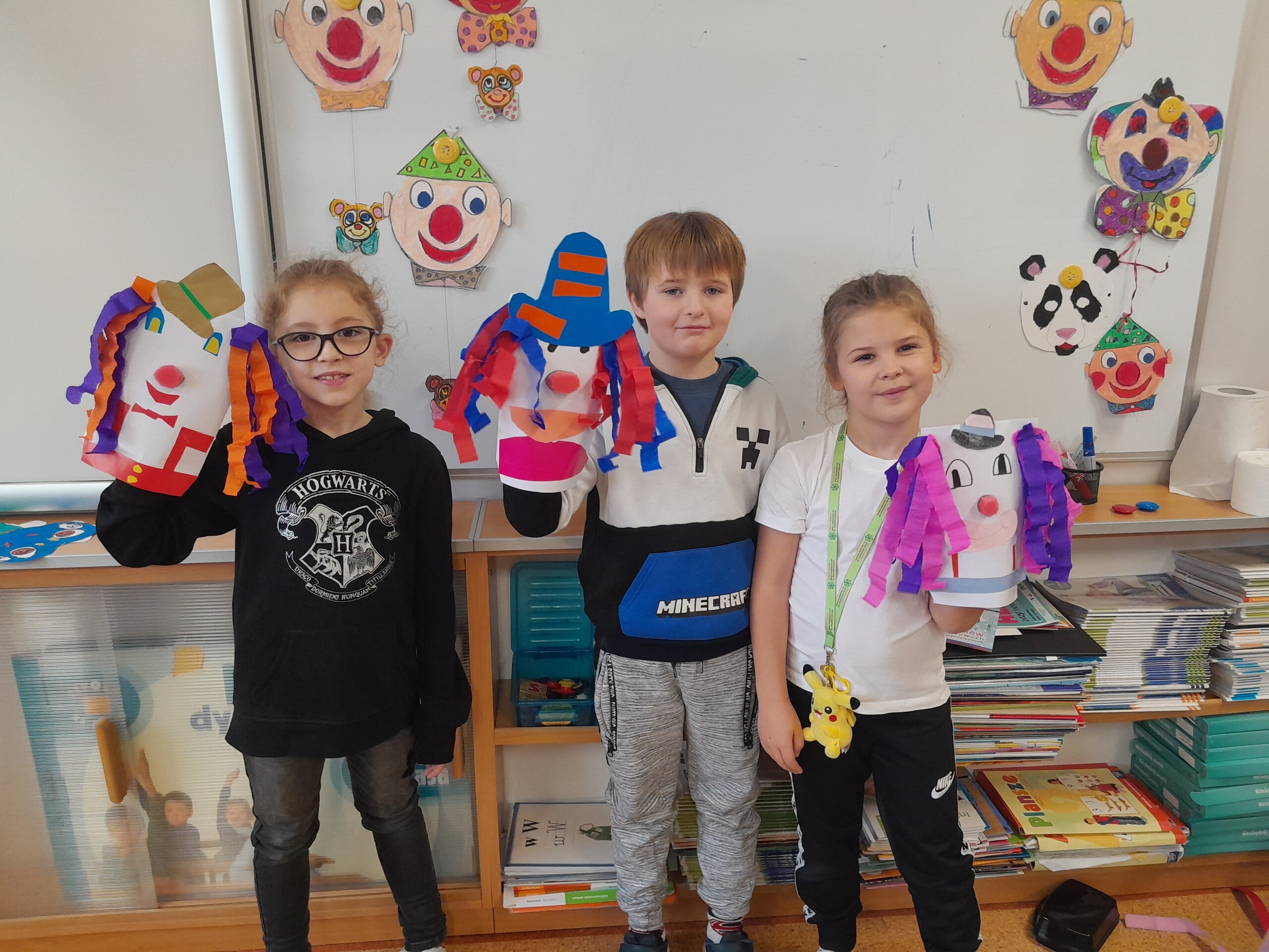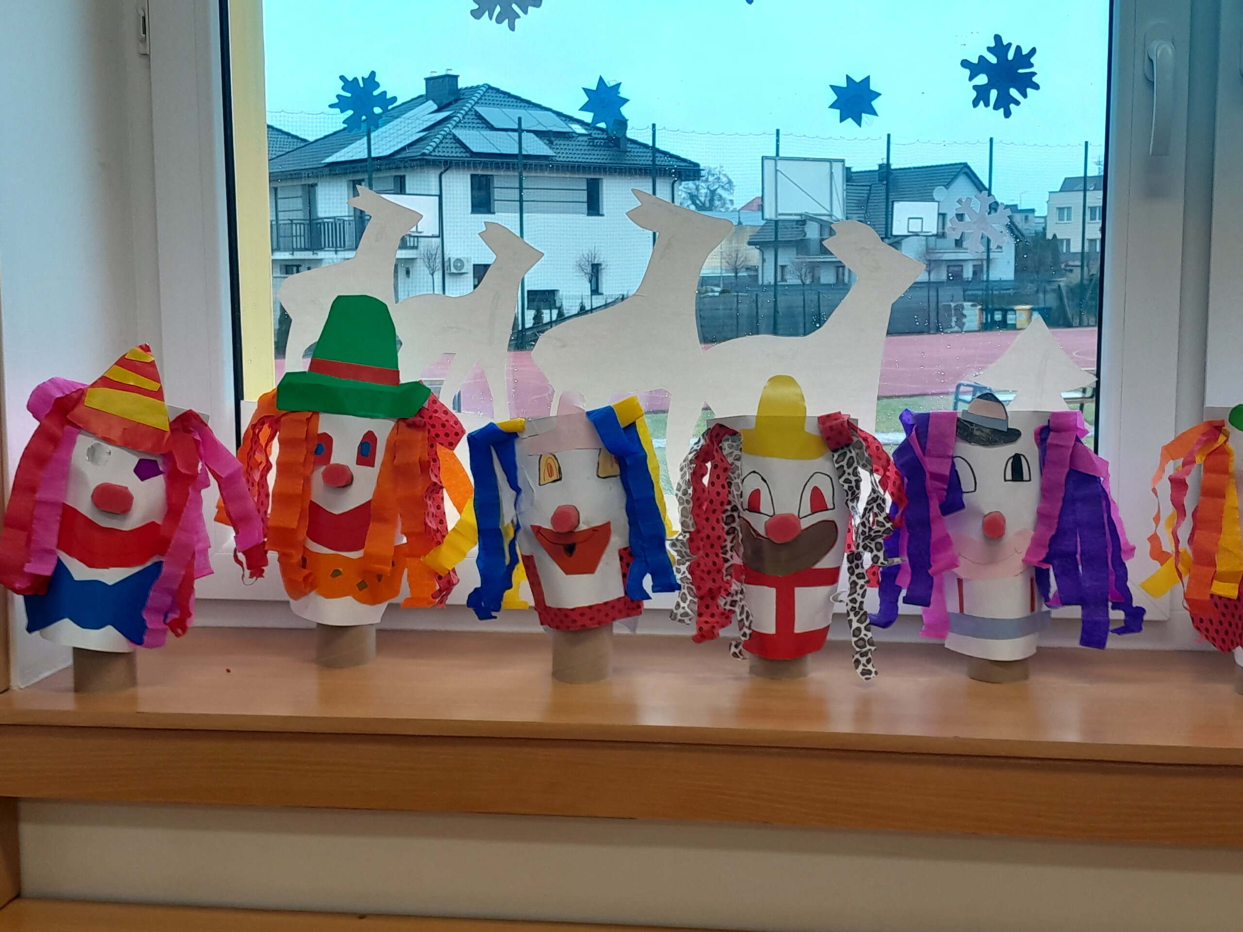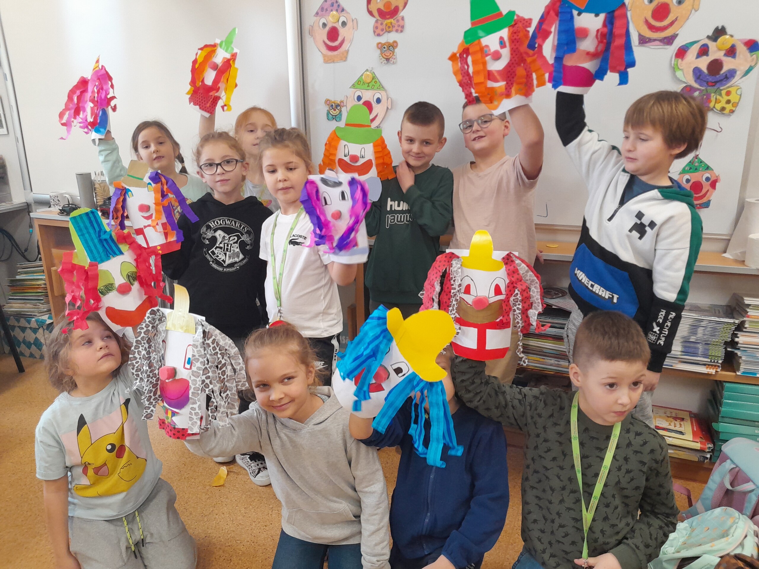 Karnawał w pełni, więc pierwszaki przygotowały kolorowe klauny do udekorowania swojej sali. Dzieci wykazały się dużą pomysłowością i zręcznością, co spowodowało, że efekty ich pracy pięknie prezentują się na gazetce szkolnej.
