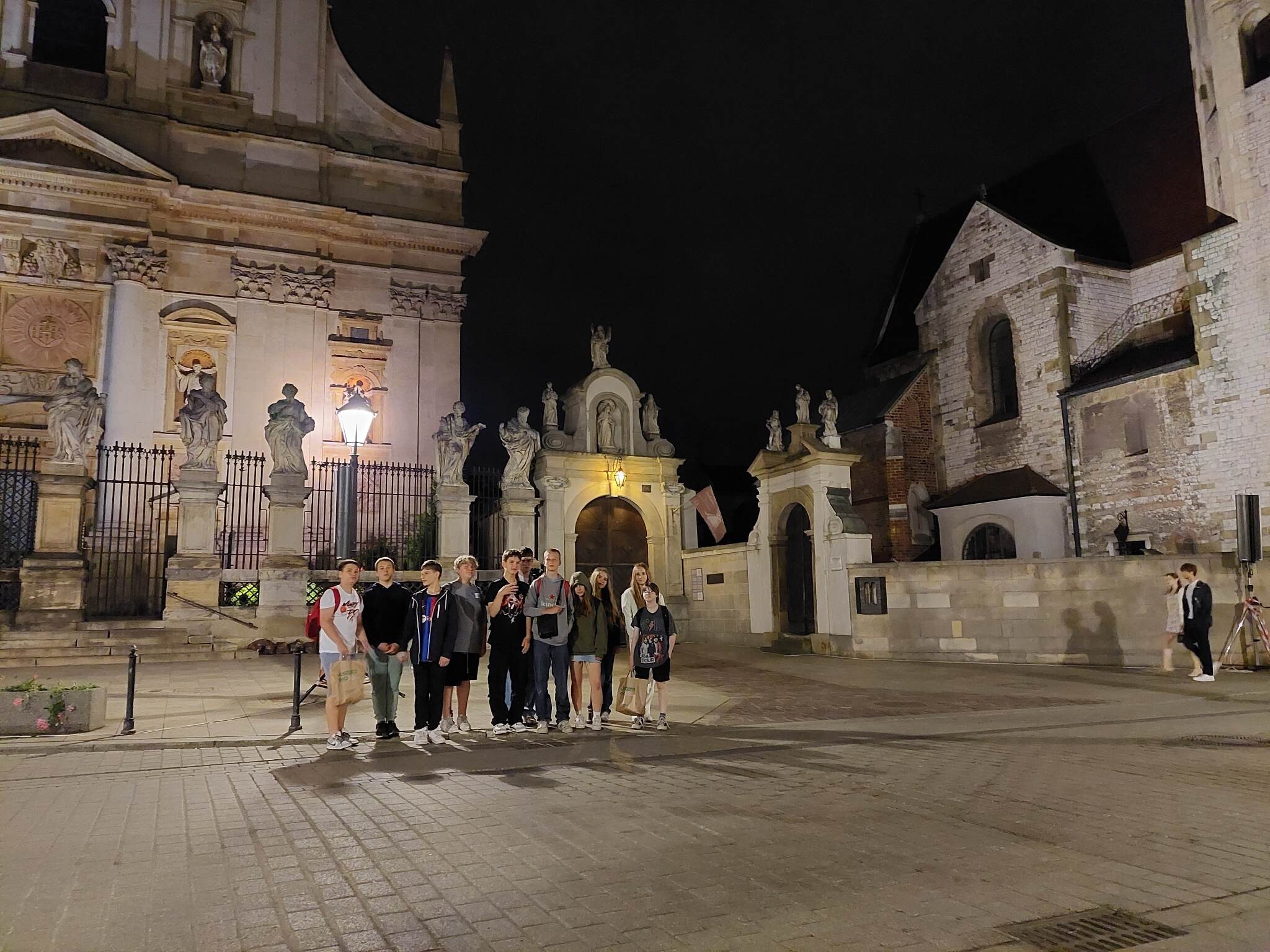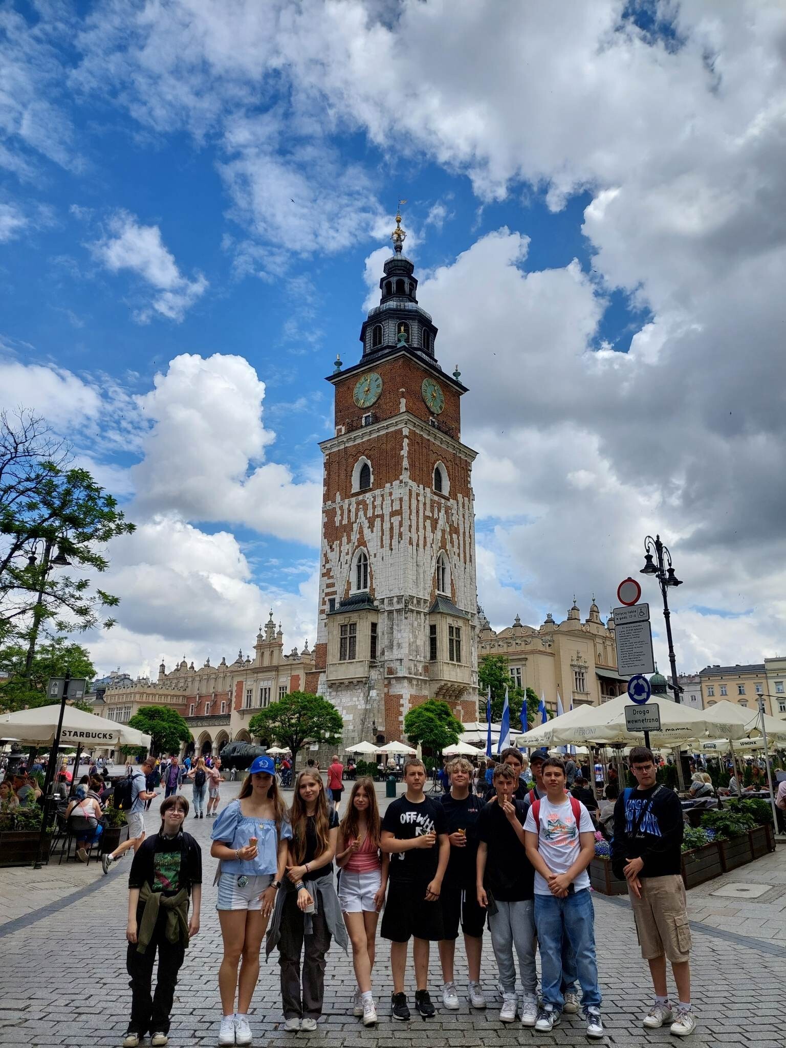 Po przyjeździe w poniedziałek rano wyruszyliśmy na zwiedzanie Wawelu, odwiedziliśmy m.in. Katedrę na Wawelu, grobowce, Dzwon Zygmunta i Smoczą jamę. Przespacerowaliśmy się najpiękniejszymi ulicami Krakowa- ul. Kanoniczną i Grodzką, udaliśmy się na Rynek, by zwiedzić najważniejsze miejsca- m.in. Sukiennice i Bazylikę Mariacką, udało nam się usłyszeć hejnał mariacki. Wieczorem udaliśmy się na Bulwary wiślane, gdzie część uczniów miała okazję podziwiać panoramę Krakowa z perspektywy lotu balonem. Następnego dnia wyruszyliśmy na wyprawę do uroczyska, w którym mieszczą się Skałki Twardowskiego oraz Zalew Zakrzówek- zwany „małą Chorwacją”, gdzie powstały niesamowite pływające baseny. Część uczniów zdecydowała się skorzystać z nowopowstałej infrastruktury kąpieliska. Po wspólnym obiedzie pojechaliśmy do krakowskiego aquaparku. Po wspaniałej zabawie w sportowym duchu wróciliśmy na Stare Miasto i tam w samym centrum przy muzyce na żywo spożyliśmy kolację. Ostatniego dnia naszej wyprawy zjedliśmy wspólne śniadanie w urokliwej kafejce, po raz ostatni zajrzeliśmy do Sukiennic, by zakupić pamiątki, wybraliśmy się na lody i wyruszyliśmy w stronę Wieliczki. Tam czekała na nas przygoda w kopalni. W szybie górniczym Regis, którego historia sięga XIV wieku i który jest nadal czynny, odbyliśmy szkolenie na górników. Trasą górniczą oprowadzał nas prawdziwy sztygar. Zeszliśmy na głębokość 101 metrów, po drodze zapoznając się z tajnikami pracy na kopalni dawniej i dziś. Mogliśmy doświadczyć prawdziwej ciemności, zapoznać się z pracą w kieracie, odszukać drogę na mapce, a nawet „zdetonować ładunki” wybuchowe ;) Po zakończonej pracy w kopalni wróciliśmy do Krakowa na zasłużony obiad. Uczniowie dostali czas wolny na ostatnie zakupy w Krakowskiej Galerii Handlowej połączonej z dworcem. Rankiem 08.06.2023r. wróciliśmy do Lęborka- wyspani i we wspaniałych nastrojach. To był bardzo udany wyjazd, pełen wrażeń i niepowtarzalnych przeżyć, które zostaną z nami na zawsze!