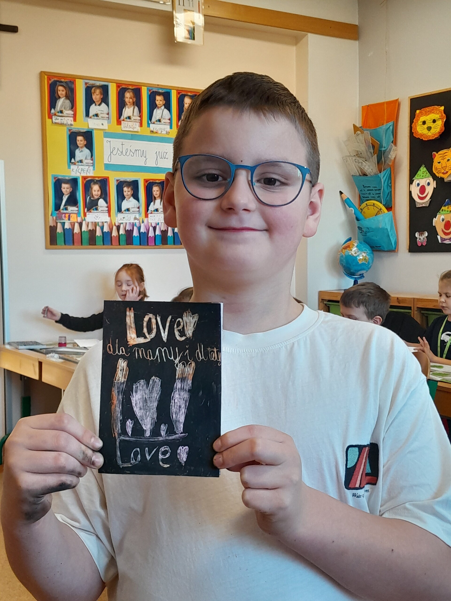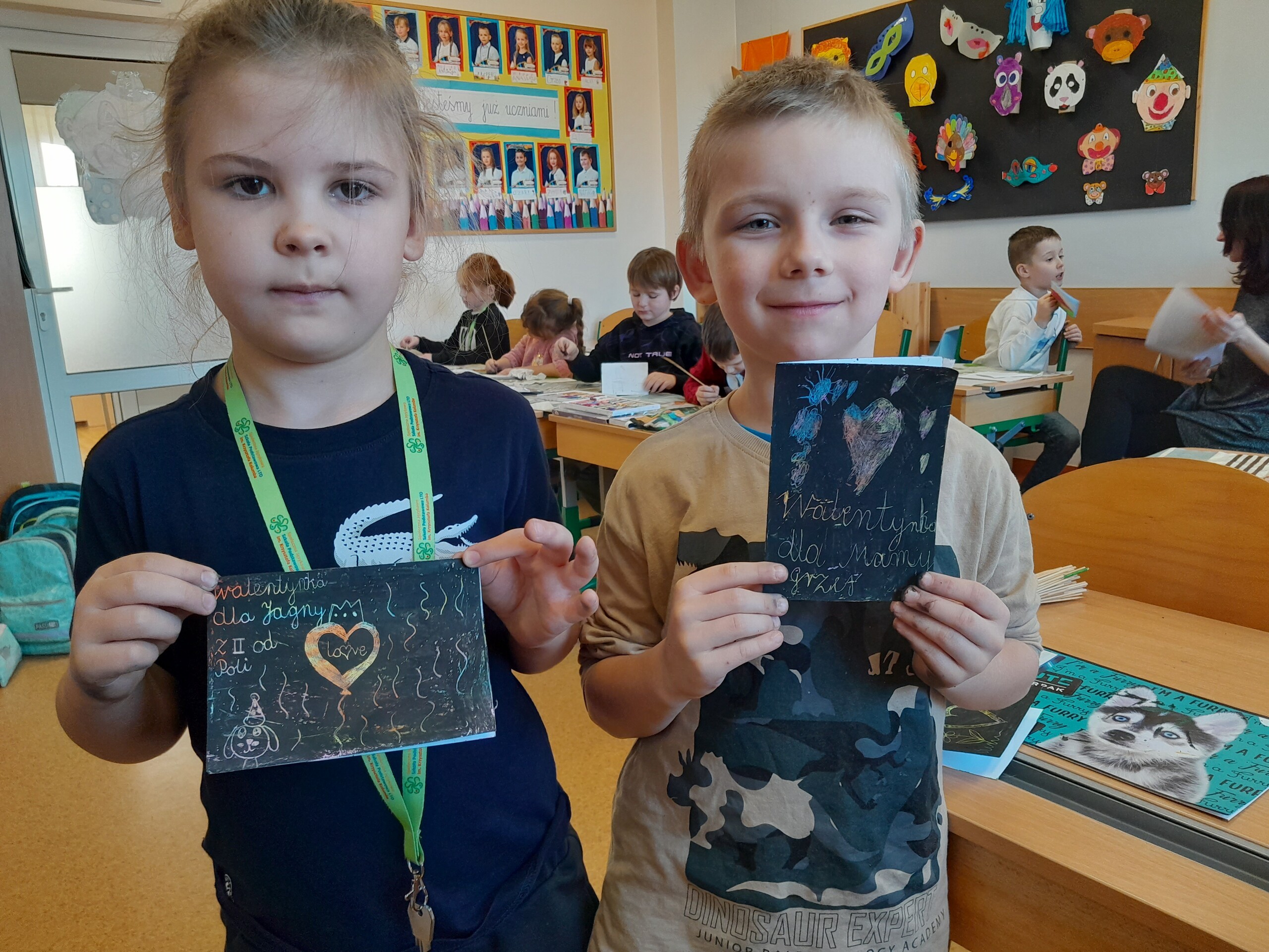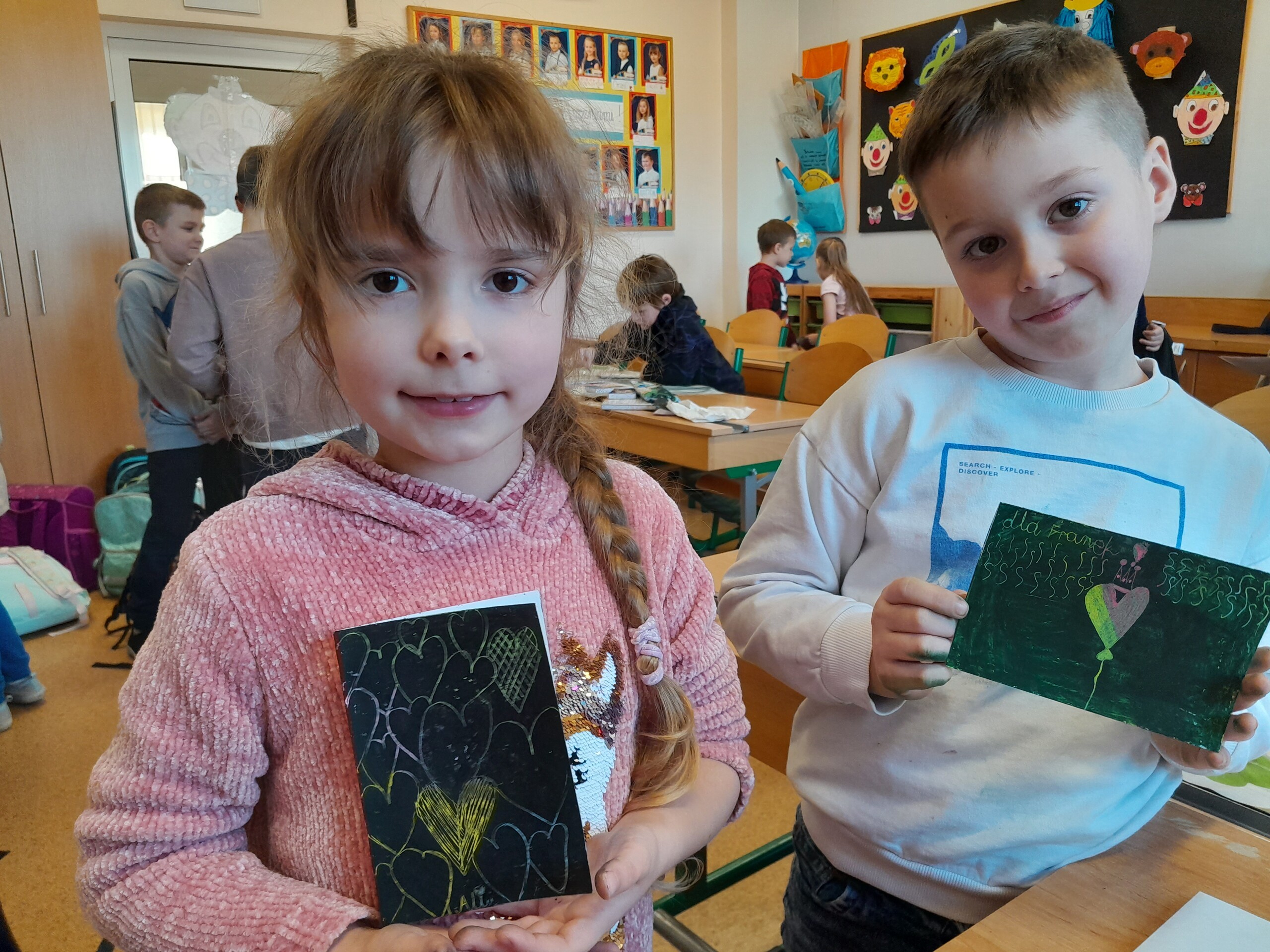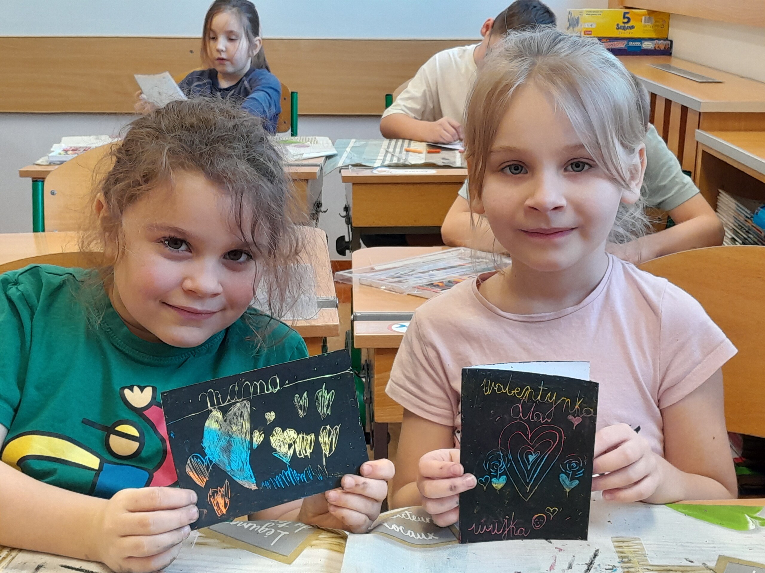 Uczniowie klasy pierwszej wykonali ,,walentynki" wykorzystując ciekawą technikę plastyczną, jaką jest "sgrafitto", czyli wydrapywanka. Kartki walentynkowe wyszły im przepięknie!
