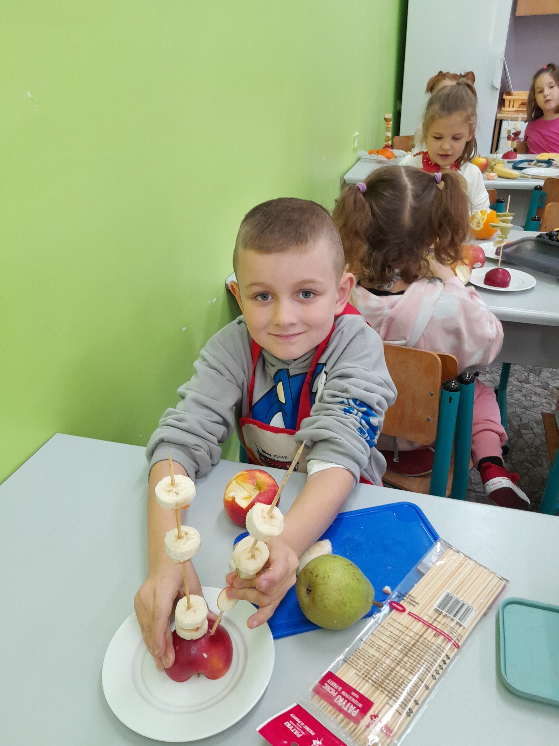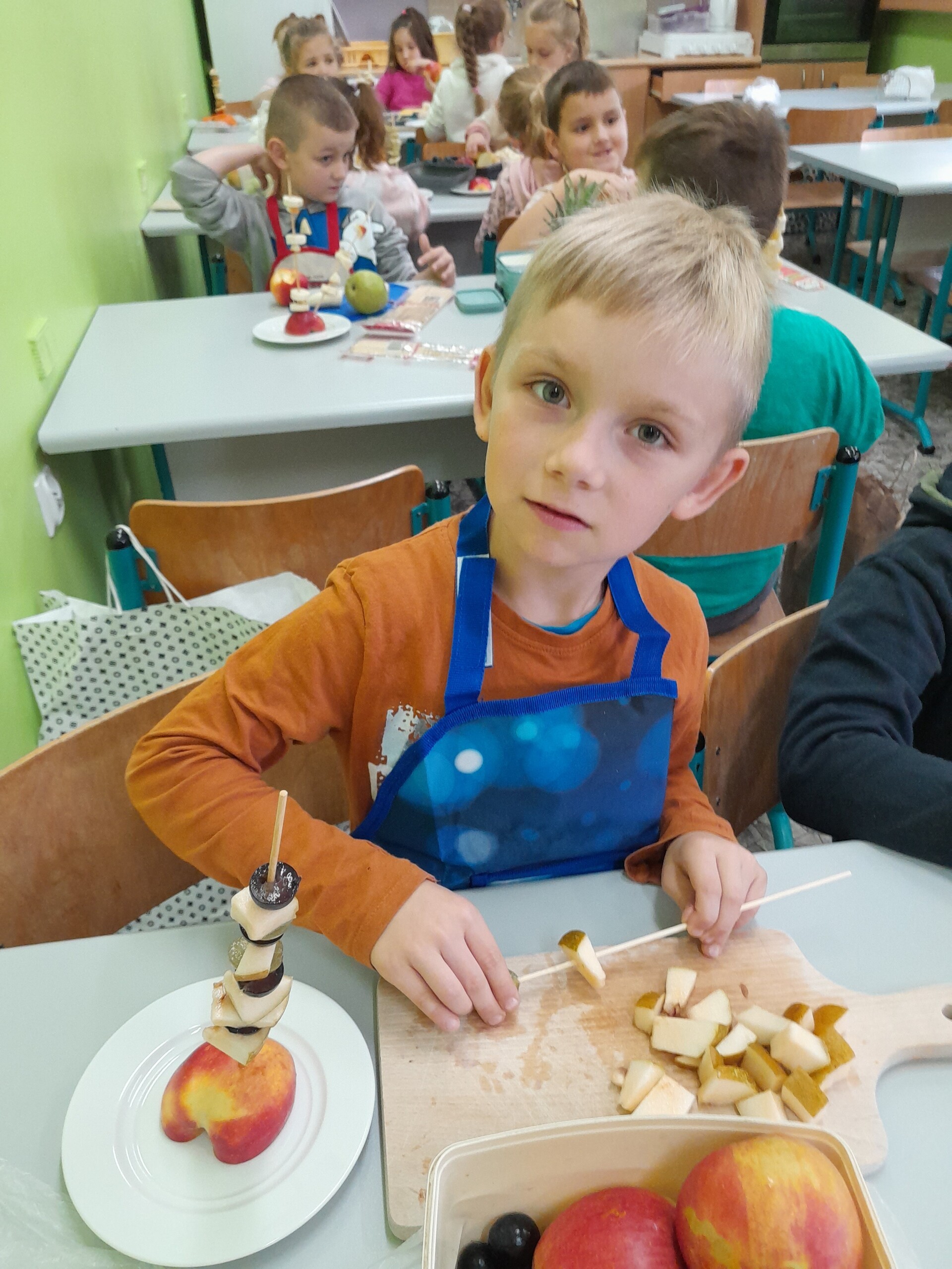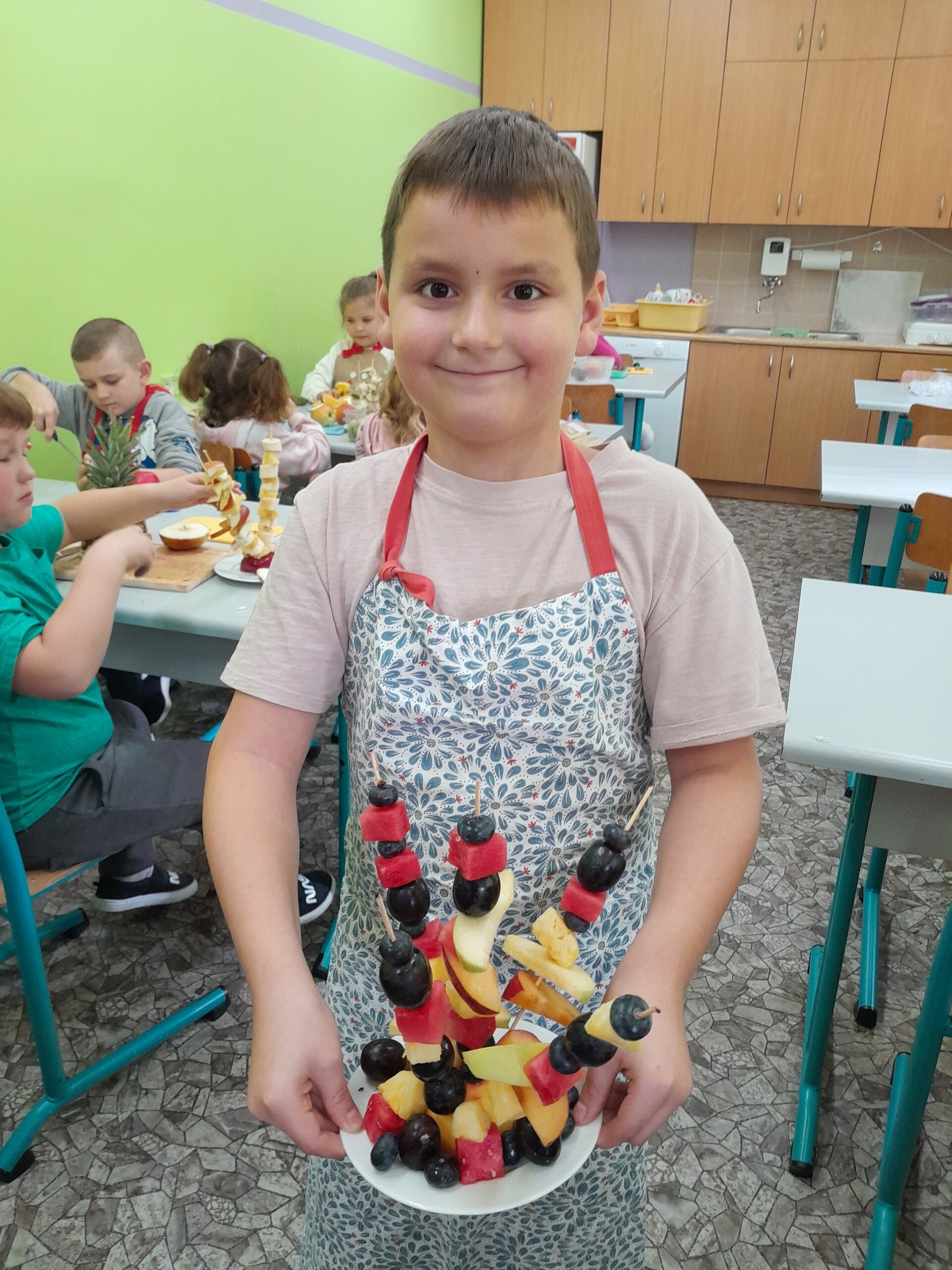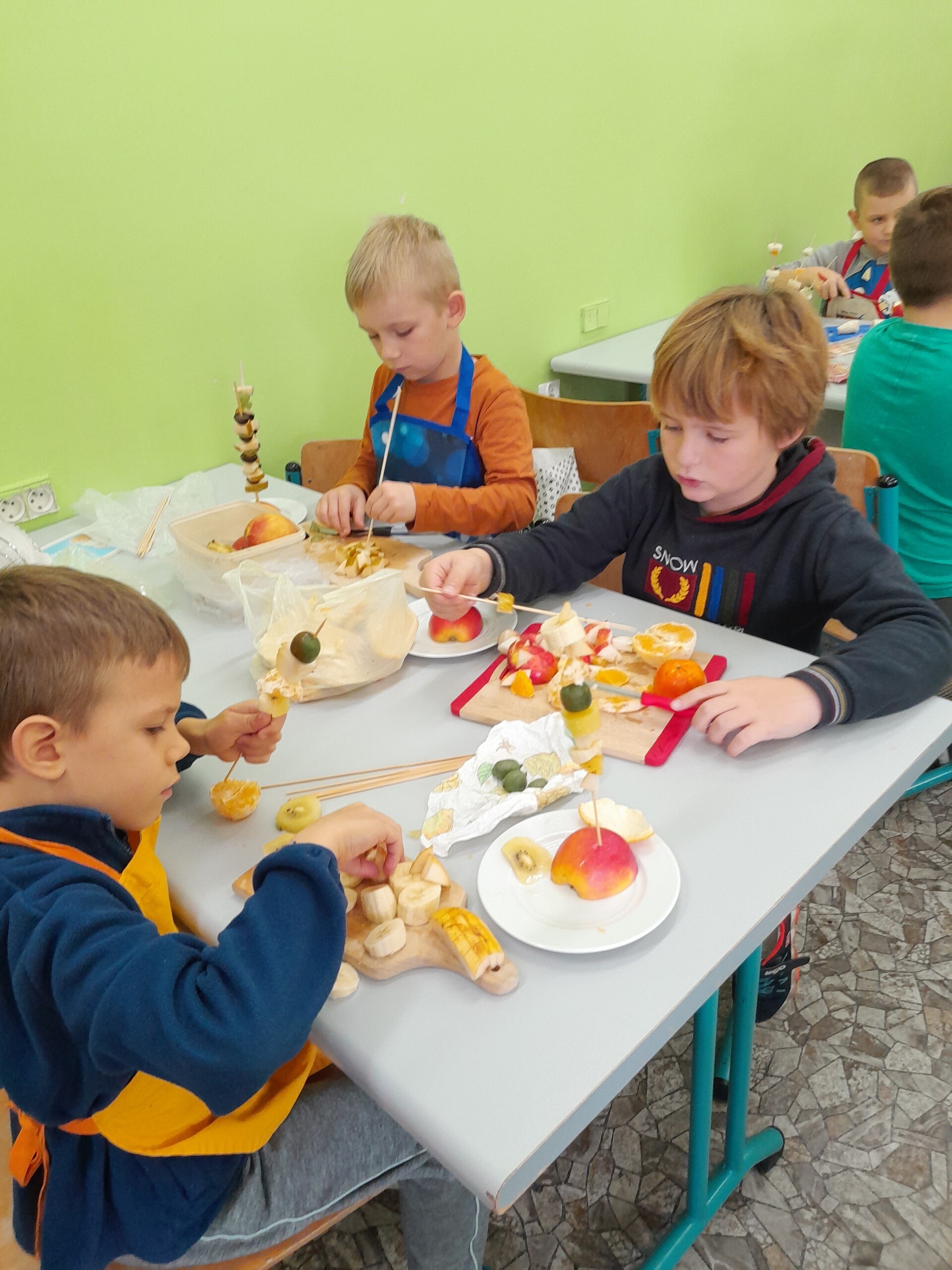 17 października 2022 r., uczniowie klasy pierwszej, w ramach zajęć kulinarnych przygotowali zdrowe i kolorowe danie z owoców. Były to "jeżyki” na jabłkach. Dzieci wspaniale poradziły sobie z krojeniem owoców na kawałki oraz nabijaniem ich na patyczki szaszłykowe. Tak przygotowane owocowe szaszłyki były umieszczane na połówkach jabłka jako "jeżykowe kolce”. Wyglądało to bardzo apetycznie, no i było i smaczne i bardzo zdrowe.