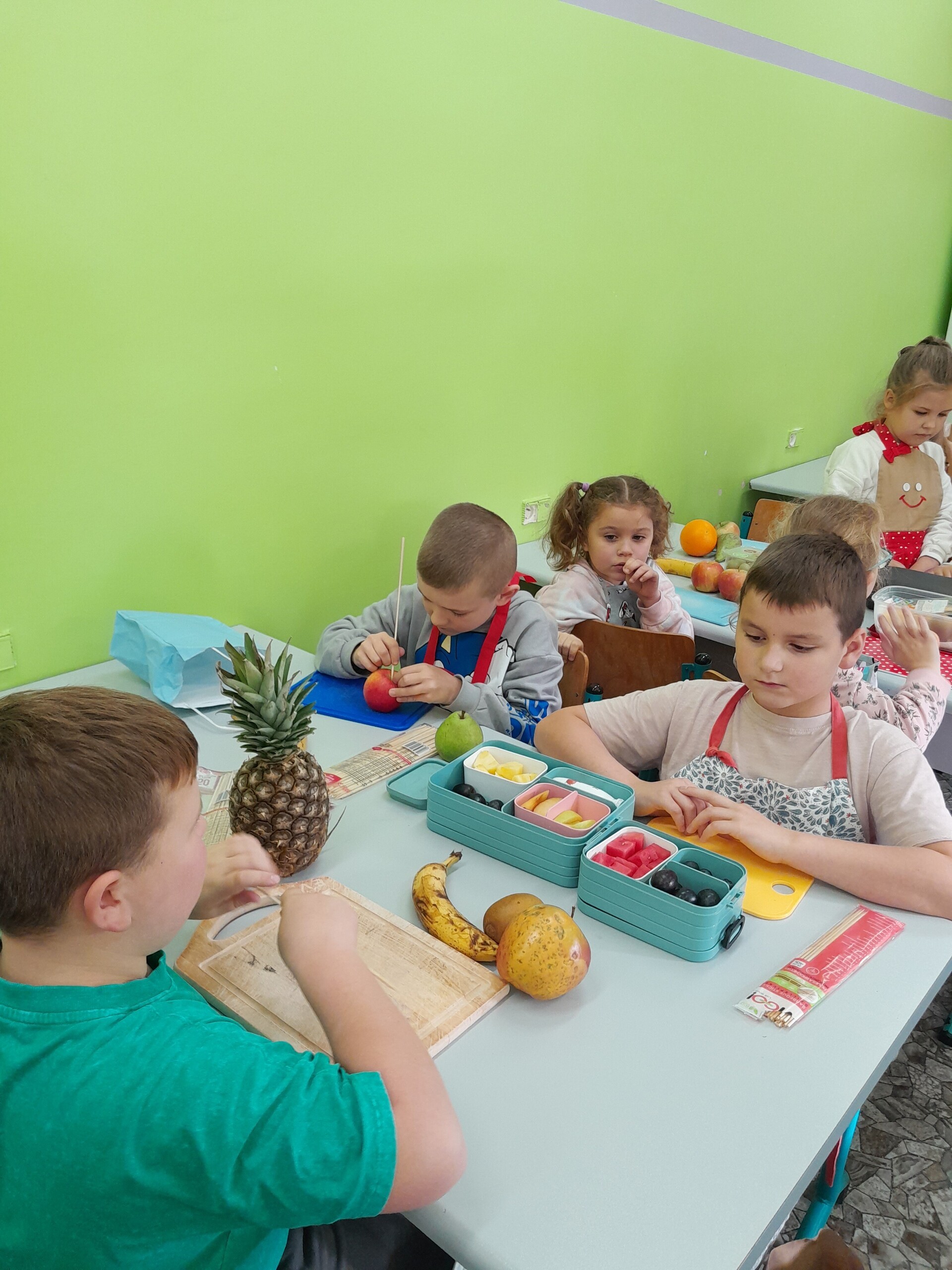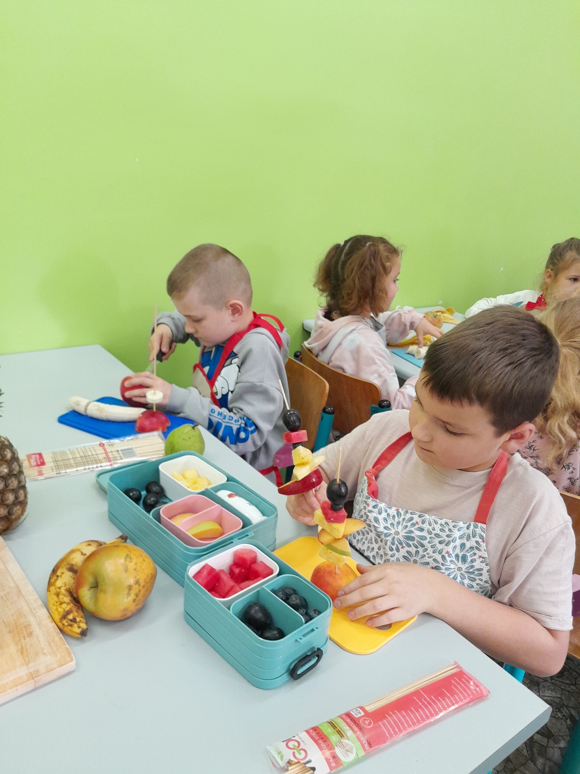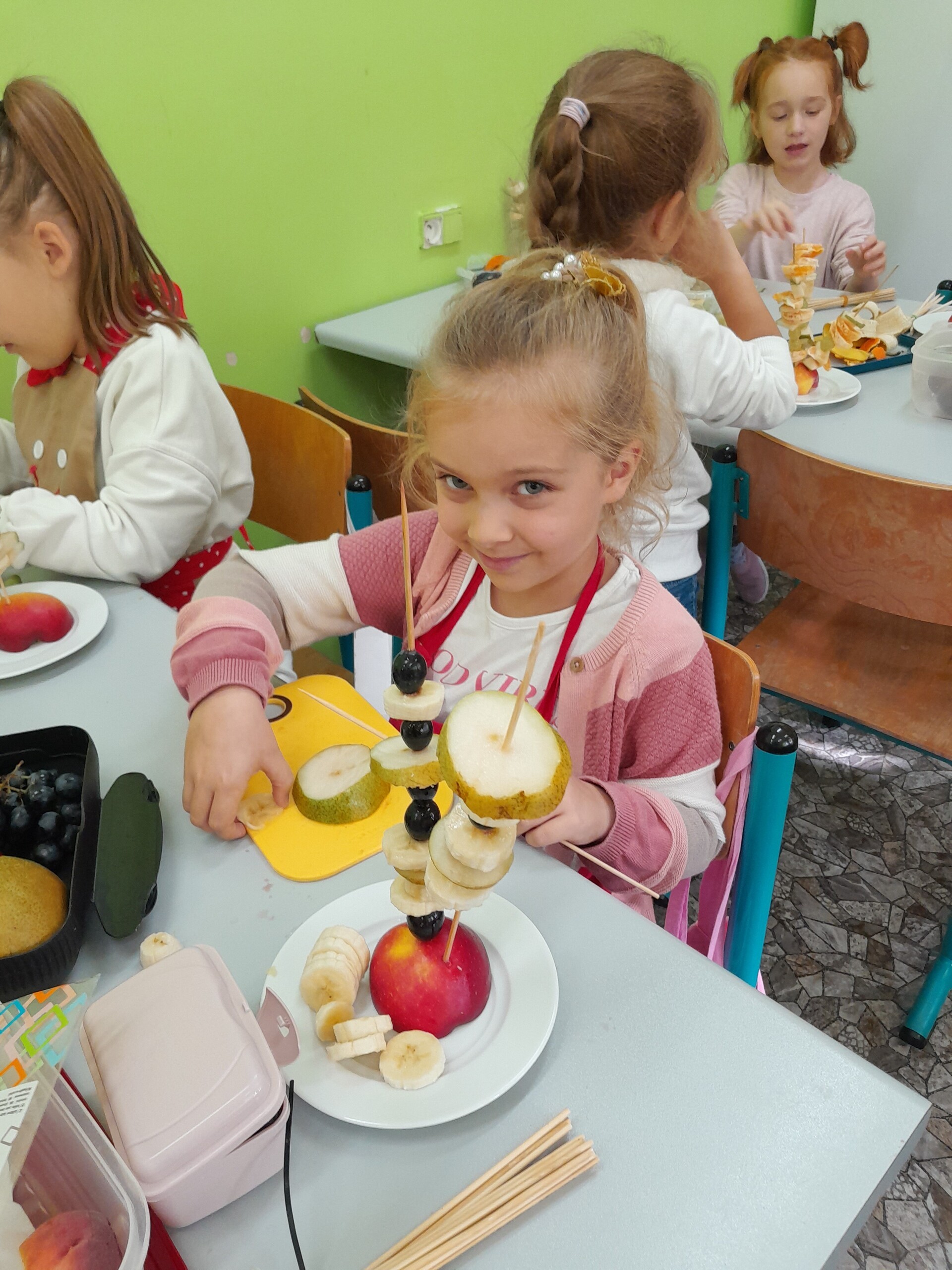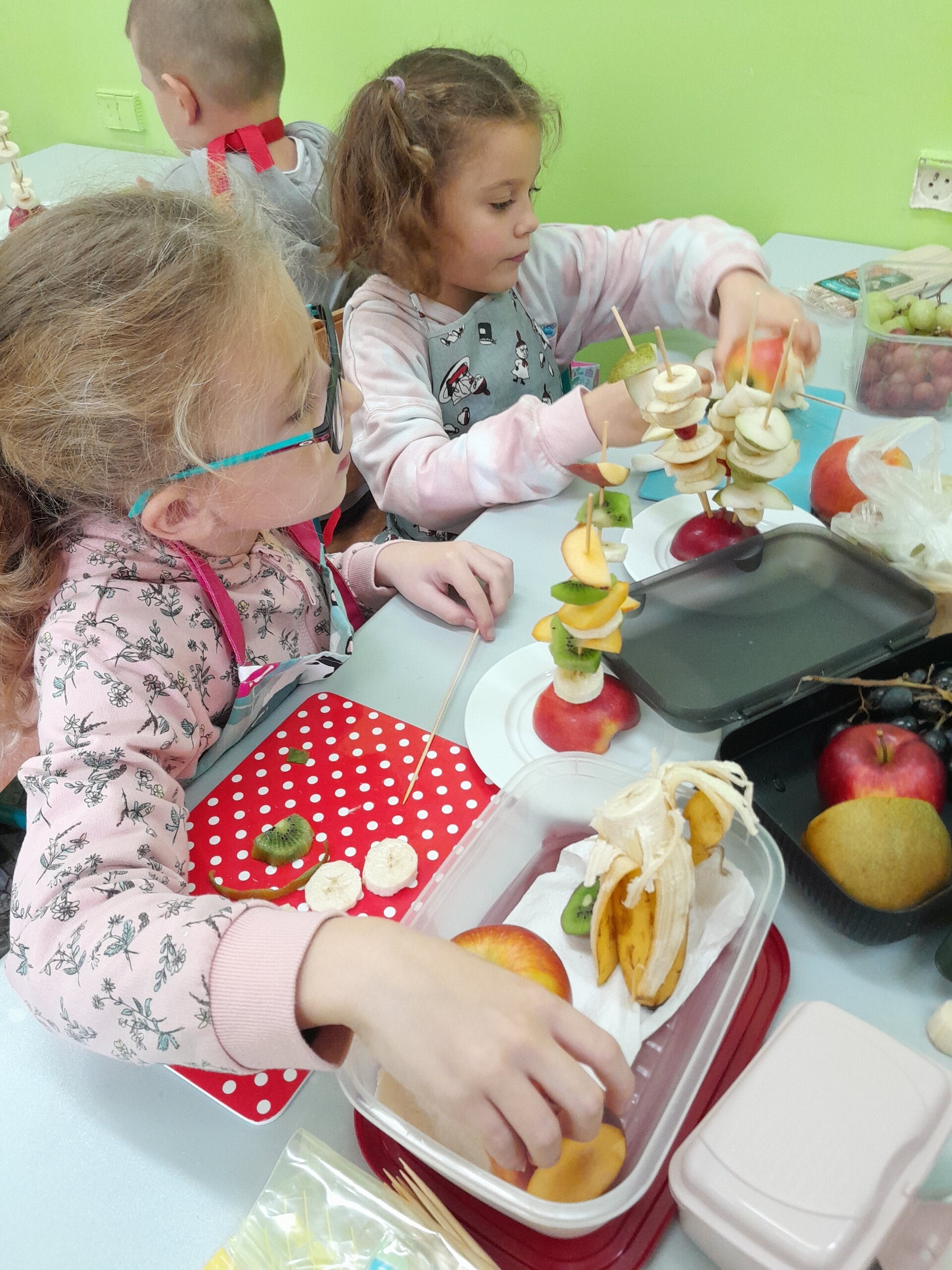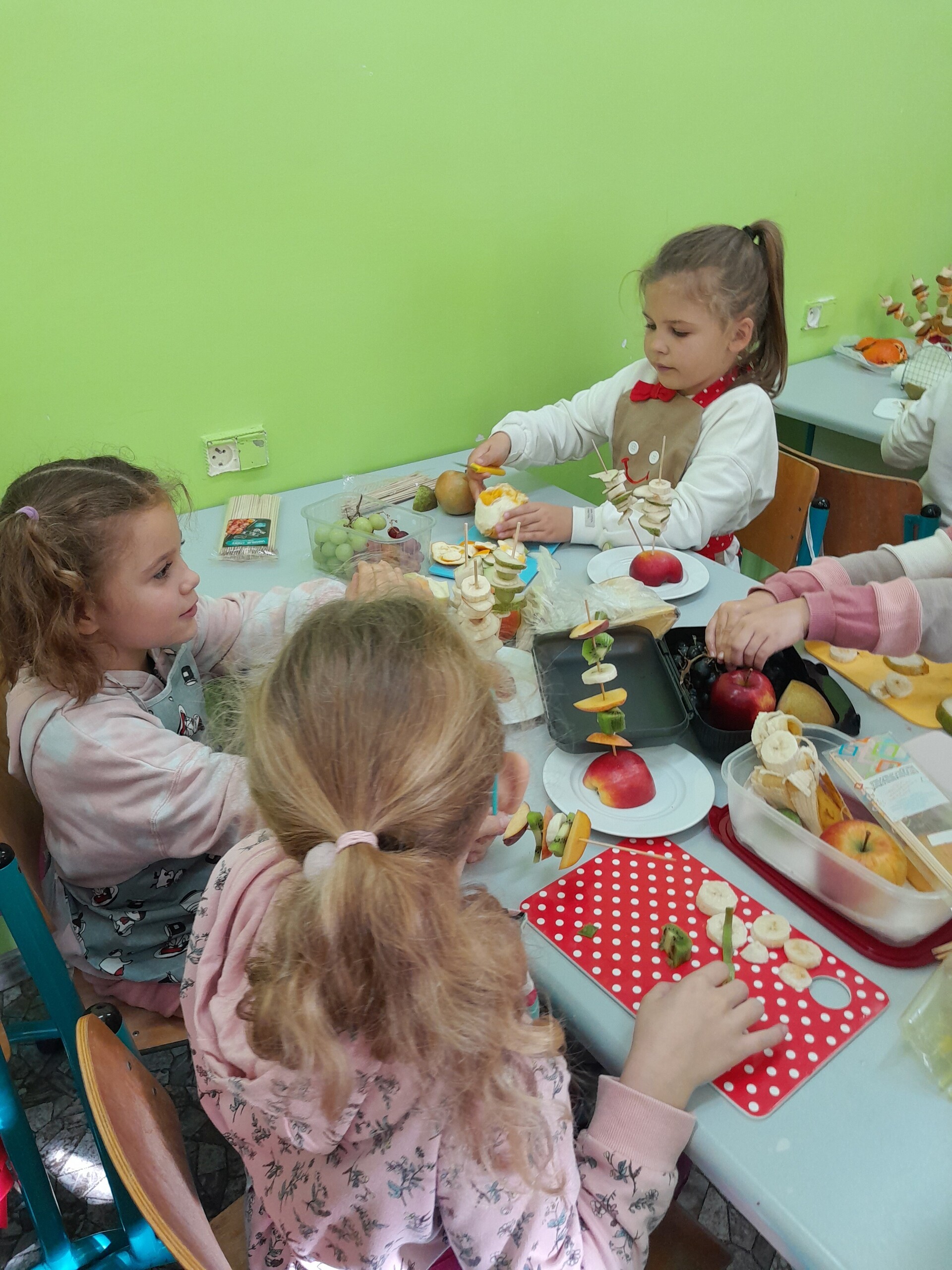 17 października 2022 r., uczniowie klasy pierwszej, w ramach zajęć kulinarnych przygotowali zdrowe i kolorowe danie z owoców. Były to "jeżyki” na jabłkach. Dzieci wspaniale poradziły sobie z krojeniem owoców na kawałki oraz nabijaniem ich na patyczki szaszłykowe. Tak przygotowane owocowe szaszłyki były umieszczane na połówkach jabłka jako "jeżykowe kolce”. Wyglądało to bardzo apetycznie, no i było i smaczne i bardzo zdrowe.