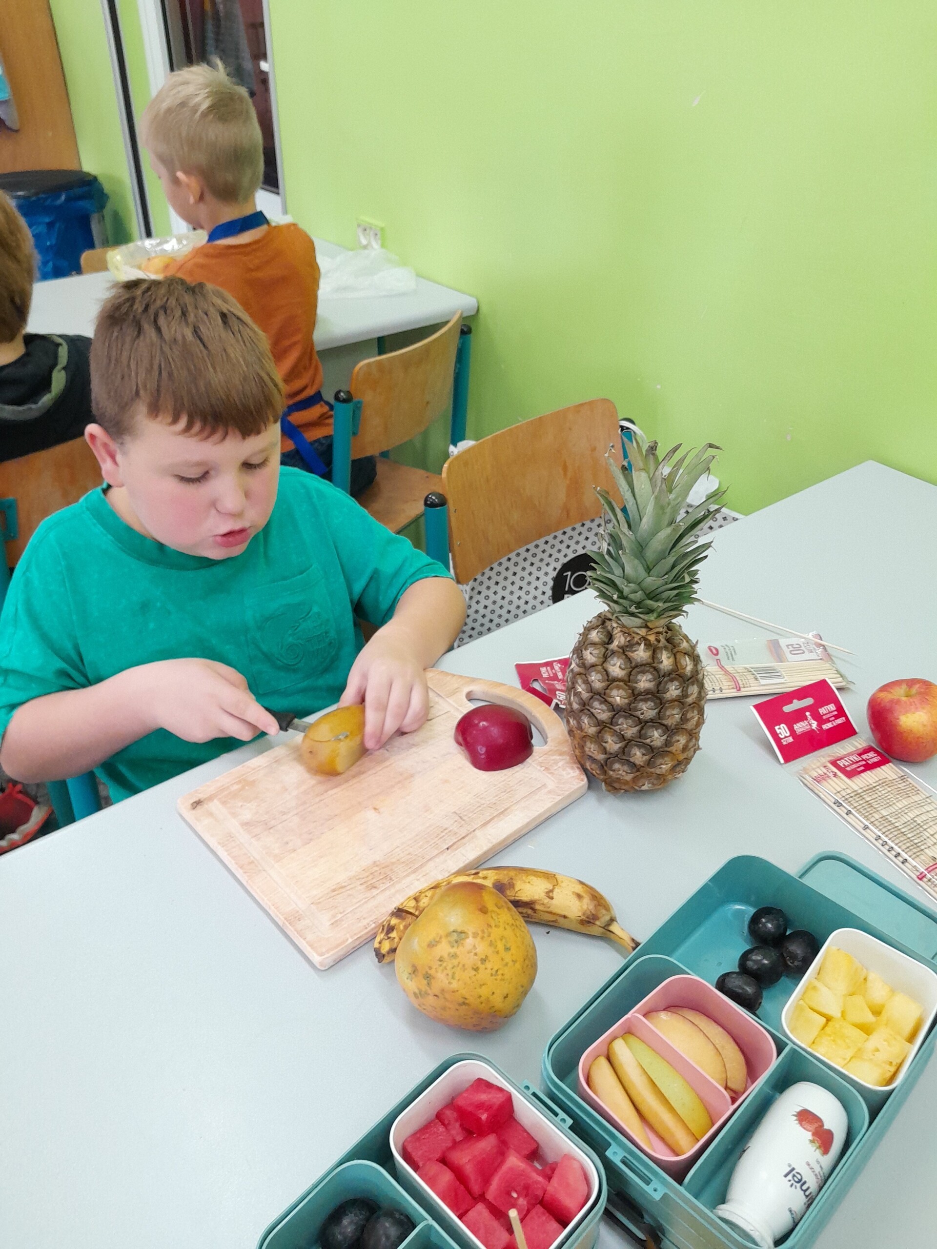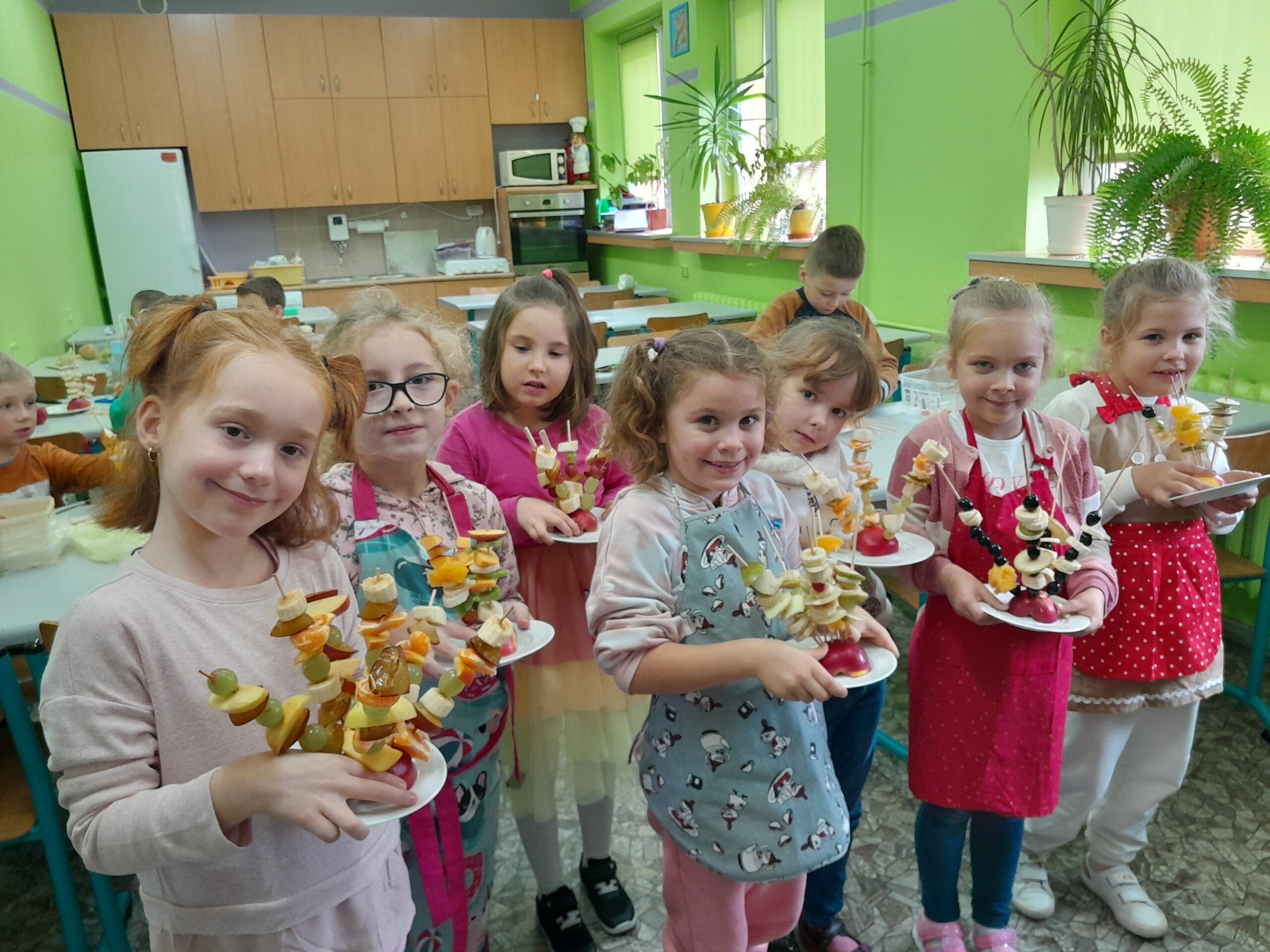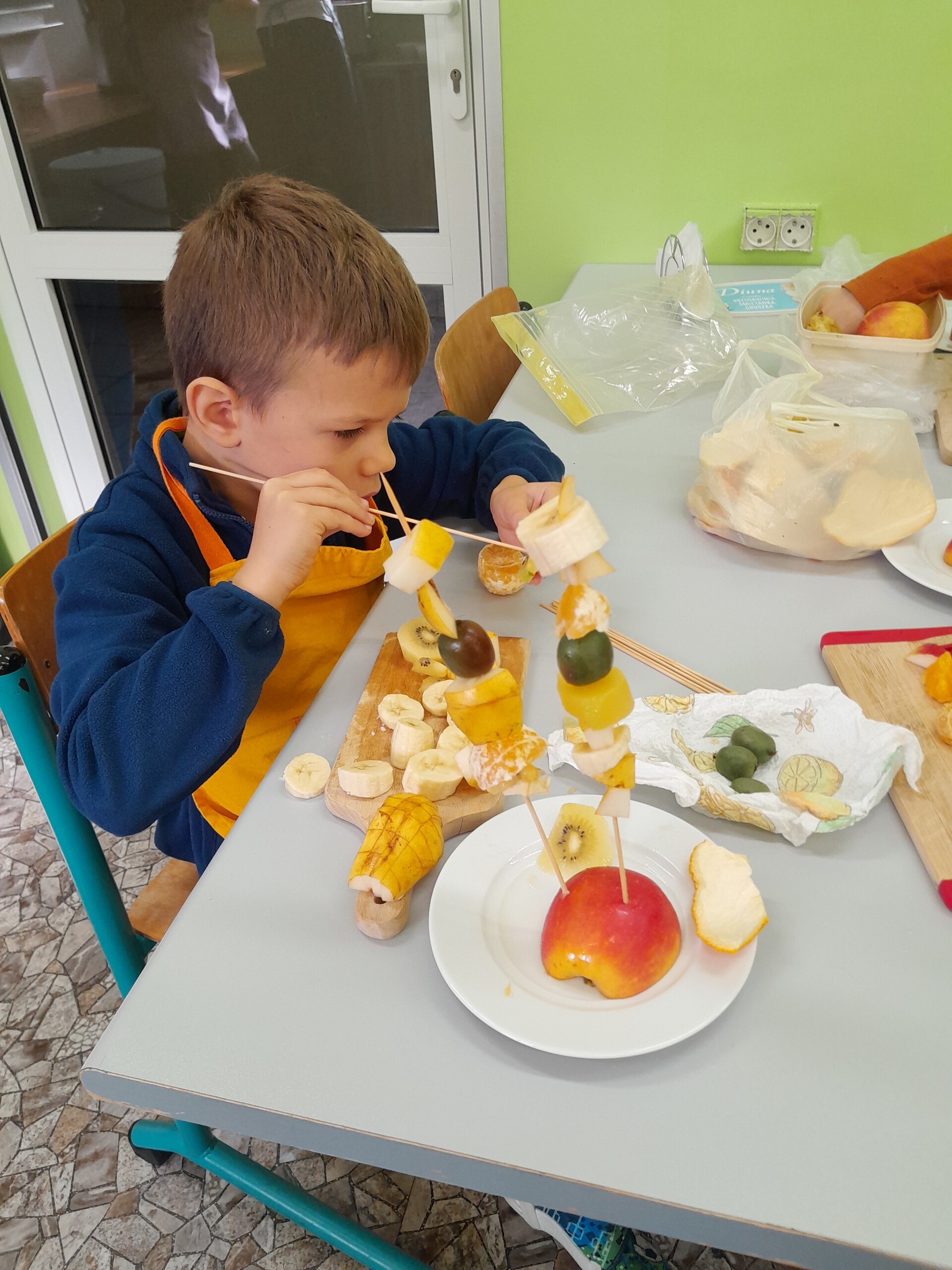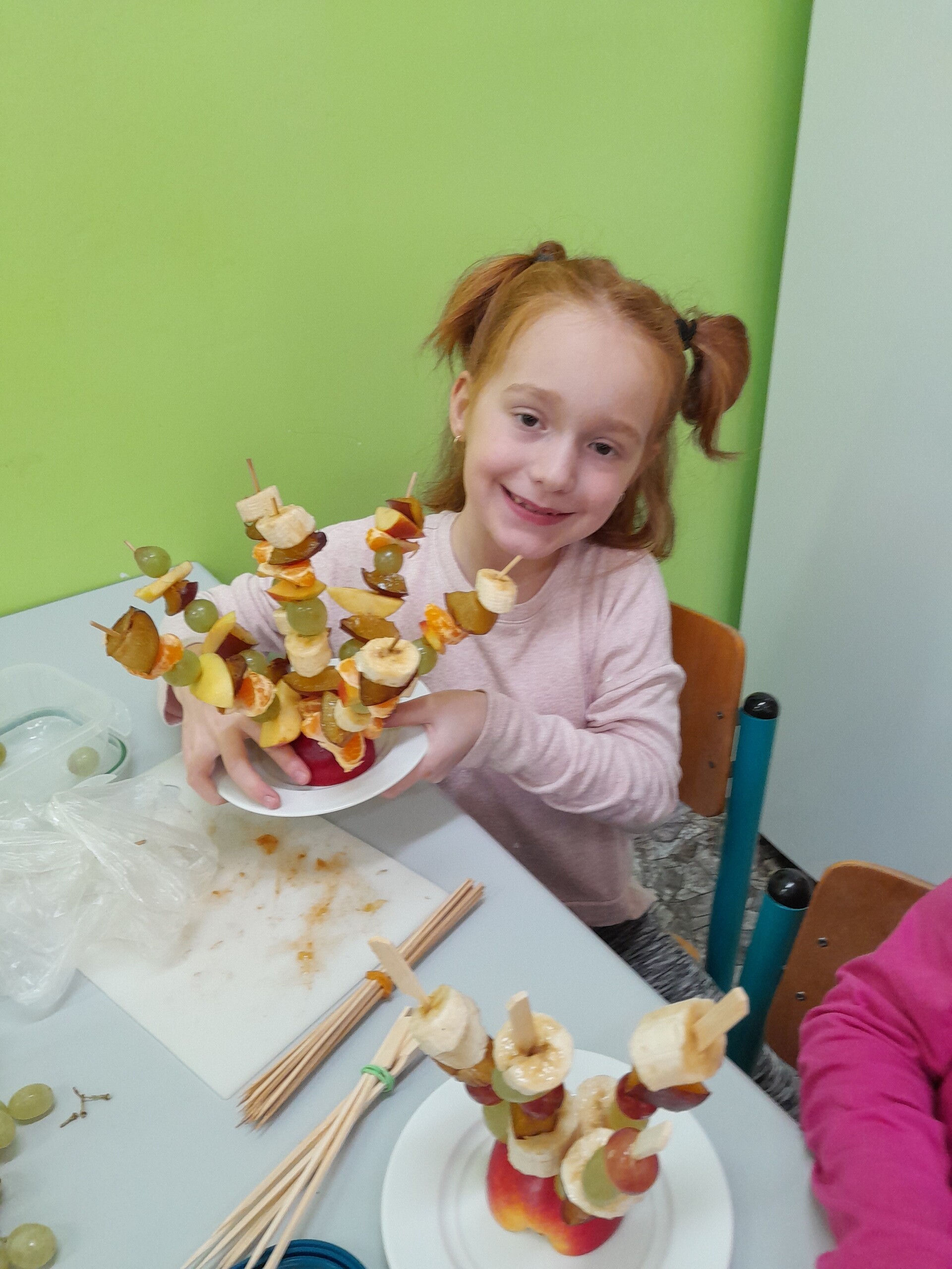 17 października 2022 r., uczniowie klasy pierwszej, w ramach zajęć kulinarnych przygotowali zdrowe i kolorowe danie z owoców. Były to "jeżyki” na jabłkach. Dzieci wspaniale poradziły sobie z krojeniem owoców na kawałki oraz nabijaniem ich na patyczki szaszłykowe. Tak przygotowane owocowe szaszłyki były umieszczane na połówkach jabłka jako "jeżykowe kolce”. Wyglądało to bardzo apetycznie, no i było i smaczne i bardzo zdrowe.