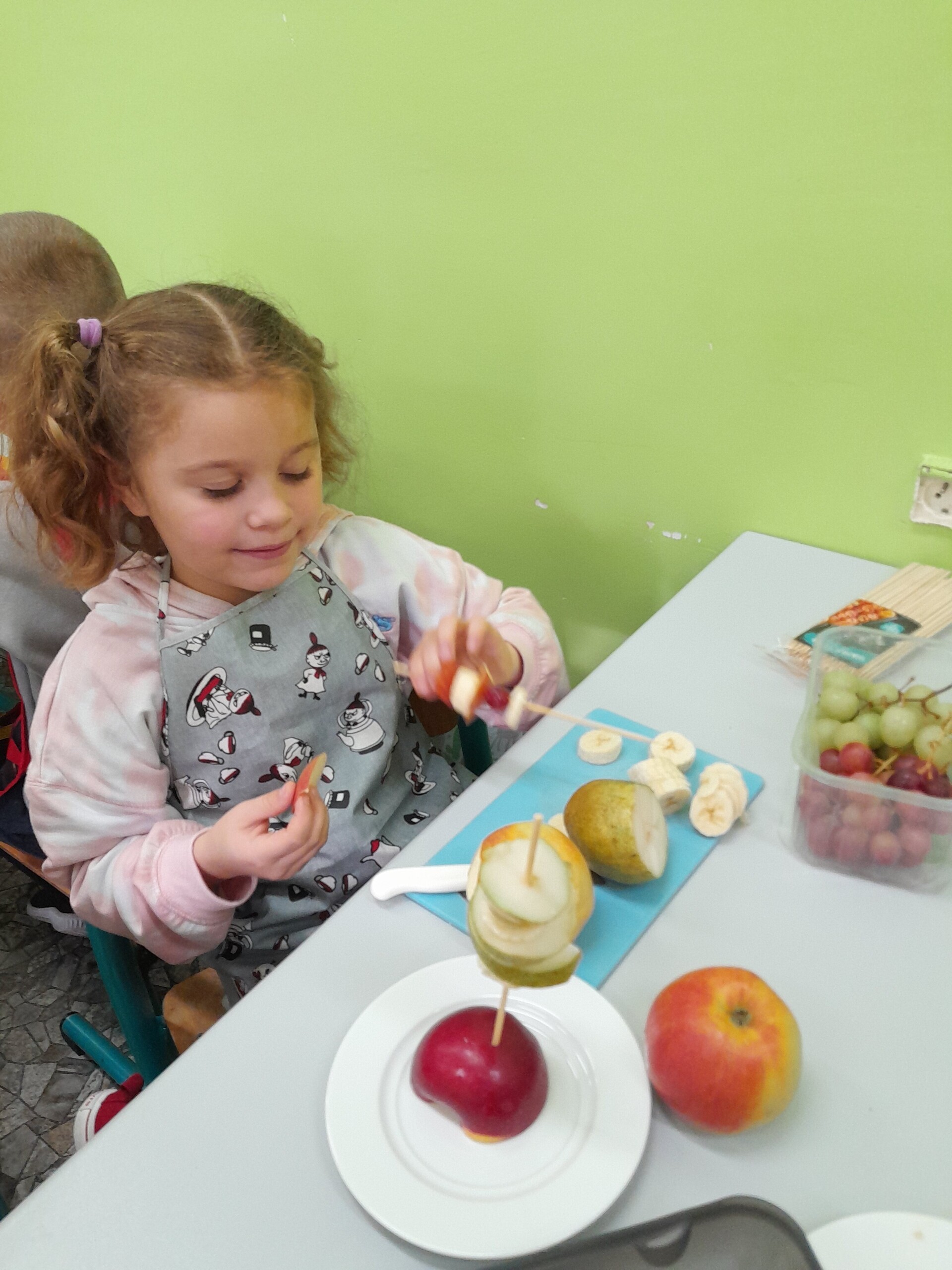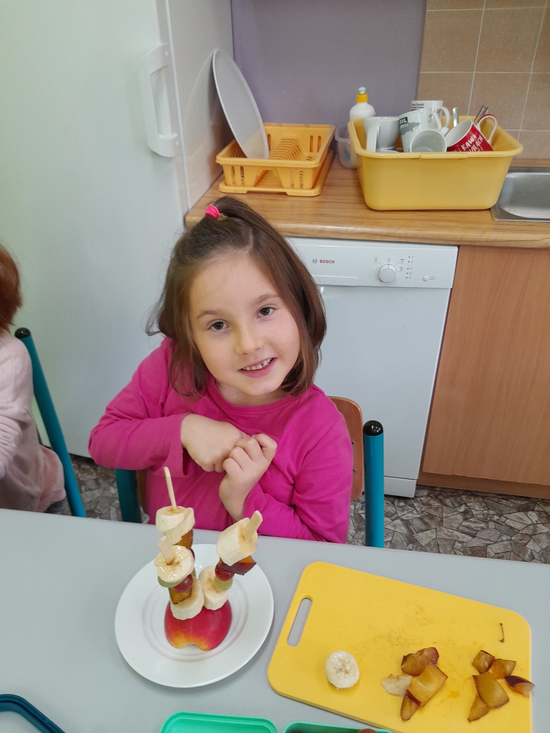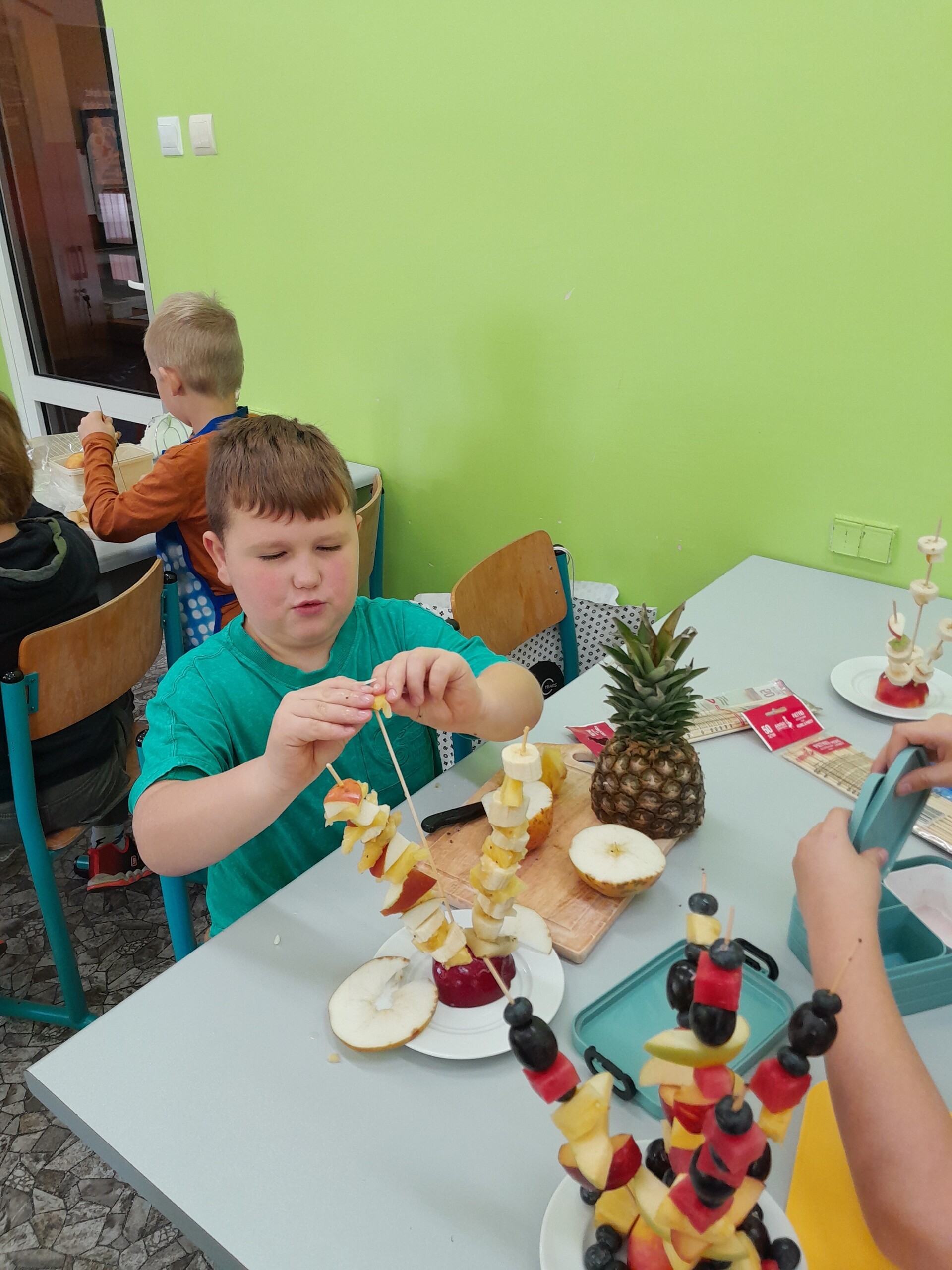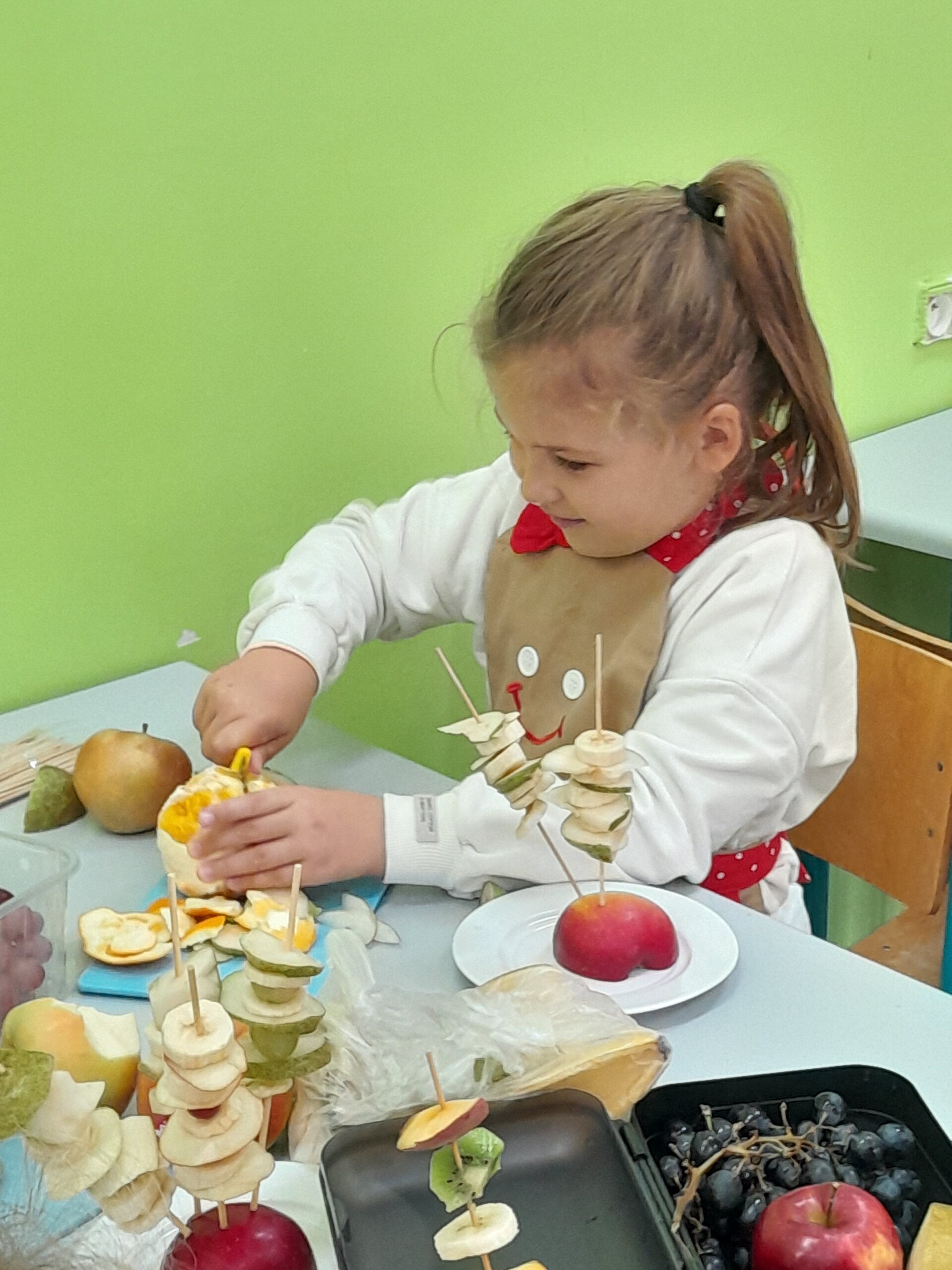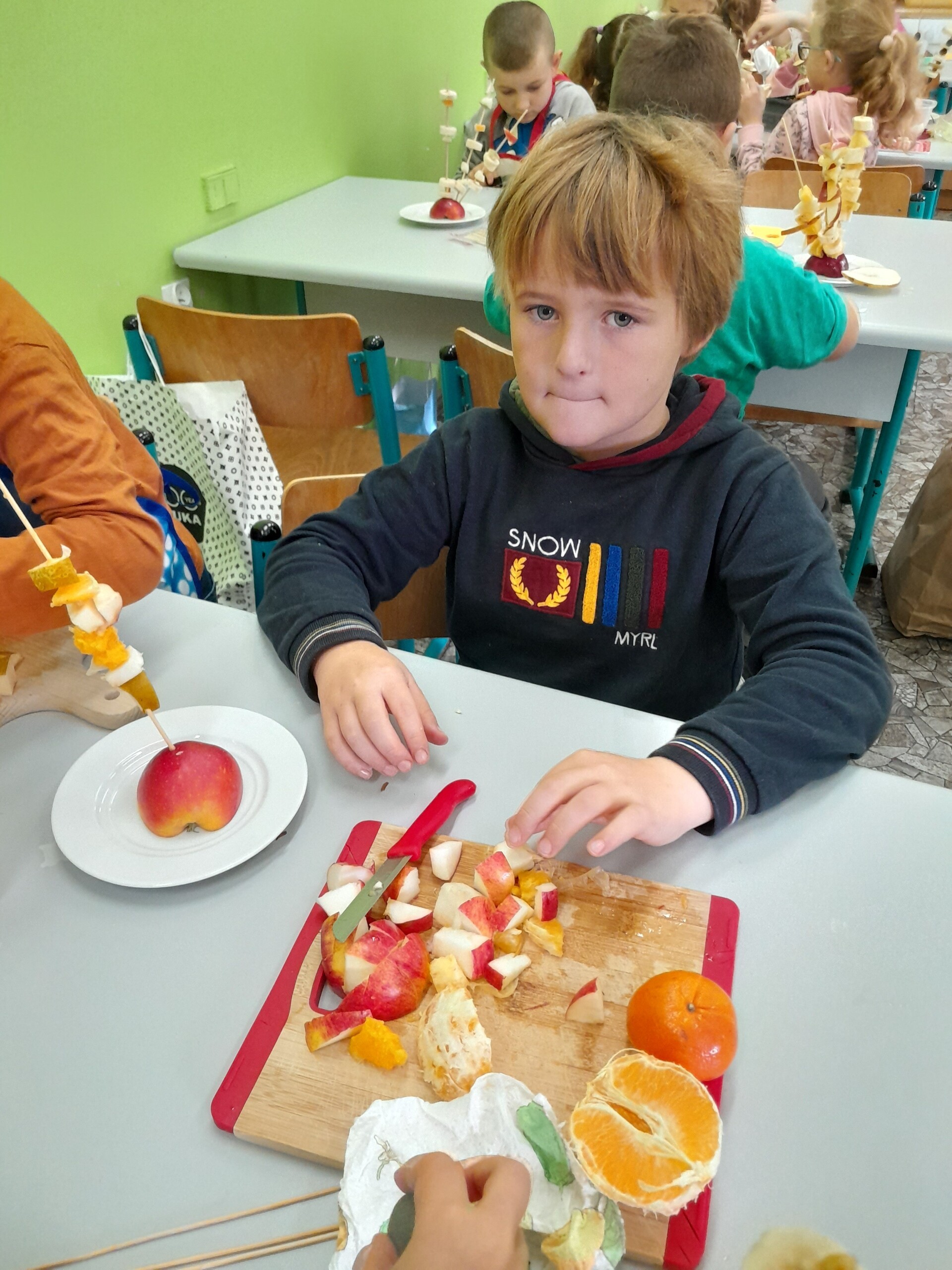 17 października 2022 r., uczniowie klasy pierwszej, w ramach zajęć kulinarnych przygotowali zdrowe i kolorowe danie z owoców. Były to "jeżyki” na jabłkach. Dzieci wspaniale poradziły sobie z krojeniem owoców na kawałki oraz nabijaniem ich na patyczki szaszłykowe. Tak przygotowane owocowe szaszłyki były umieszczane na połówkach jabłka jako "jeżykowe kolce”. Wyglądało to bardzo apetycznie, no i było i smaczne i bardzo zdrowe.