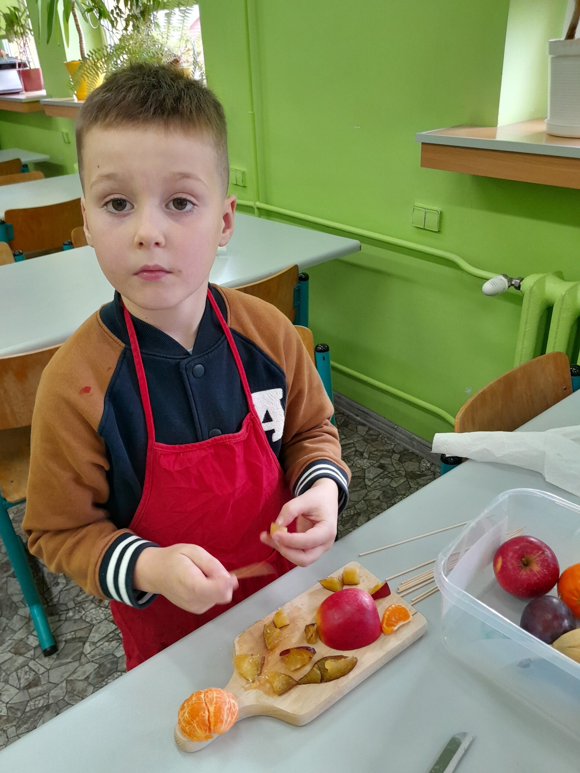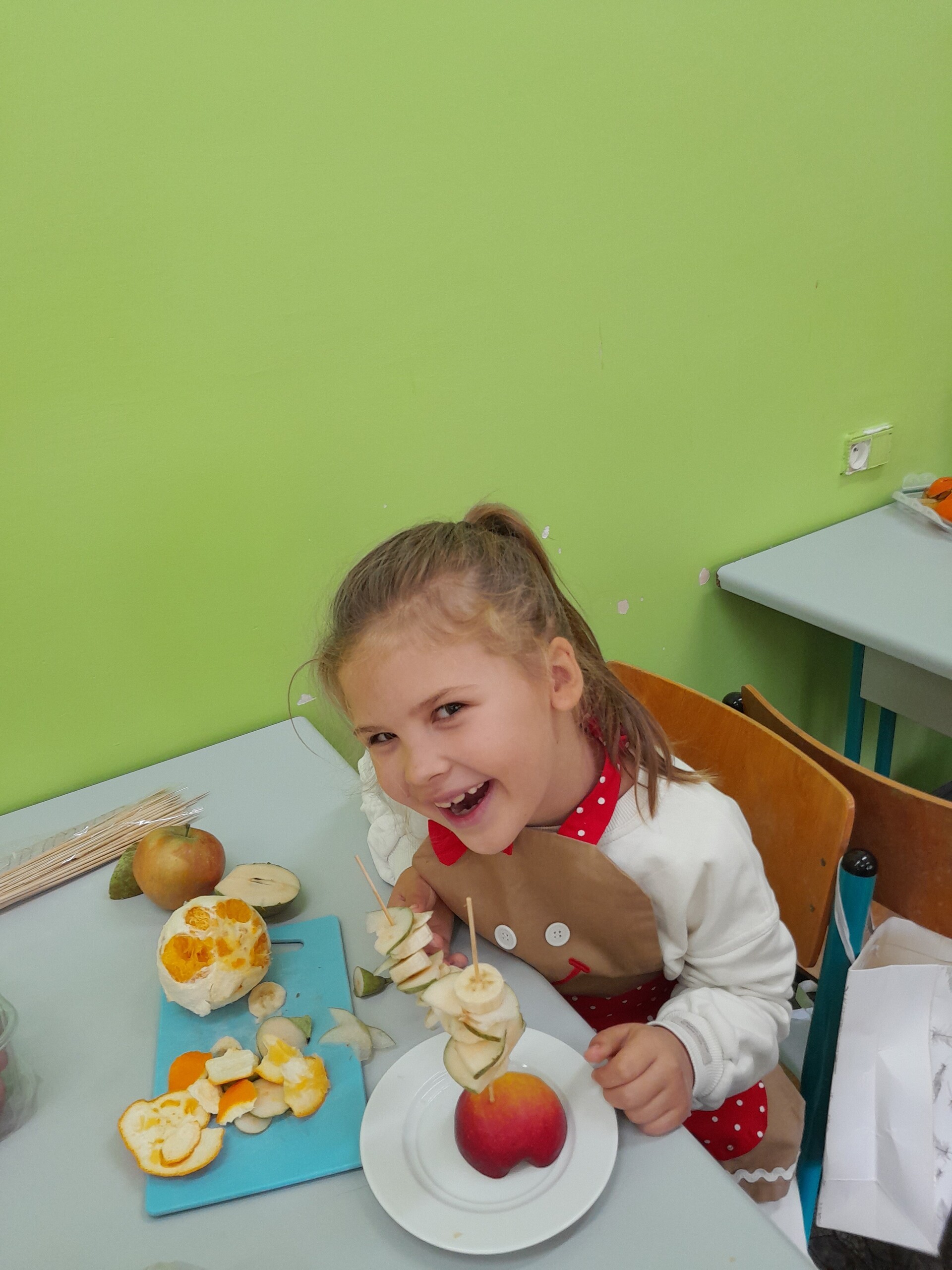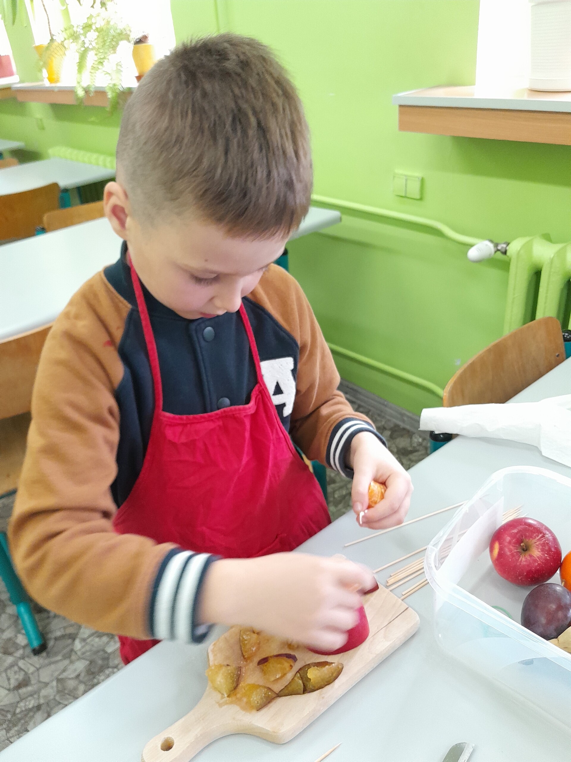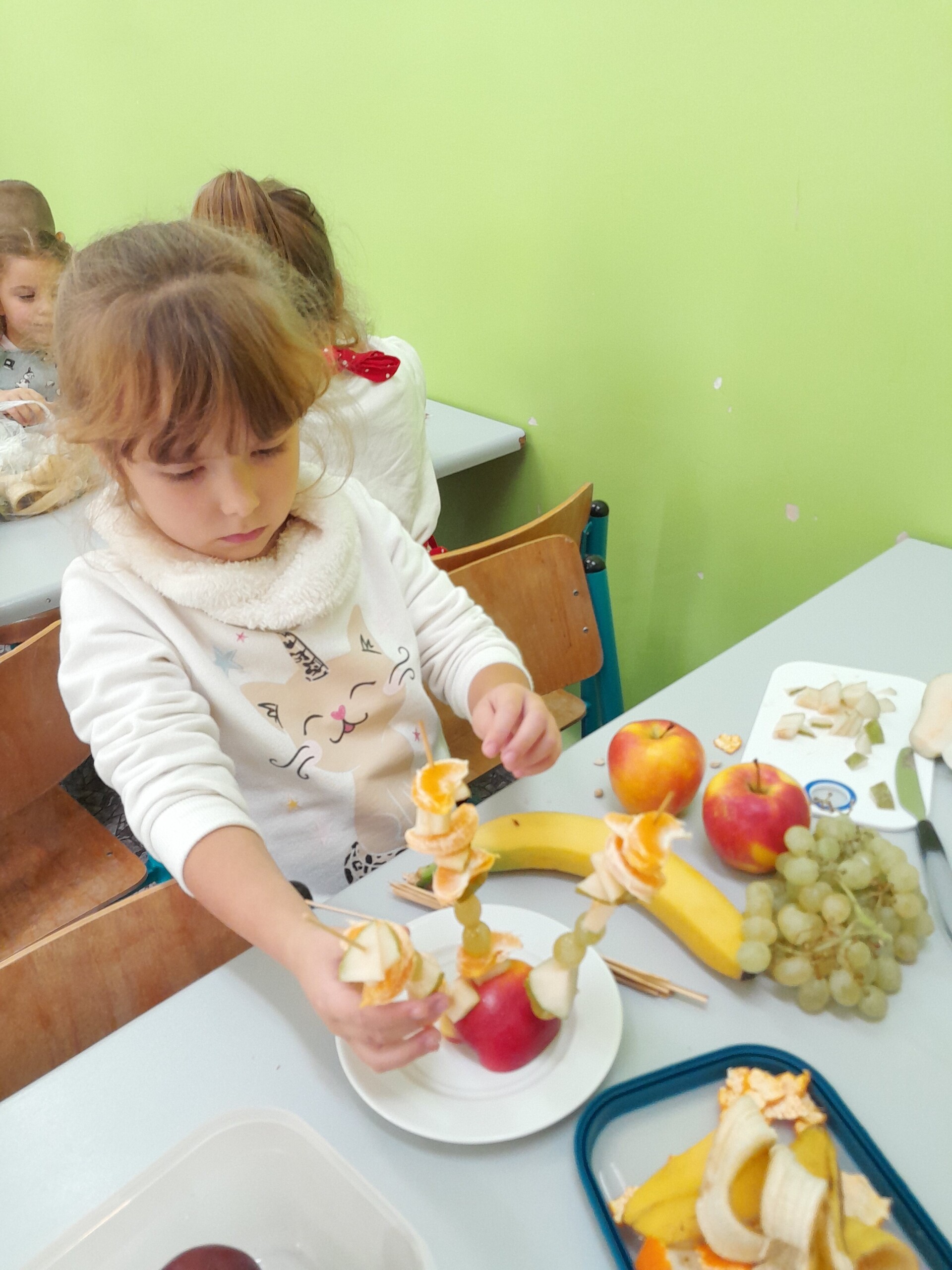 17 października 2022 r., uczniowie klasy pierwszej, w ramach zajęć kulinarnych przygotowali zdrowe i kolorowe danie z owoców. Były to "jeżyki” na jabłkach. Dzieci wspaniale poradziły sobie z krojeniem owoców na kawałki oraz nabijaniem ich na patyczki szaszłykowe. Tak przygotowane owocowe szaszłyki były umieszczane na połówkach jabłka jako "jeżykowe kolce”. Wyglądało to bardzo apetycznie, no i było i smaczne i bardzo zdrowe.