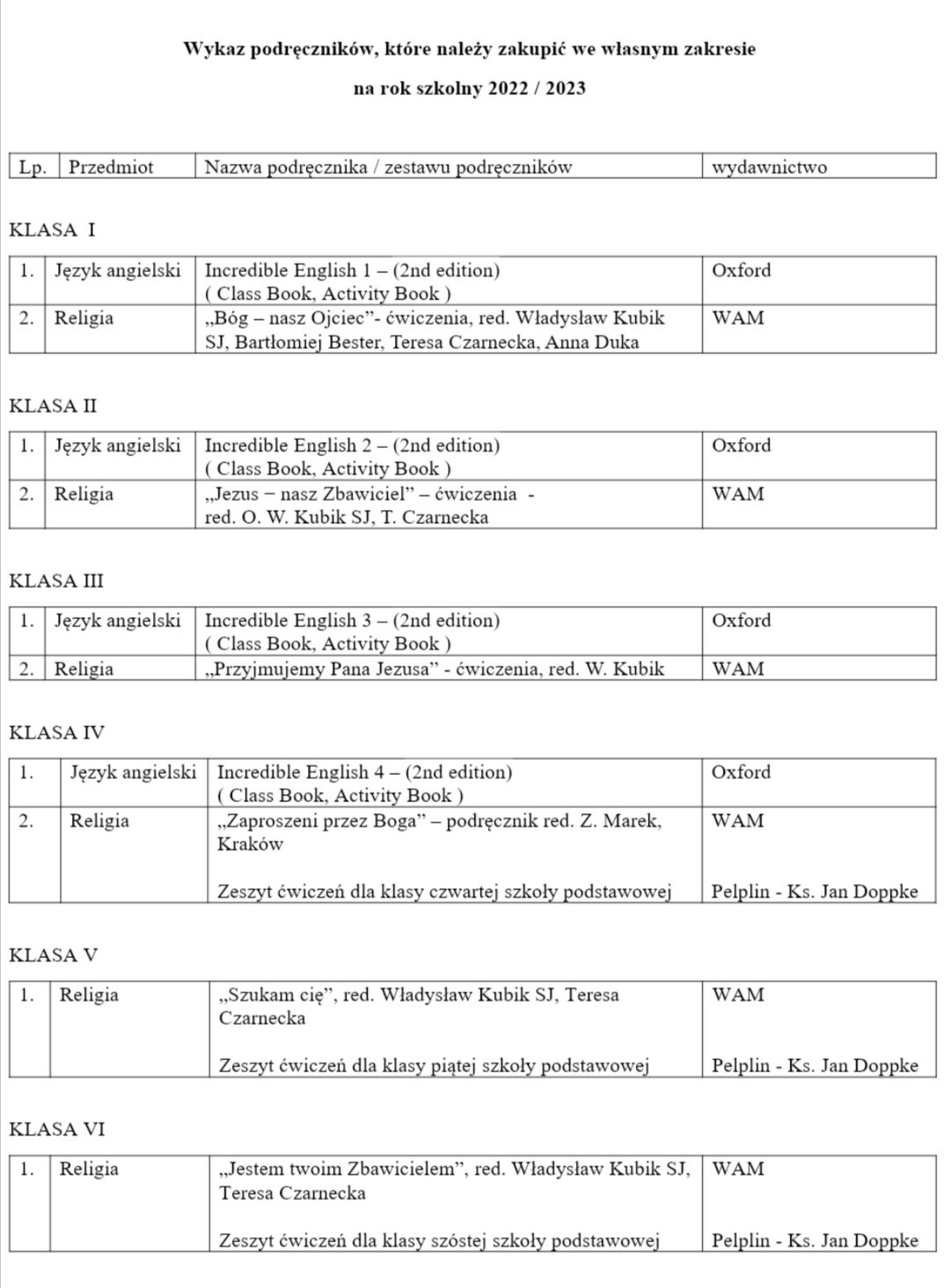 Wykaz podręczników do zakupienia na rok szkolny 2022/23