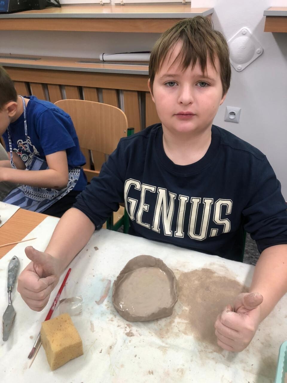 ,,Poczuj glnę" to warsztaty, w których na początku marca uczestniczyli uczniowie klasy drugiej. Istotą tej formy arteterapii jest uświadomienie dzieci jak istotny dla naszego funkcjonowania jest zmysł dotyku..Poczucie gliny oznacza przede wszystkim korelację dotyku z miękkim,plastycznym materiałem, który pod wpływem naszych emocji formułuje się w kształt.