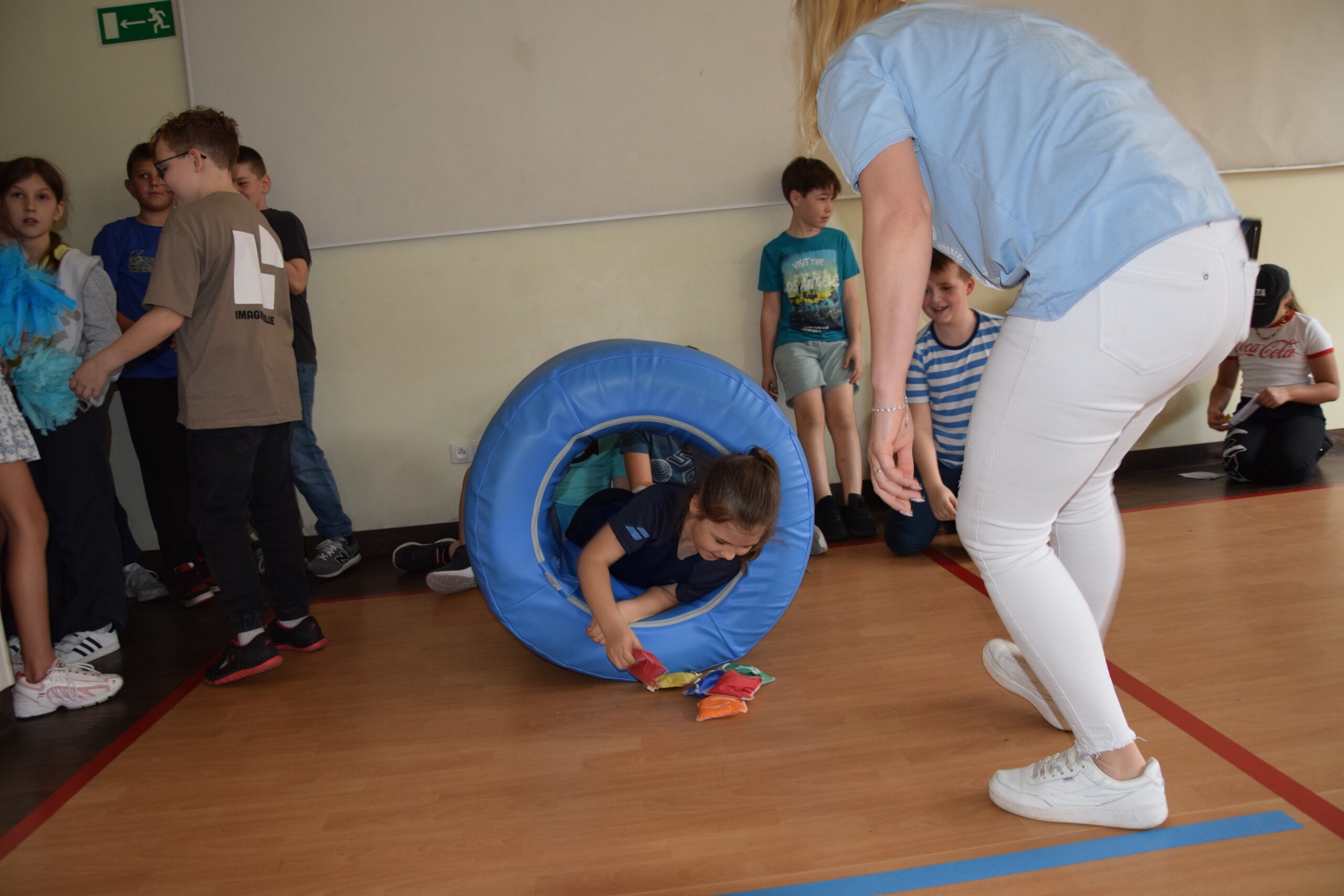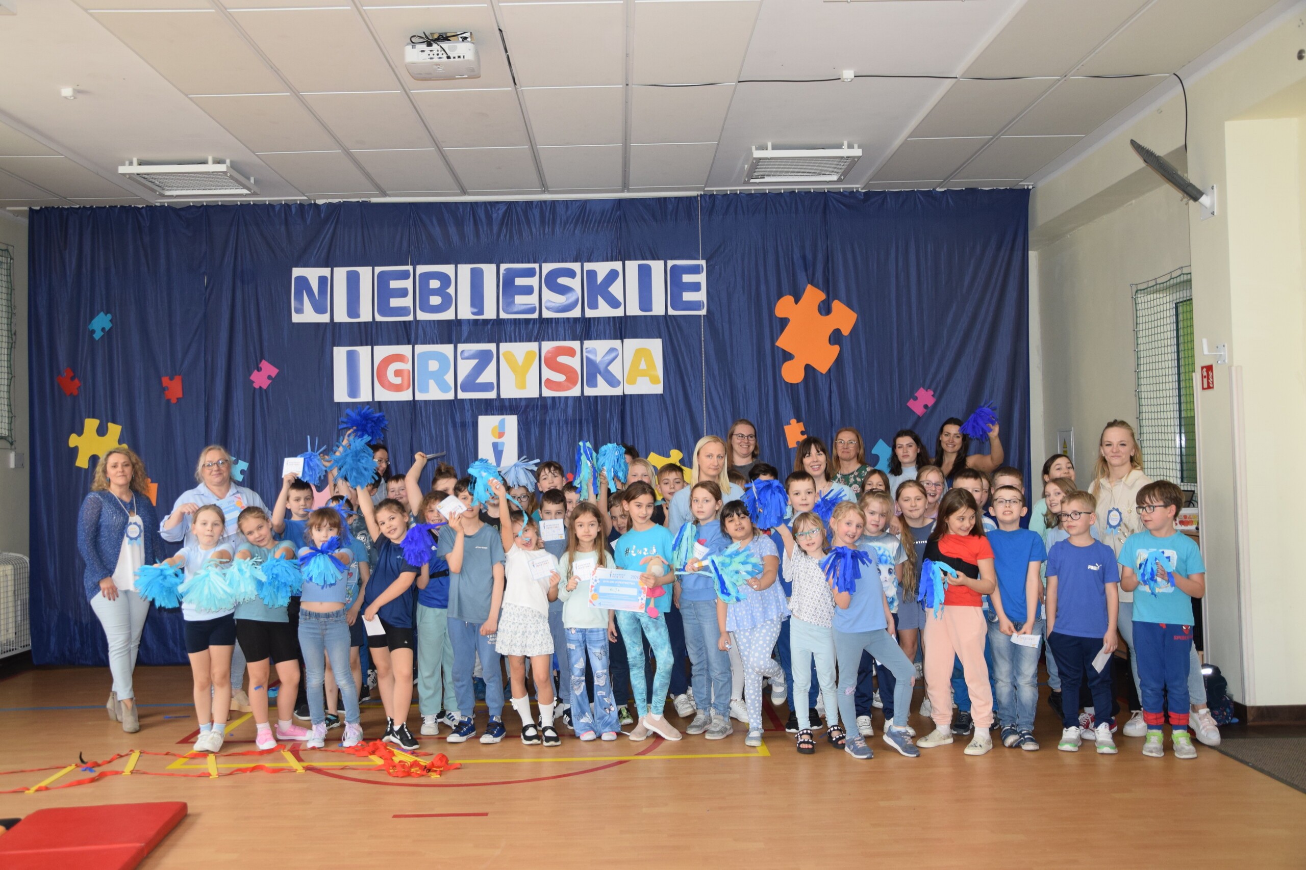 Podsumowaniem działań dotyczących Świadmości Autyzmu były organizowane po raz pierwszy w naszej szkole dla uczniów klas 1-3 „Niebieskie Igrzyska”. Stacje zadań były tak opracowane, by nie tylko wzbudzać rywalizację sportową, ale przede wszystkim stworzyć dzieciom możliwość wspólnej zabawy i bycia ze sobą. Zmaganiom sportowym towarzyszł śpiewany z radością hymn igrzysk.