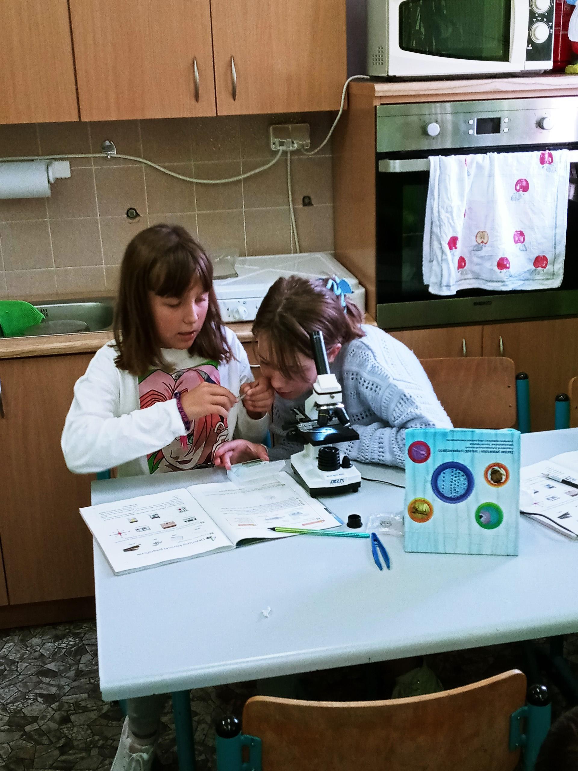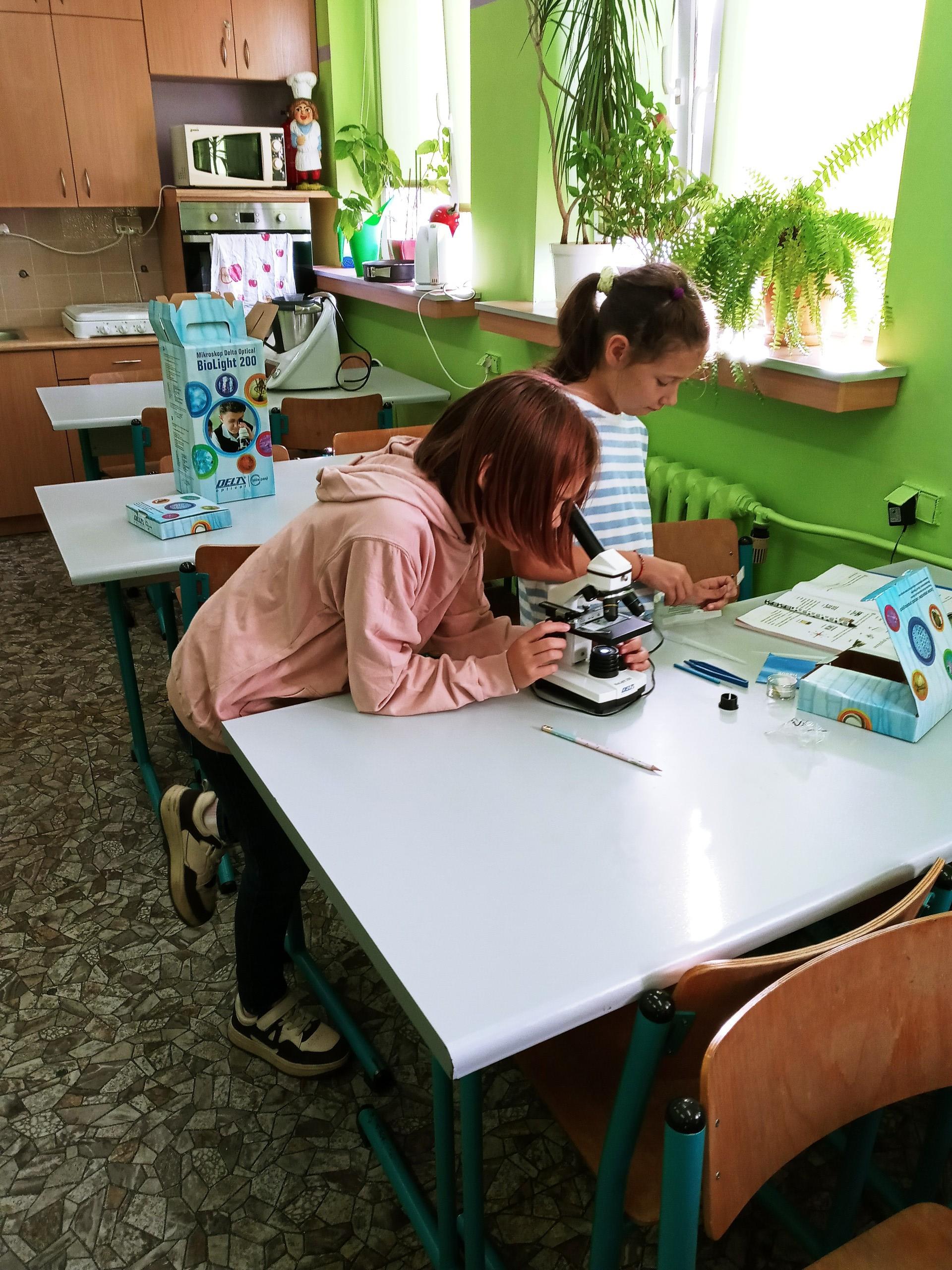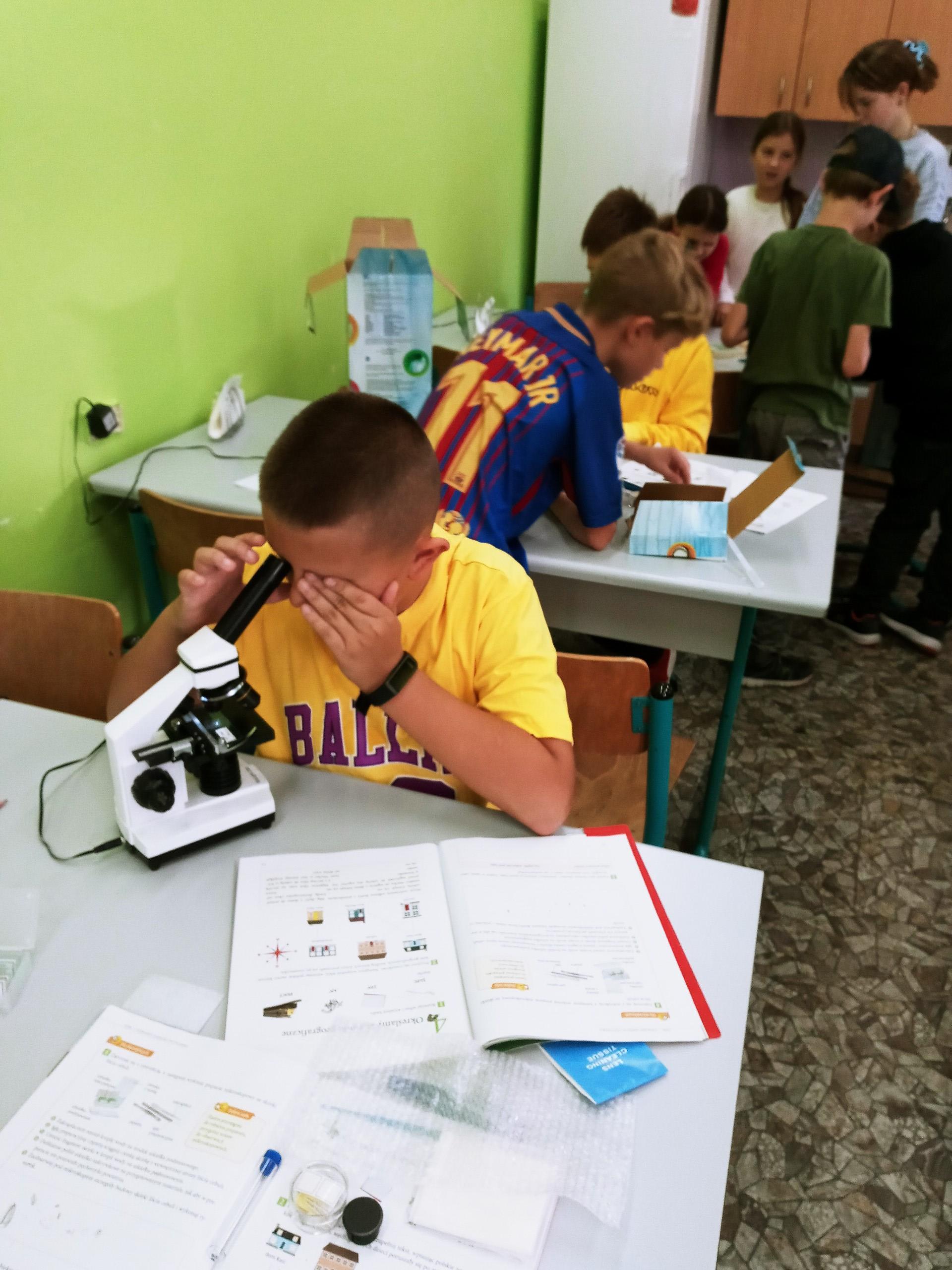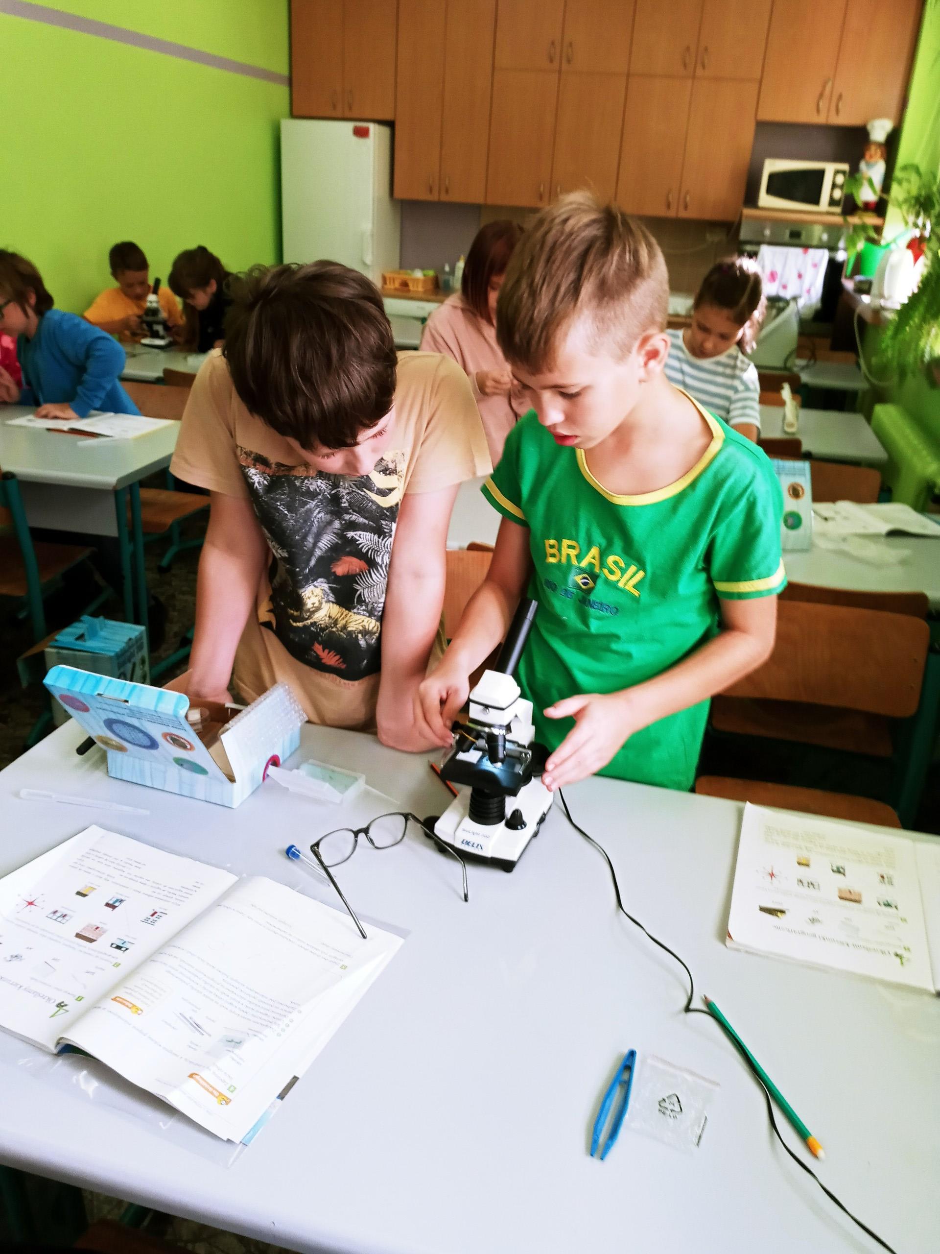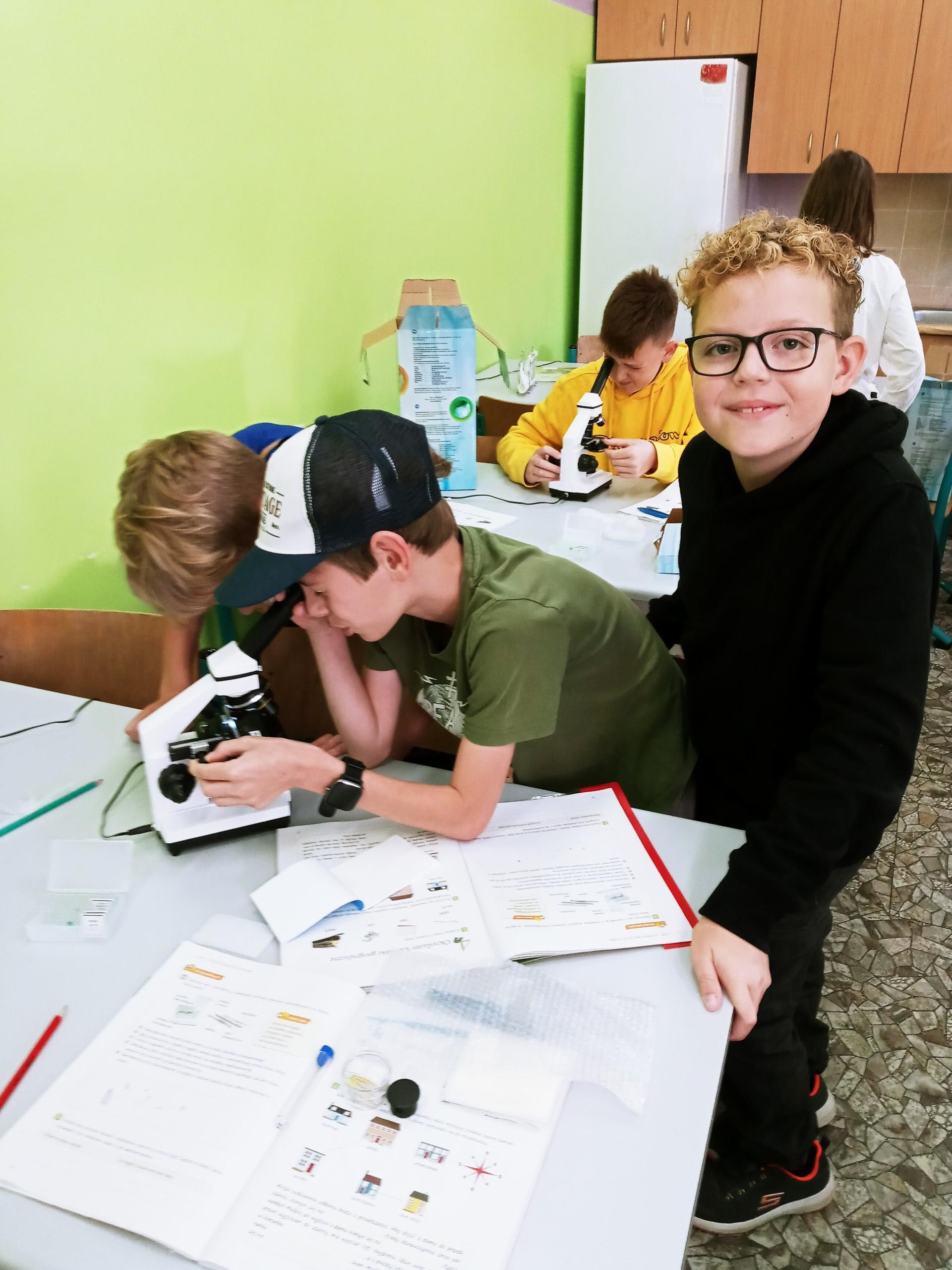 Uczniowie klas czwartych na lekcjach przyrody poznawali budowę i działanie mikroskopu. Dowiedzieli się jak nazywają się i do czego służą poszczególne jego części. Samodzielnie wykonywali preparaty mikroskopowe ze skórki pomidora, które potem umieszczali na stoliku mikroskopowym, oglądali, omawiali i wykonywali szkic tego co zaobserwowali. Ich zadaniem było ustawienie odpowiedniego obiektywu i ustawienie właściwej ostrości, tak aby oglądany preparat był dobrze widoczny. Następnie mogli obserwować inne gotowe preparaty roślinne i zwierzęce.