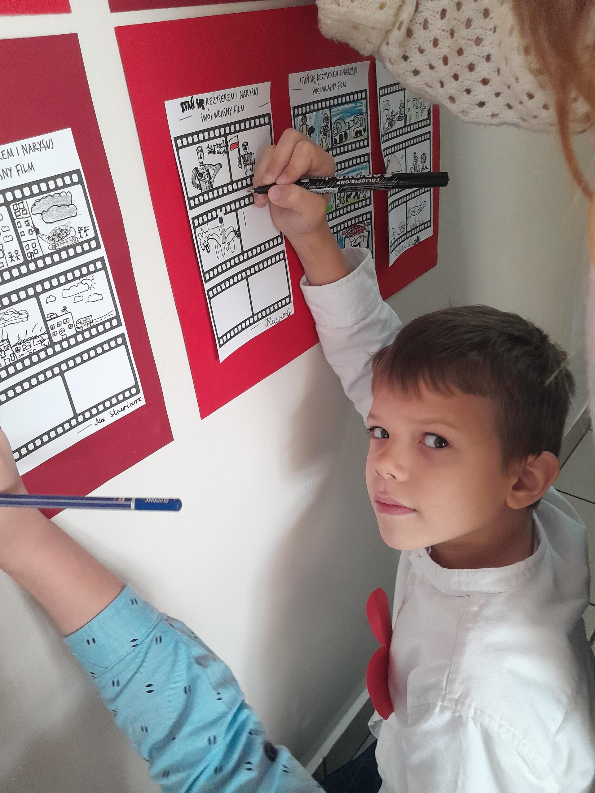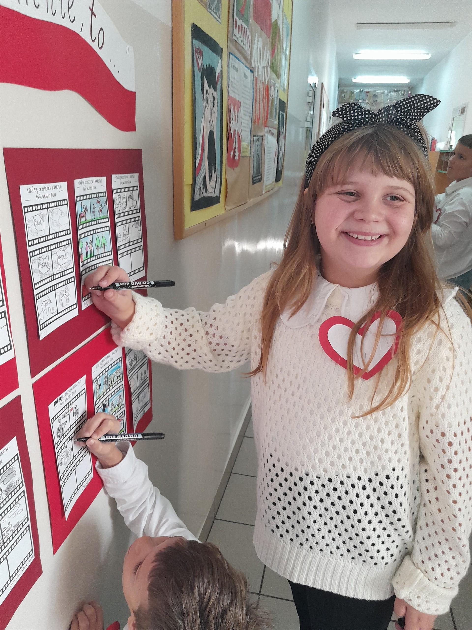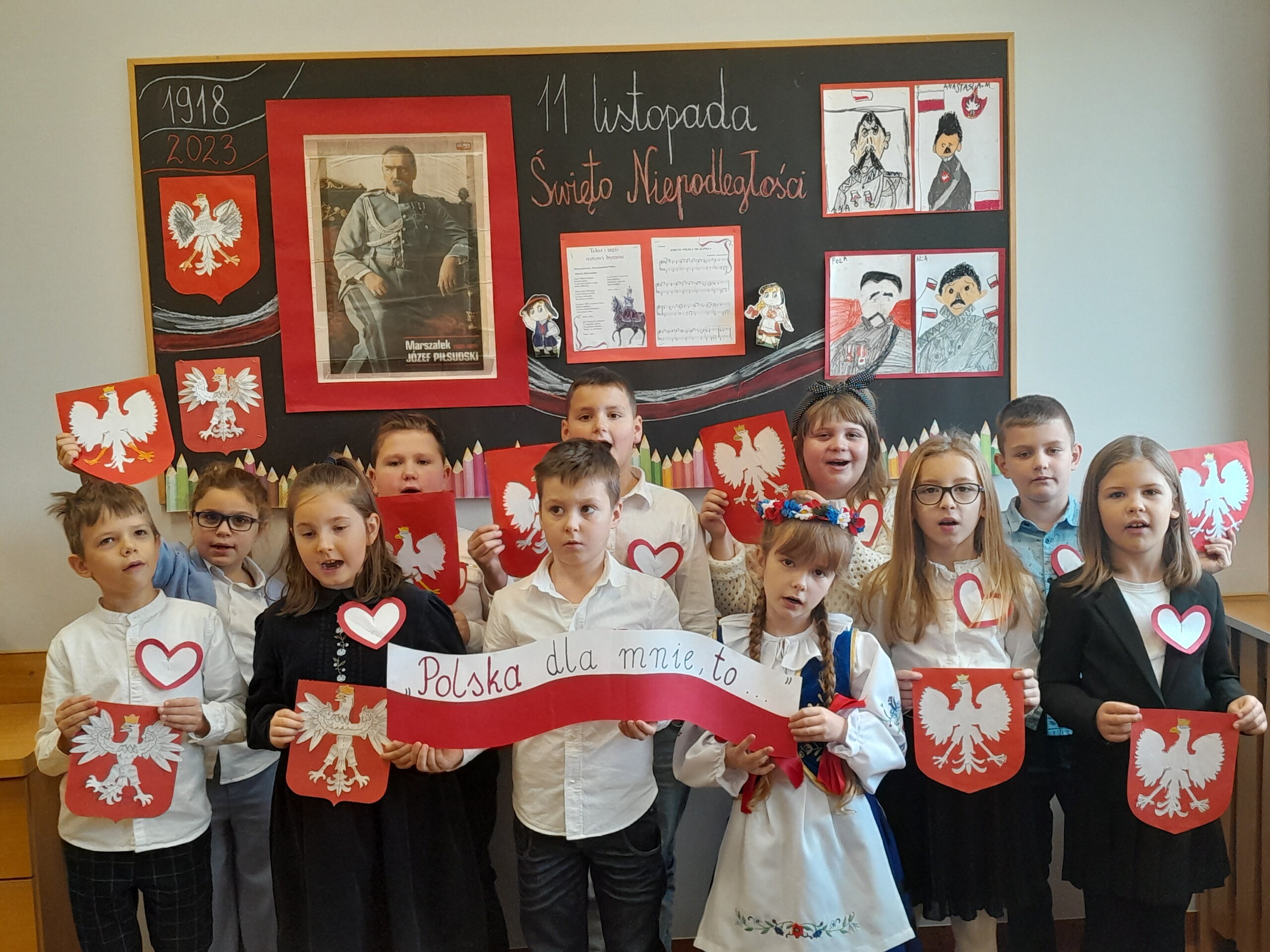 Klasa druga, w związku ze zbliżającym się w tym tygodniu Świętem Niepodległości, omawiała tematy dotyczące Polski,symboli narodowych, patriotyzmu i wolności w różnych, ciekawych formach plastycznych.Dzieci wykonały portrety wielkich Polaków, m.in.Józefa Piłsudskiego czy też Fryderyka Chopina oraz narysowały w formie komiksu swój własny film o Polsce.Ich prace zdobią teraz gazetki w klasie i na korytarzu.