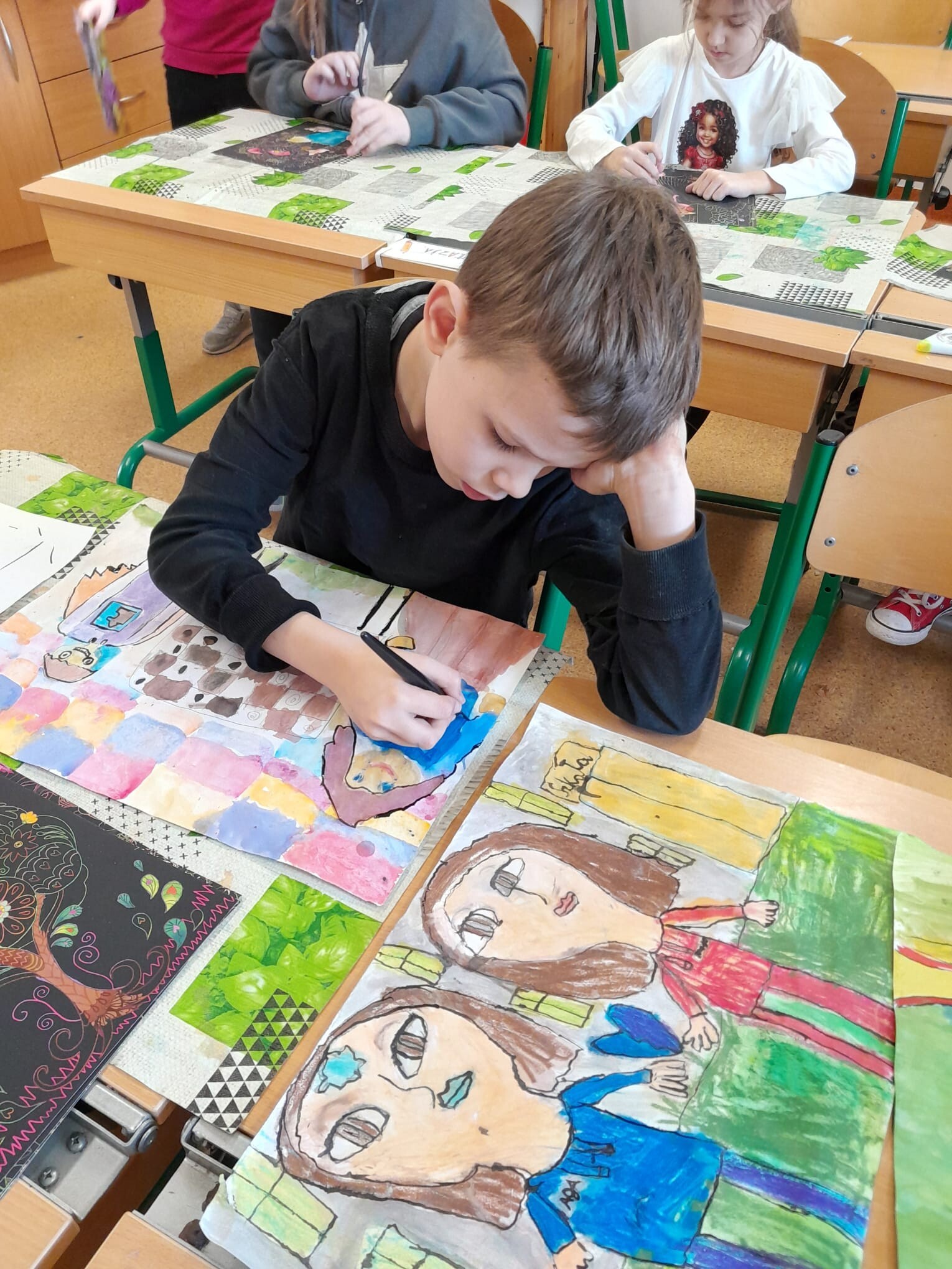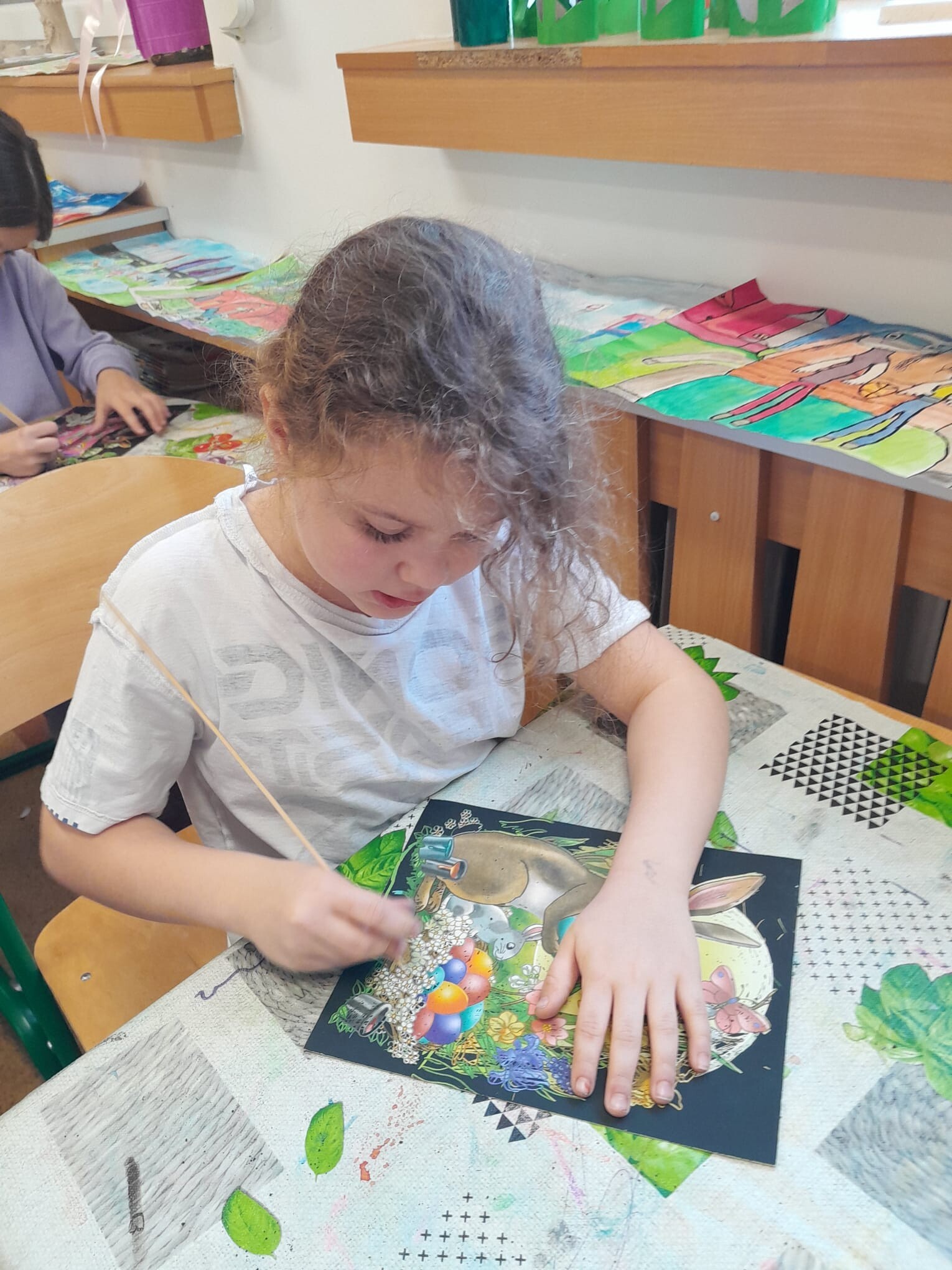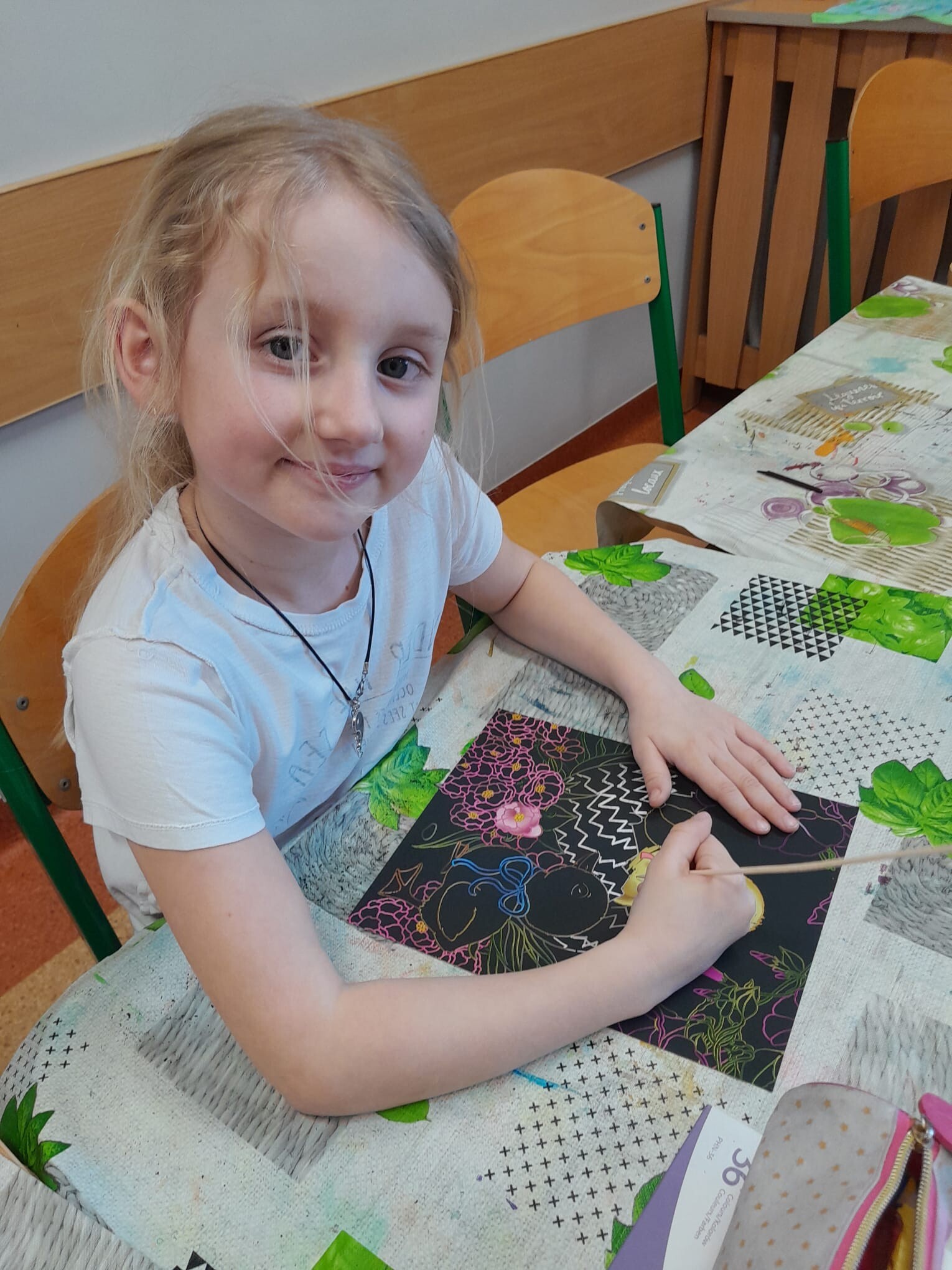 Dzieci z klas I-III na kółku plastycznym przygotowały wyjątkowe prace plastyczne o tematyce wielkanocnej przy zastosowaniu techniki sgraffito, czyli wydrapywanki.